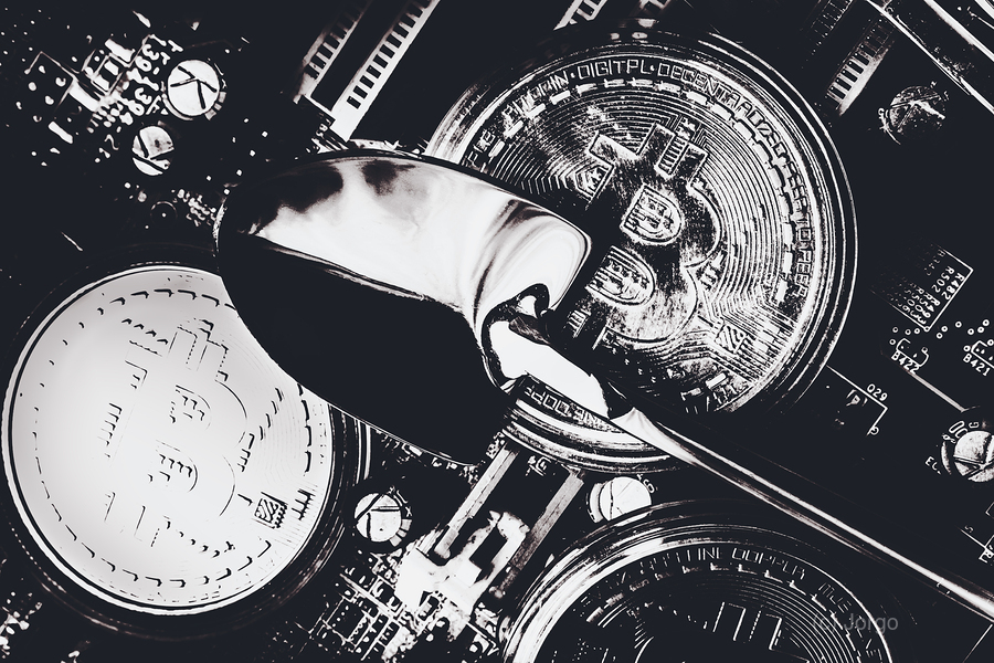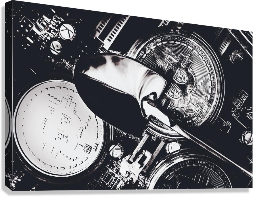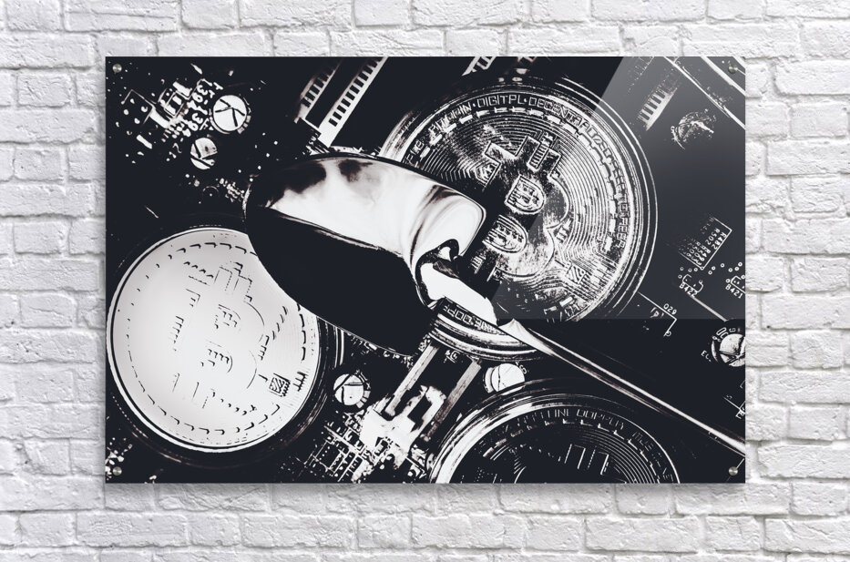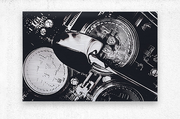 A close-up view shows cryptocurrency coins placed on a circuit board accompanied by a spoon illustrating the connection between technology and digital...[+]
