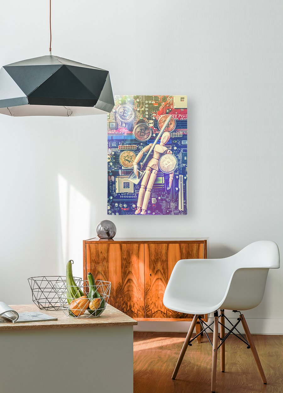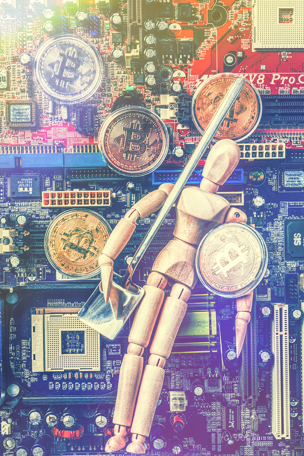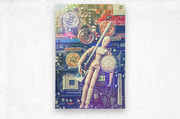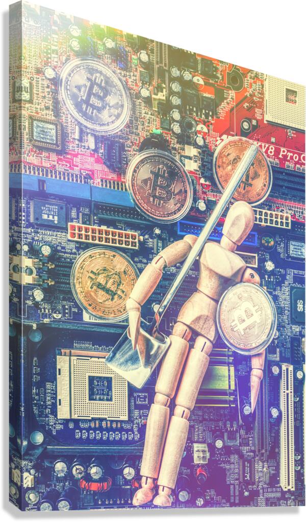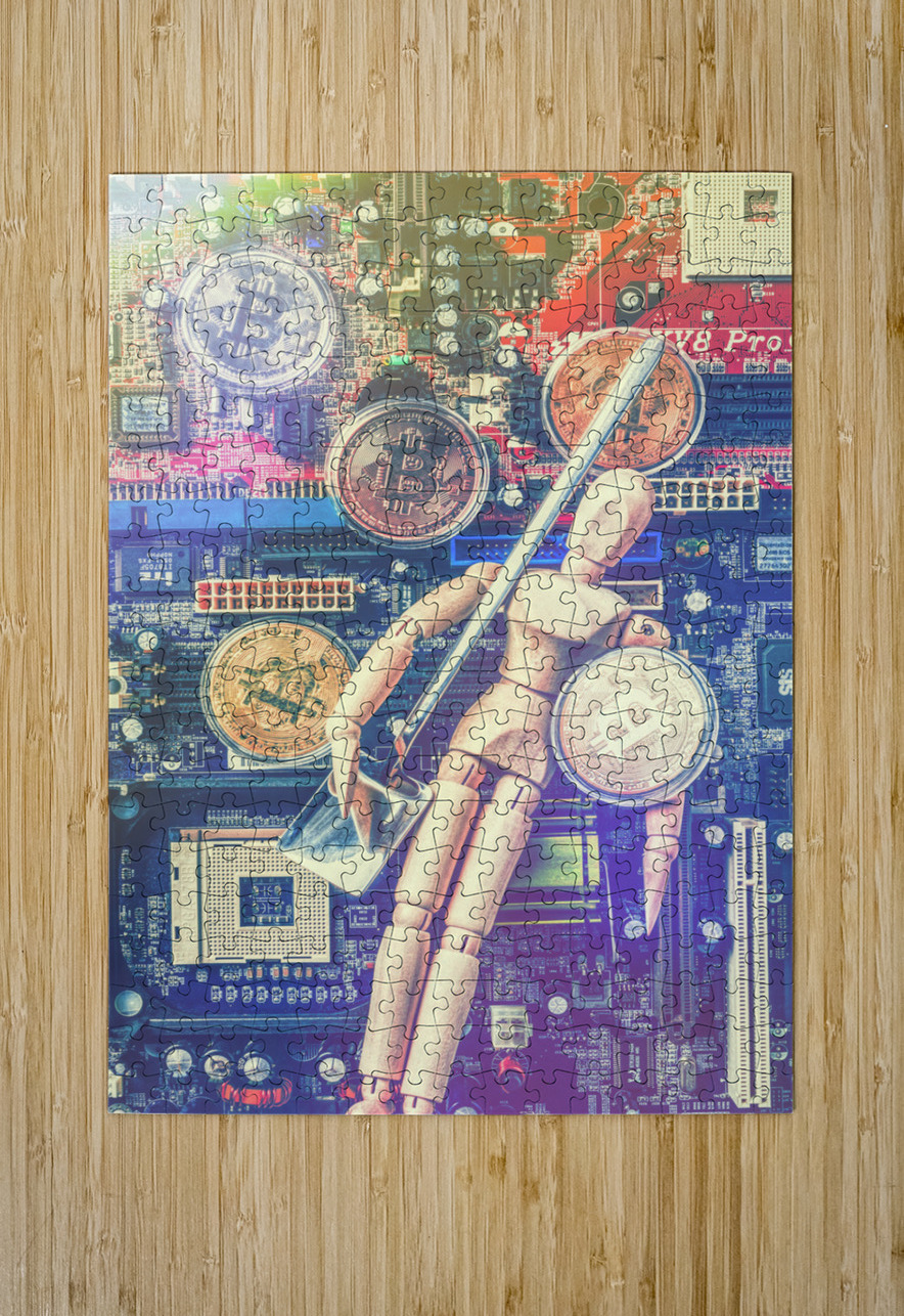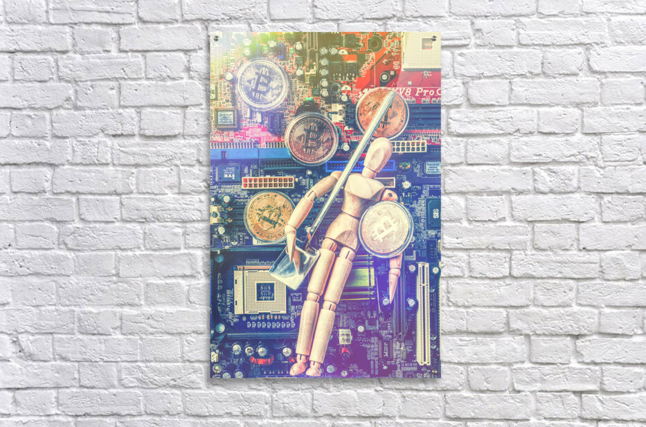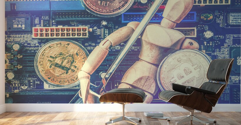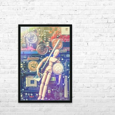 Creative photograph on a mannequin making coin while validating bitcoin blocks with difficulty ease