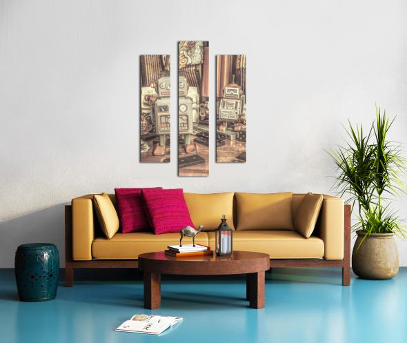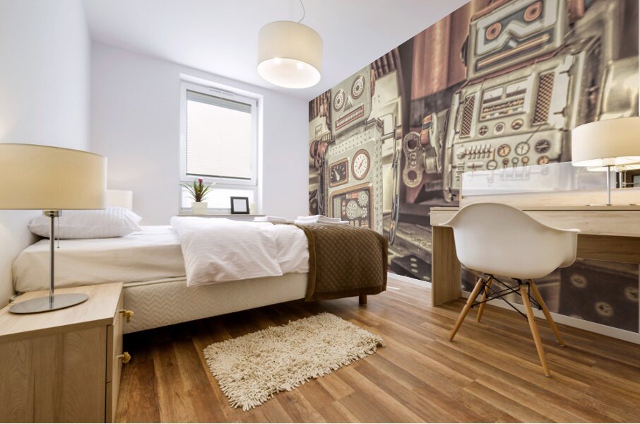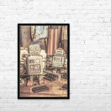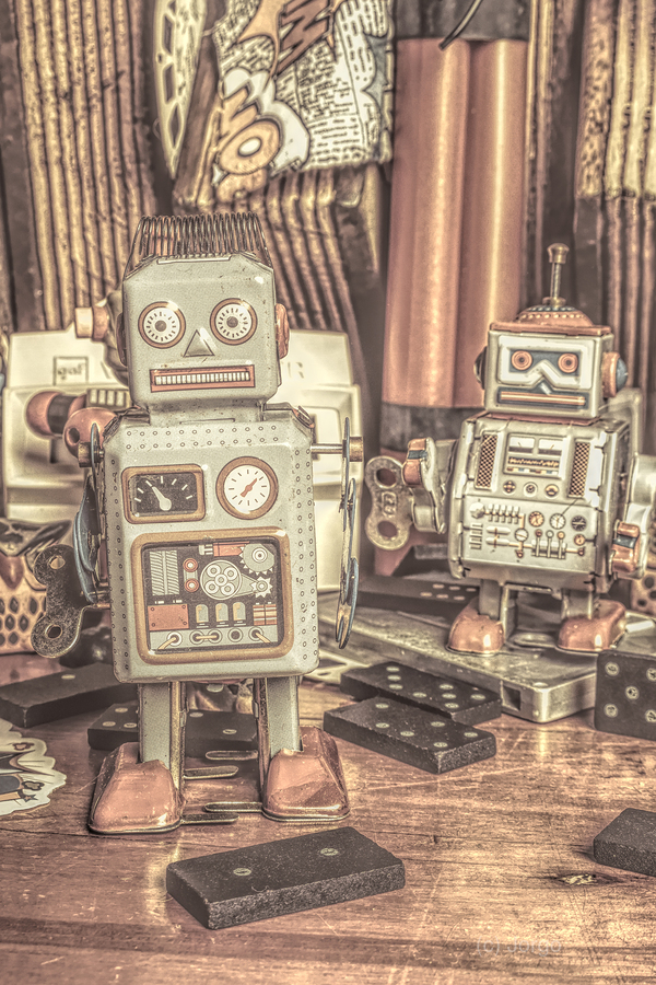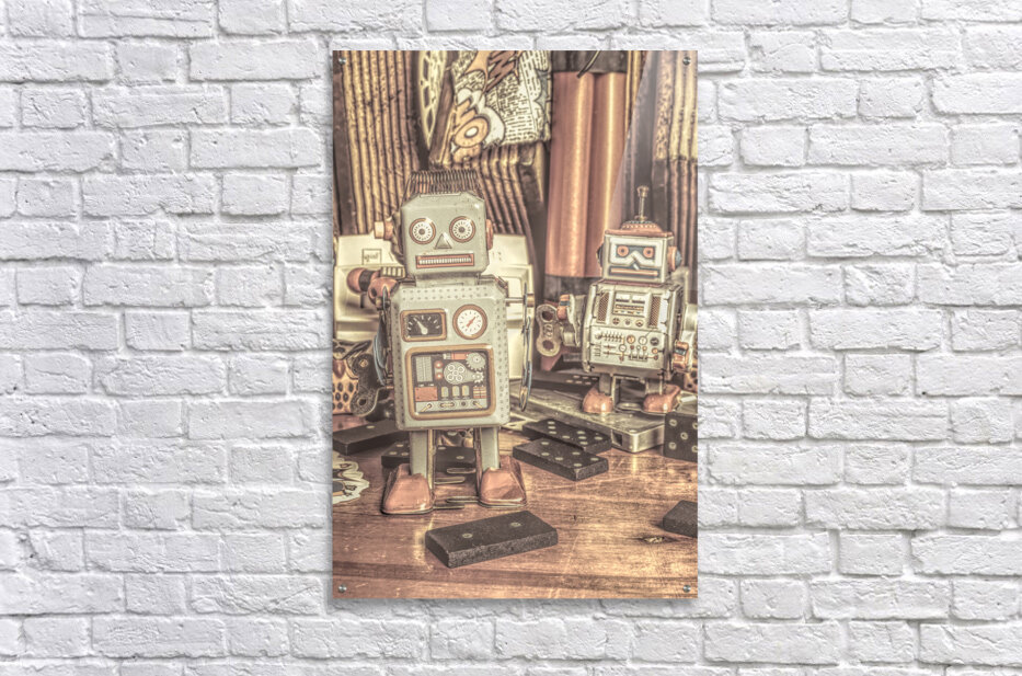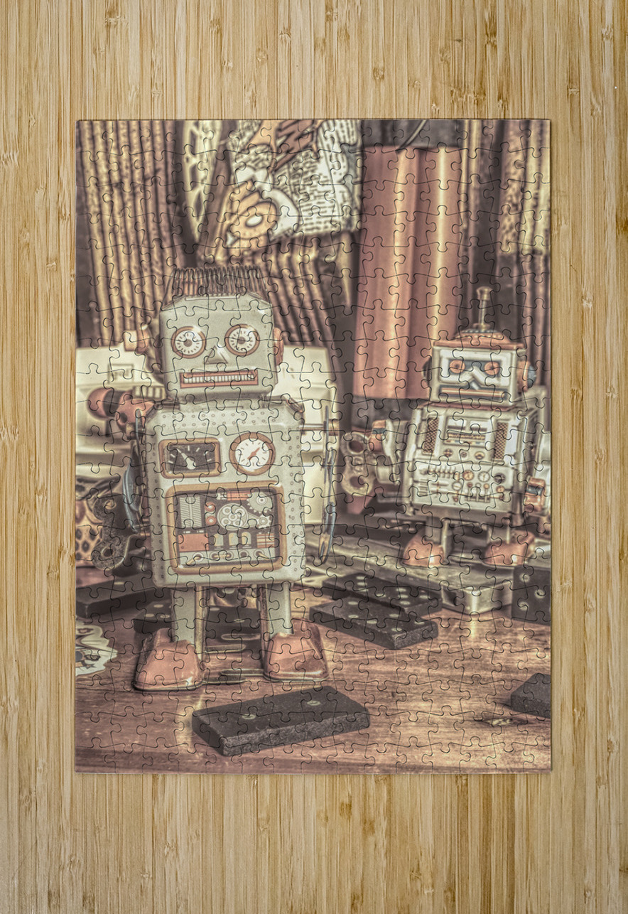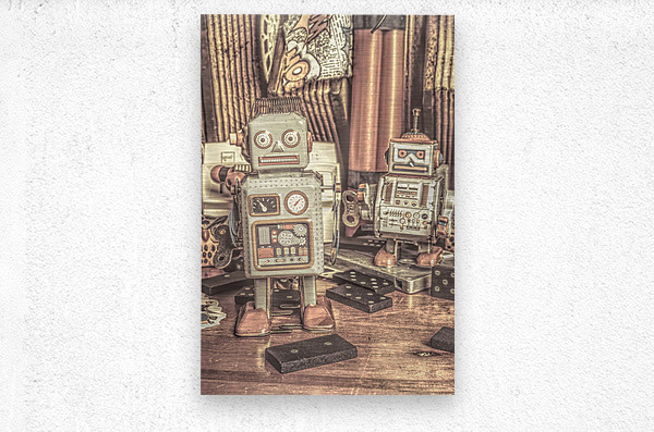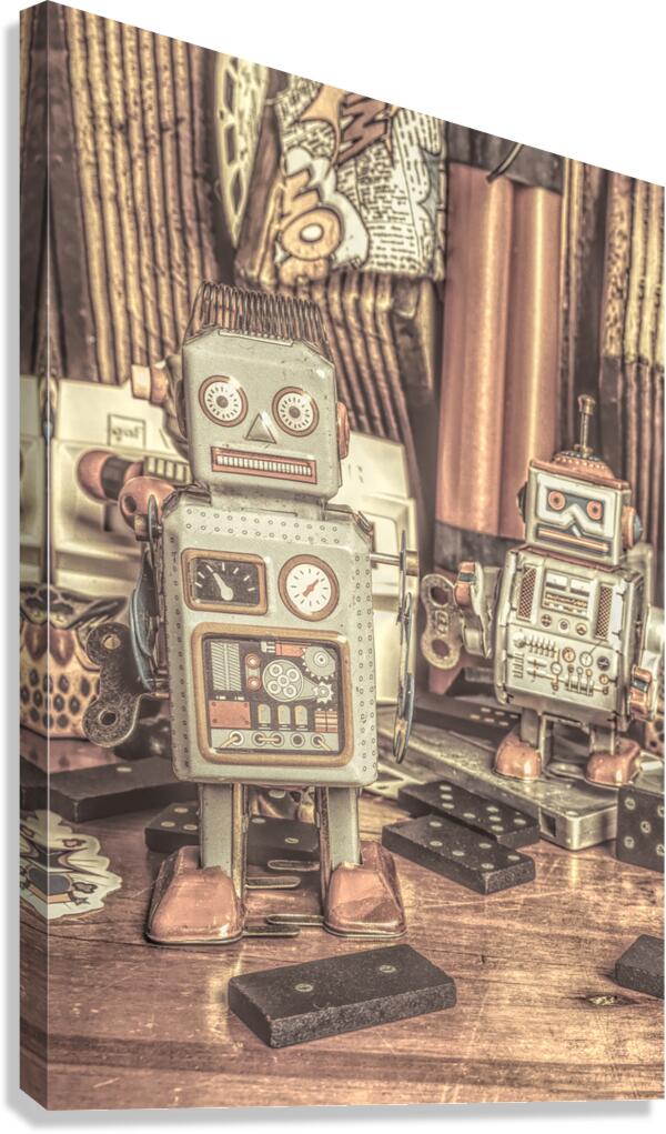 Two vintage tin robots stand amidst nostalgic memorabilia from the 70s and 80s