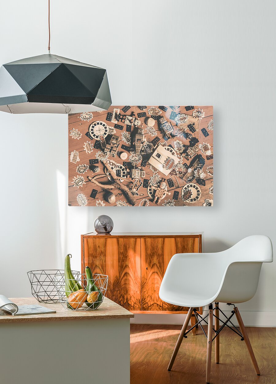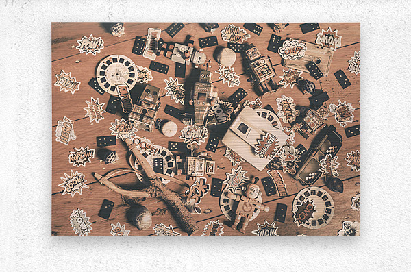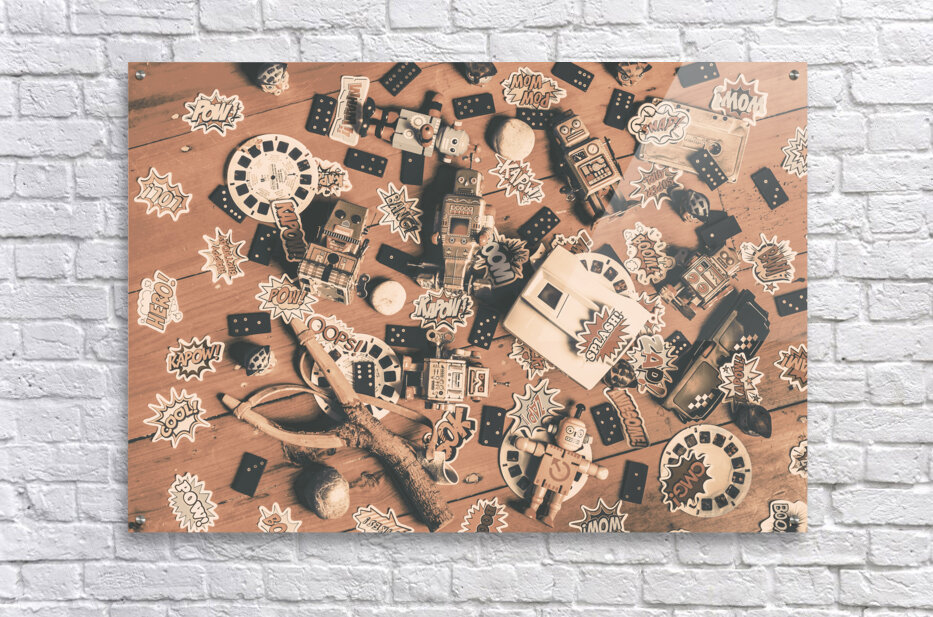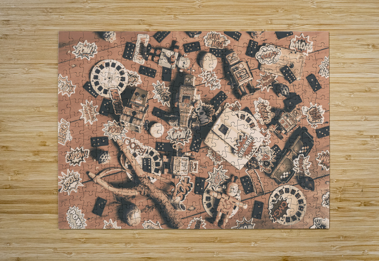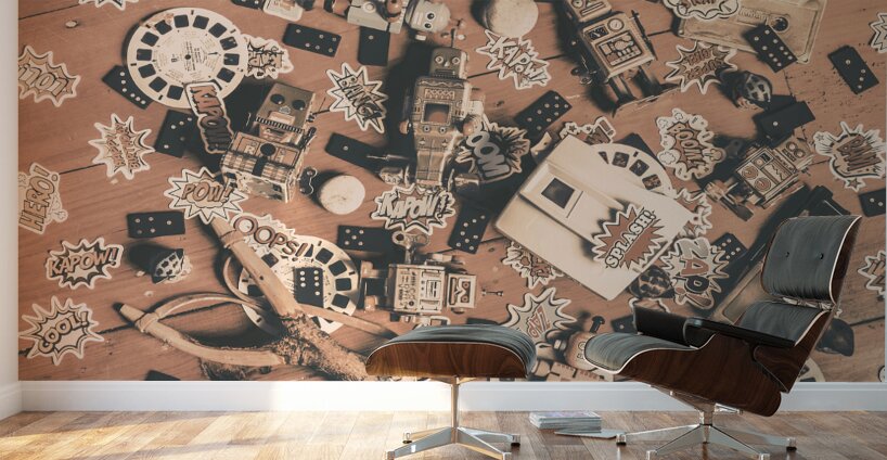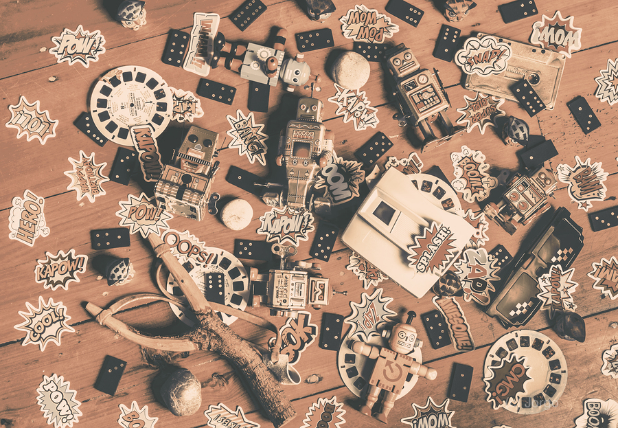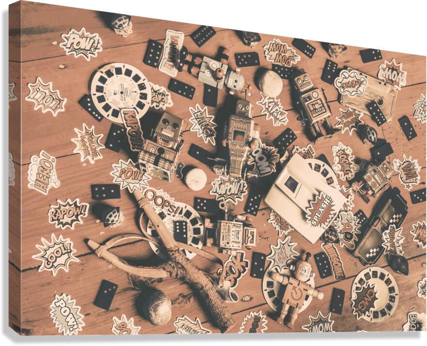 A nostalgic collection of vintage robot toys and game parts creates a rustic mess of fun