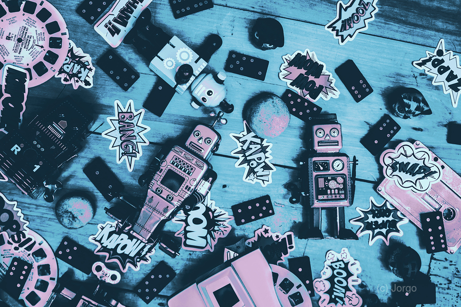 Colorful retro robots and fun graphics bring a playful nostalgic charm to the layout
