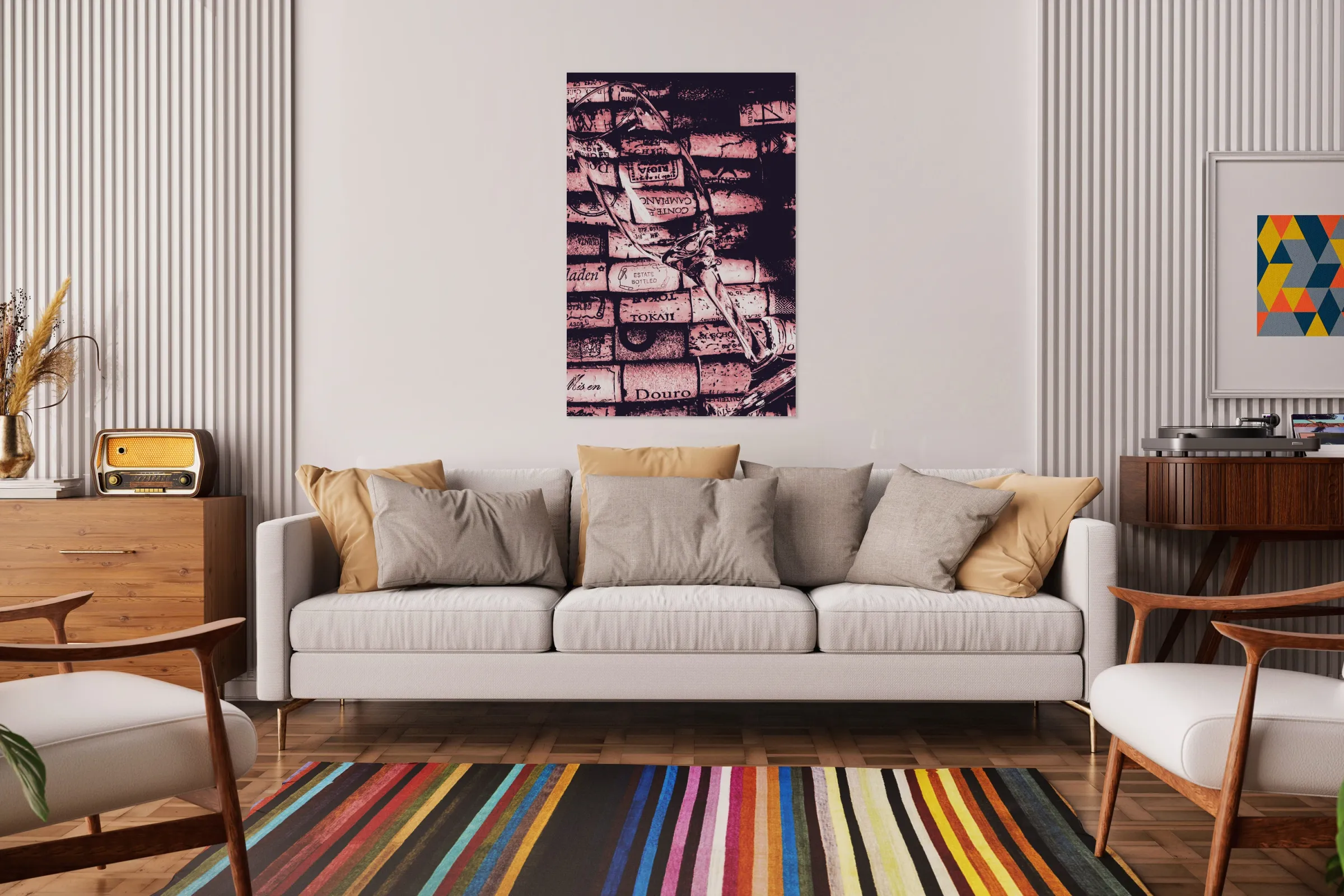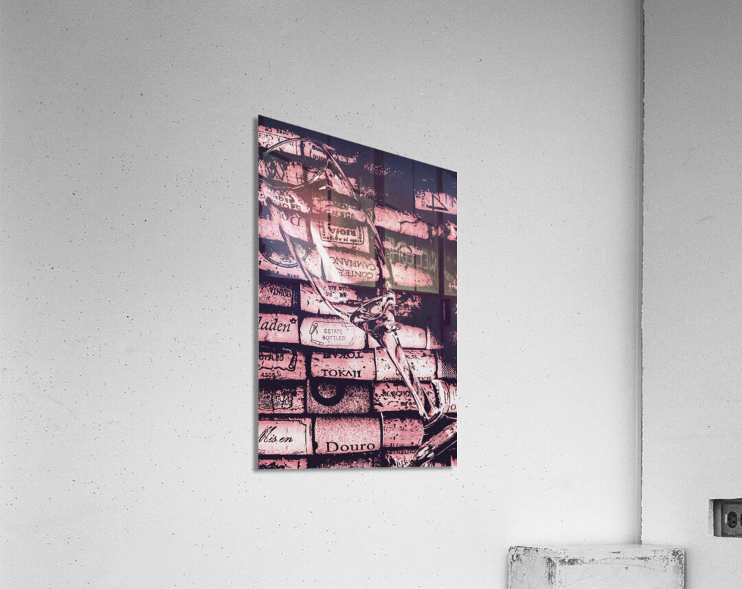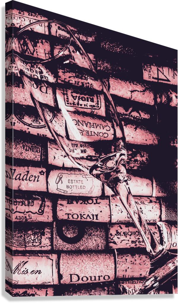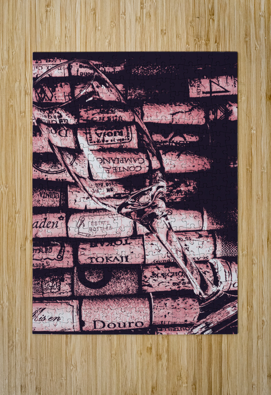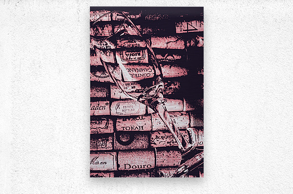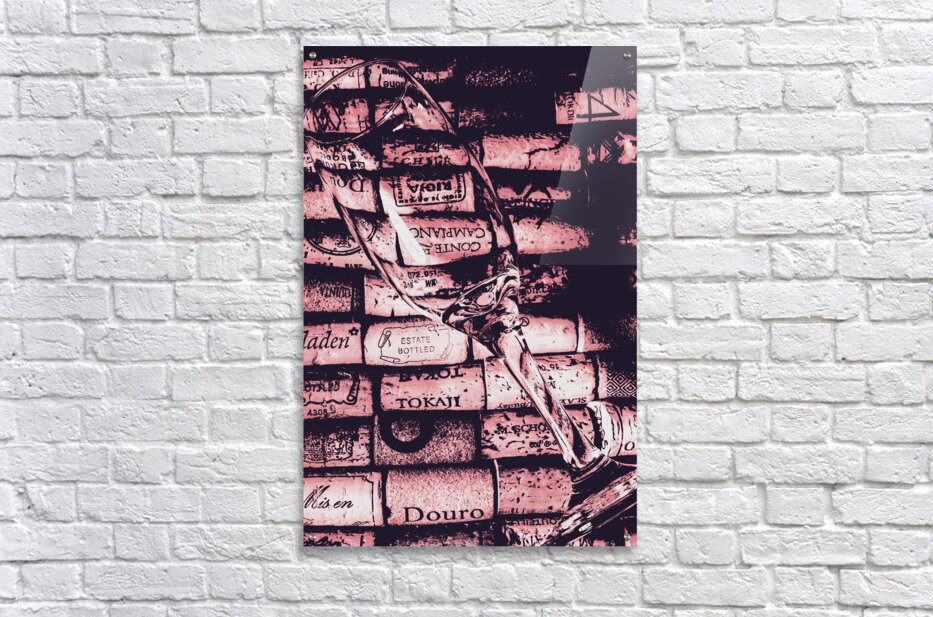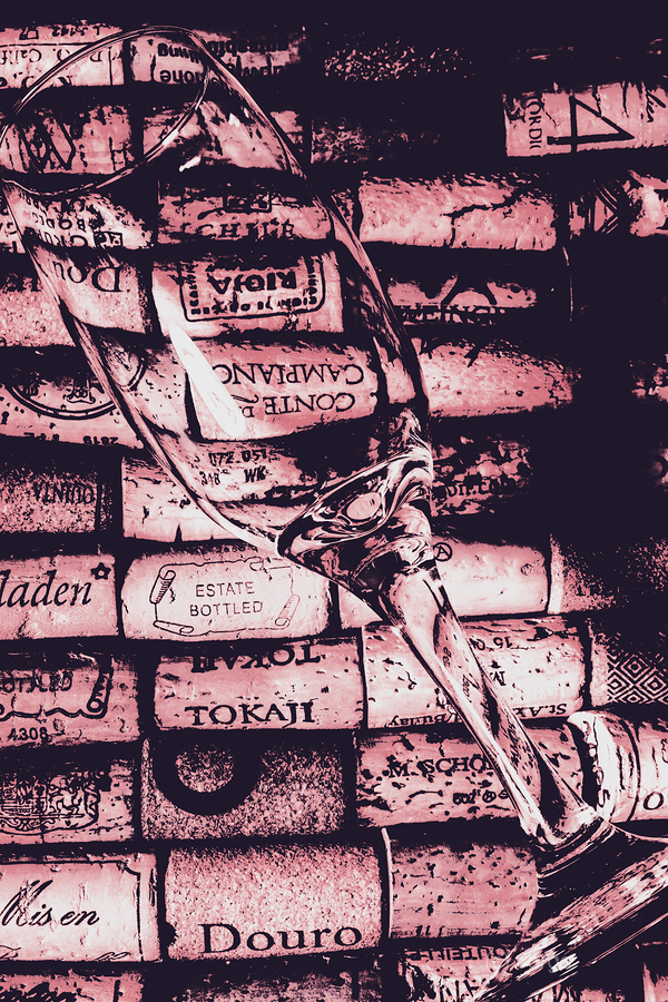 A delicate glass is placed on a vibrant array of wine corks showcasing a blend of textures and colors in an artistic display.