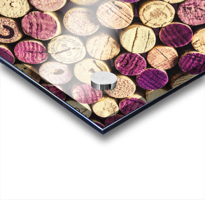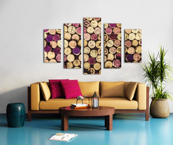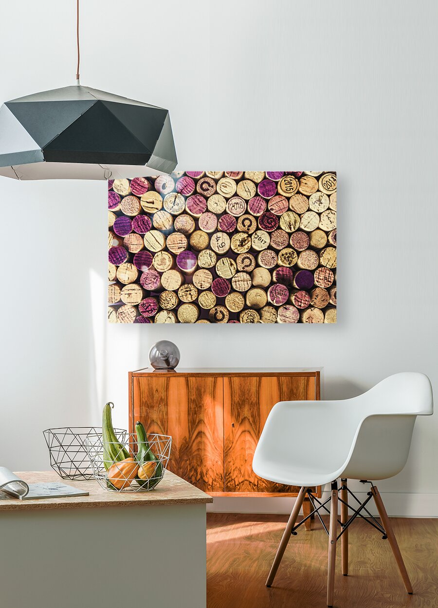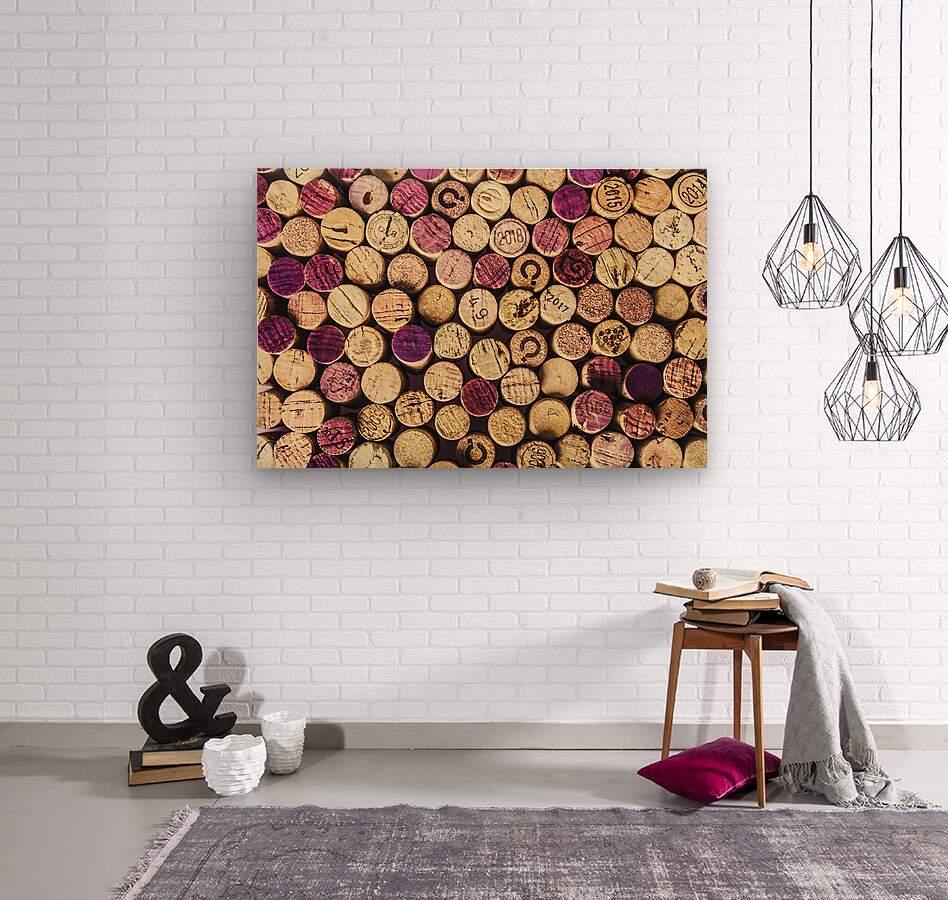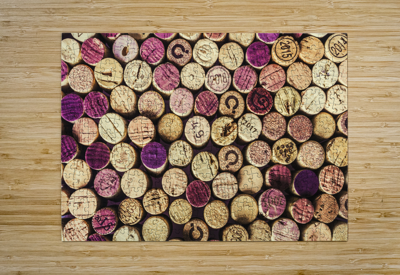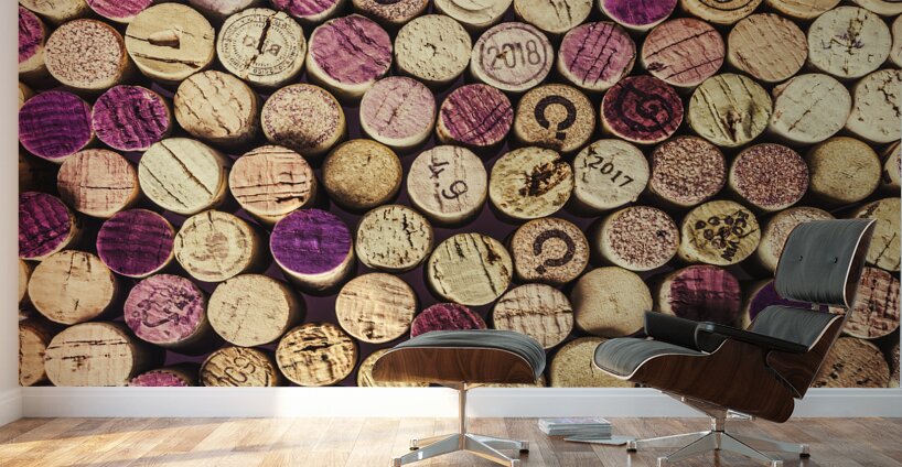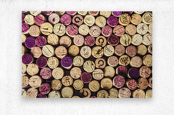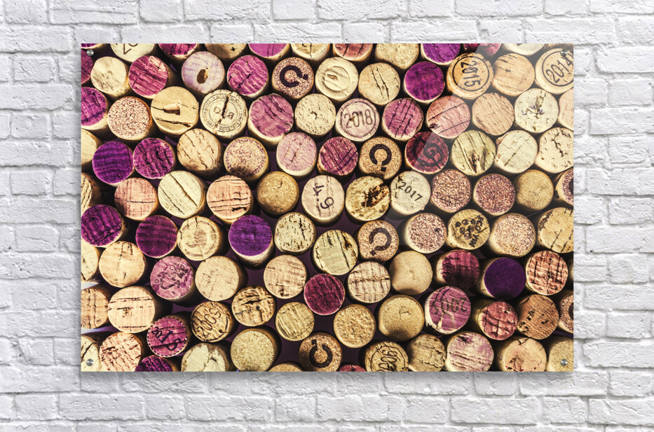 A vibrant assortment of wine corks is displayed showcasing a spectrum of colors and years creating an artistic mosaic.