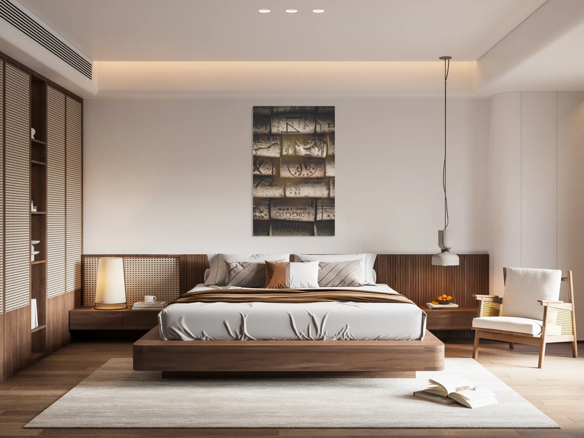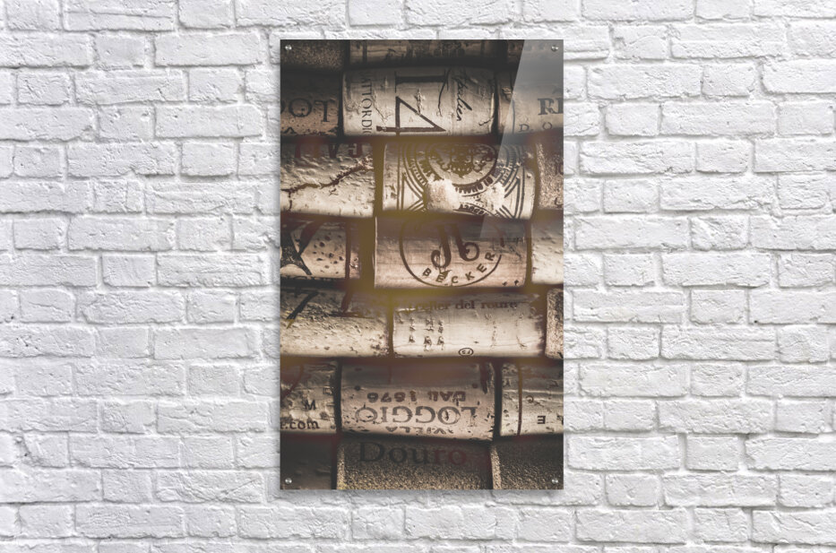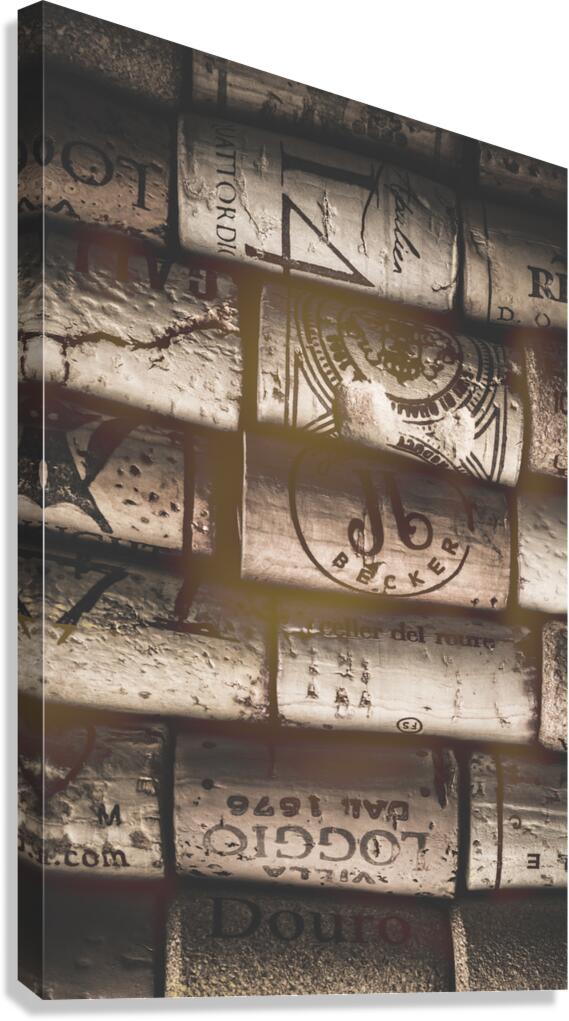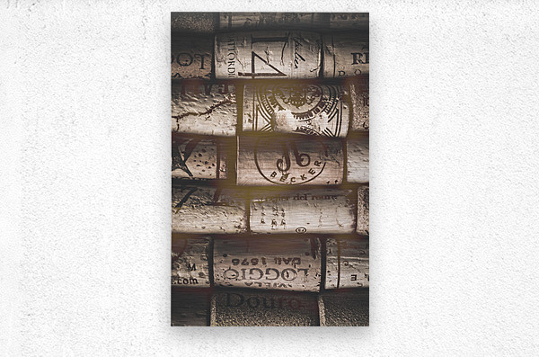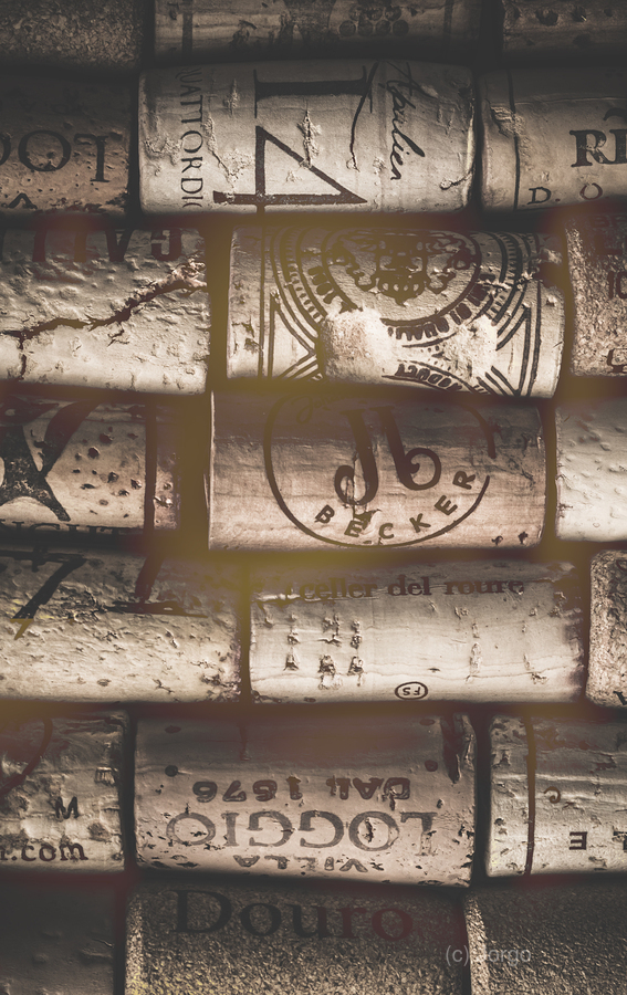 A textured arrangement of wine corks displaying intricate designs rests on a wooden surface showcasing their unique histories and ages