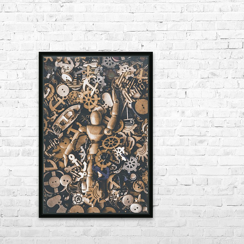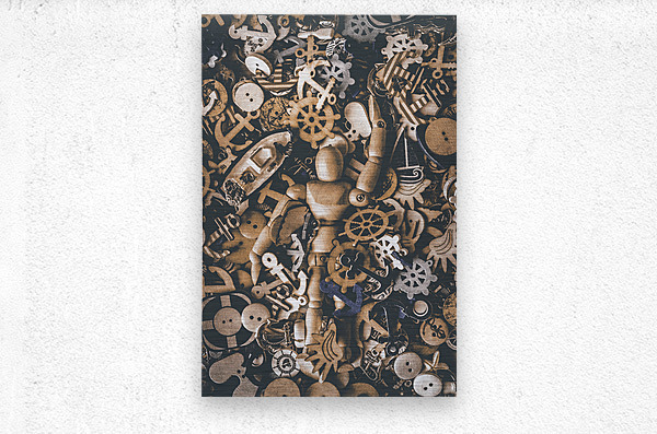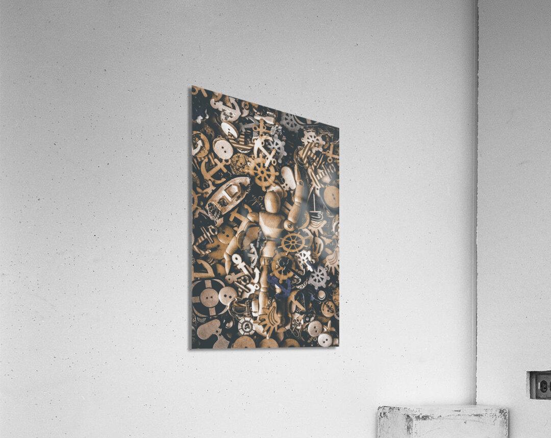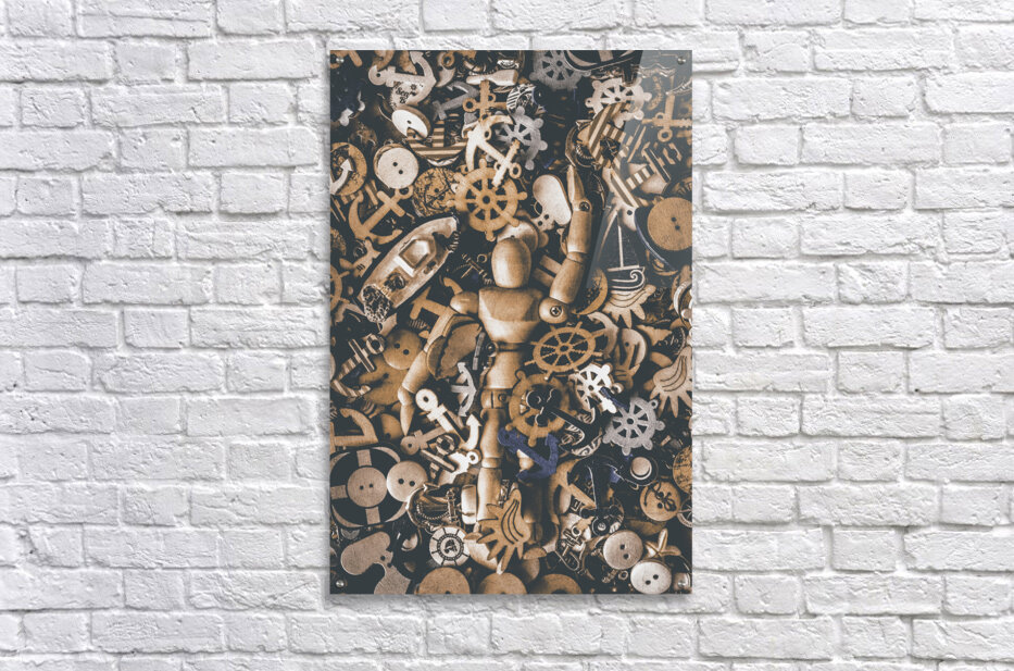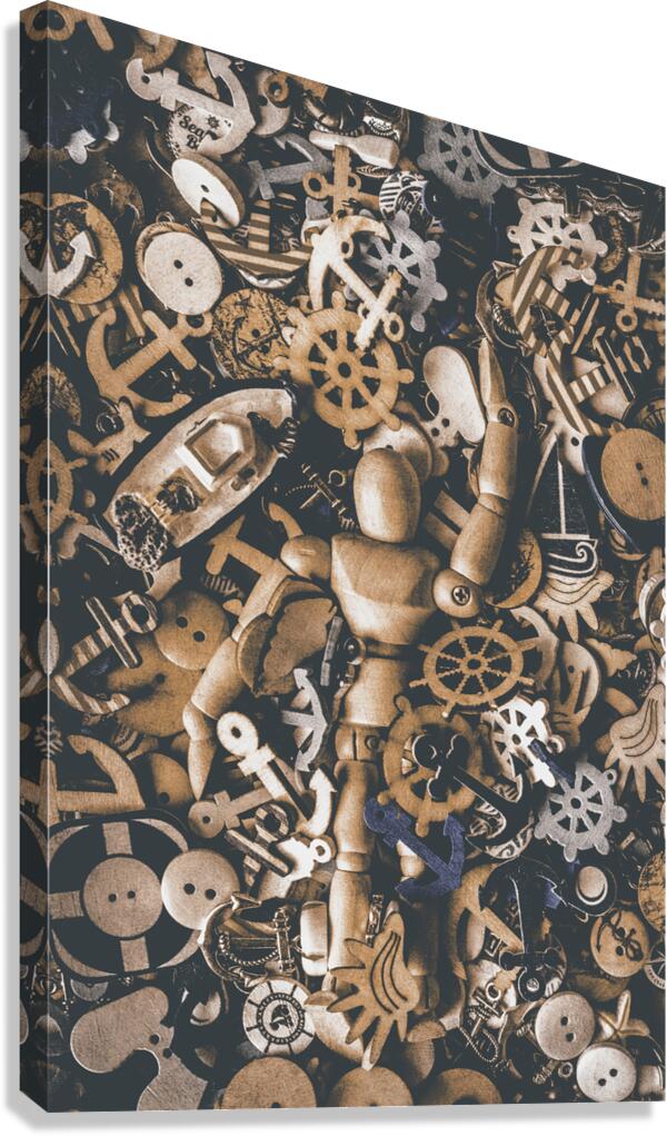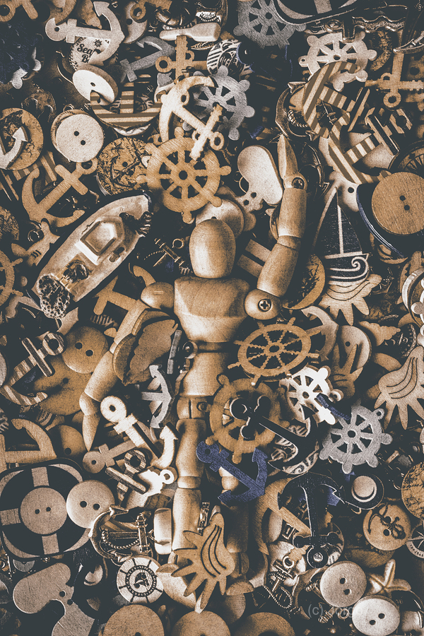 A creative SEAne of maritime art with wooden doll swimming amongst a wash of nautical iconography