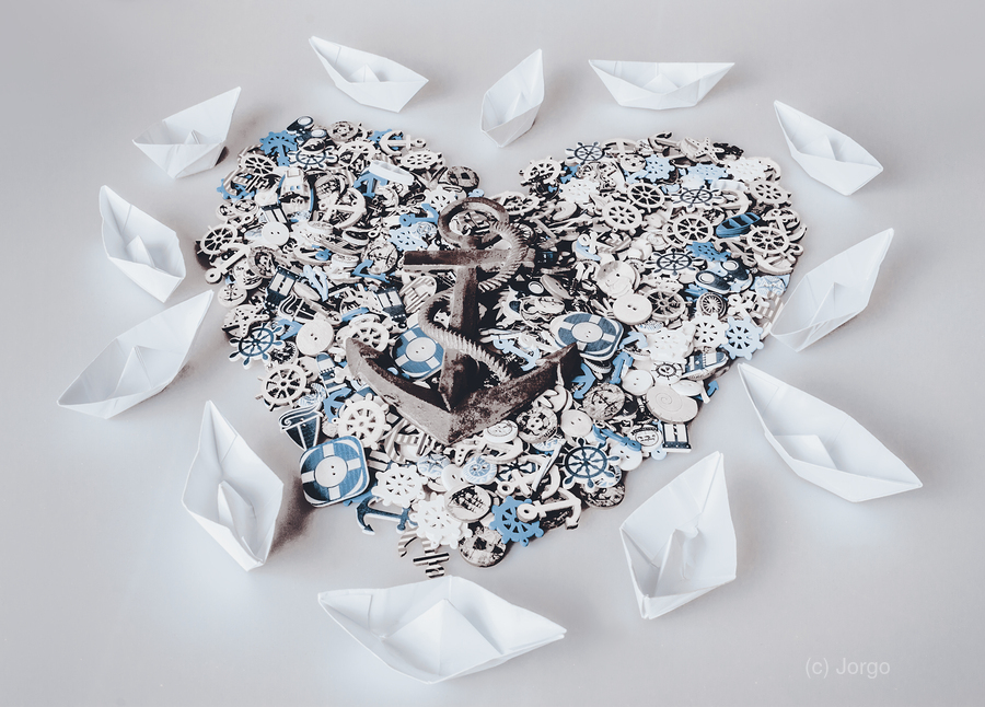 A layout on marine machinations with an icon island made from seashore sentiments with nautical icons and badges