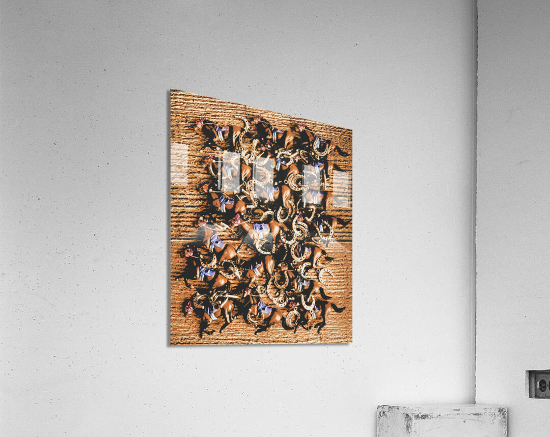 Tiny toy horses adorned in vibrant colors create a mesmerizing pattern evoking a sense of whimsy and playfulness across the ground