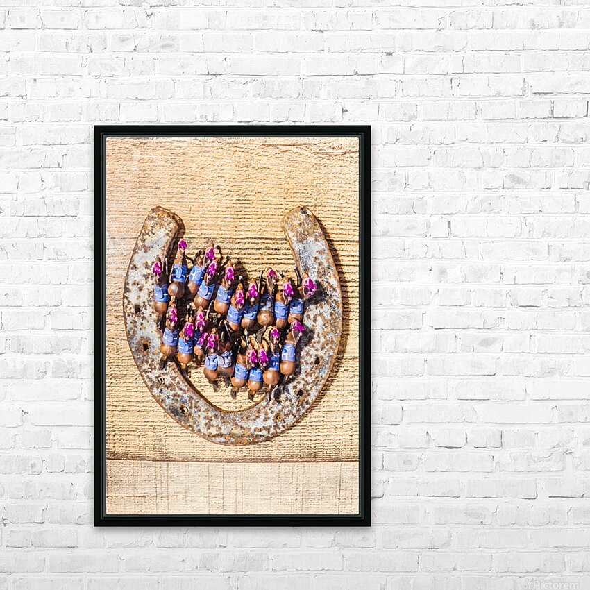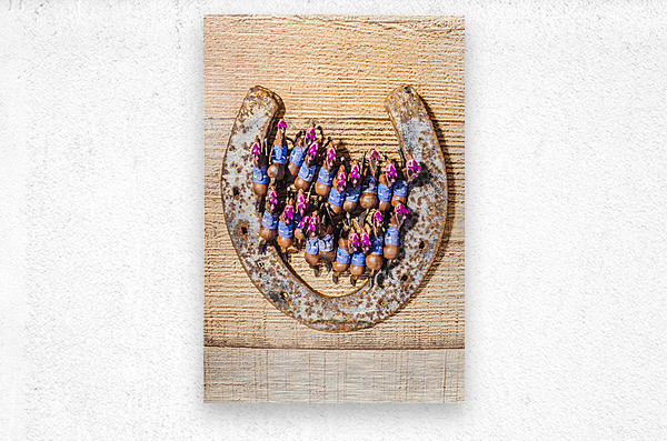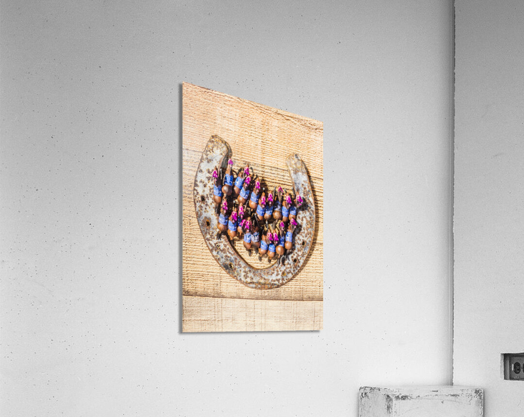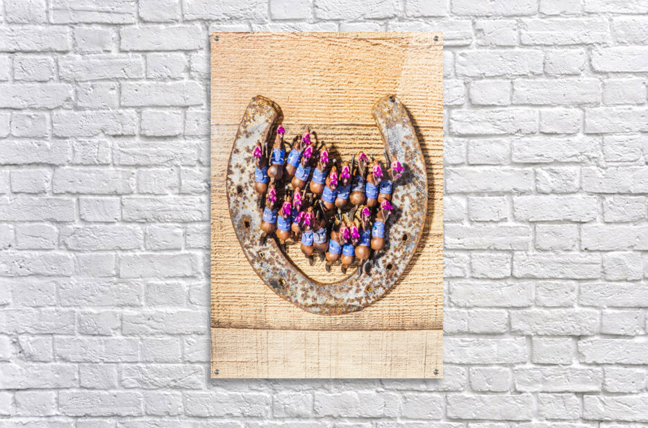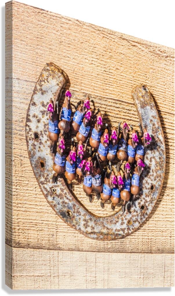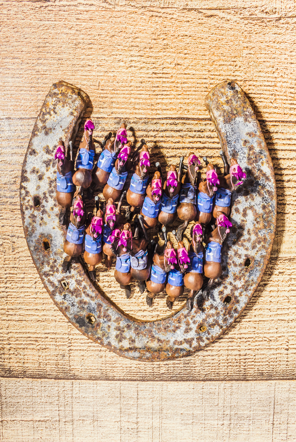A lucky racehorse spectacular with a lineup of horses racing out the gates of a weathered old horse shoe