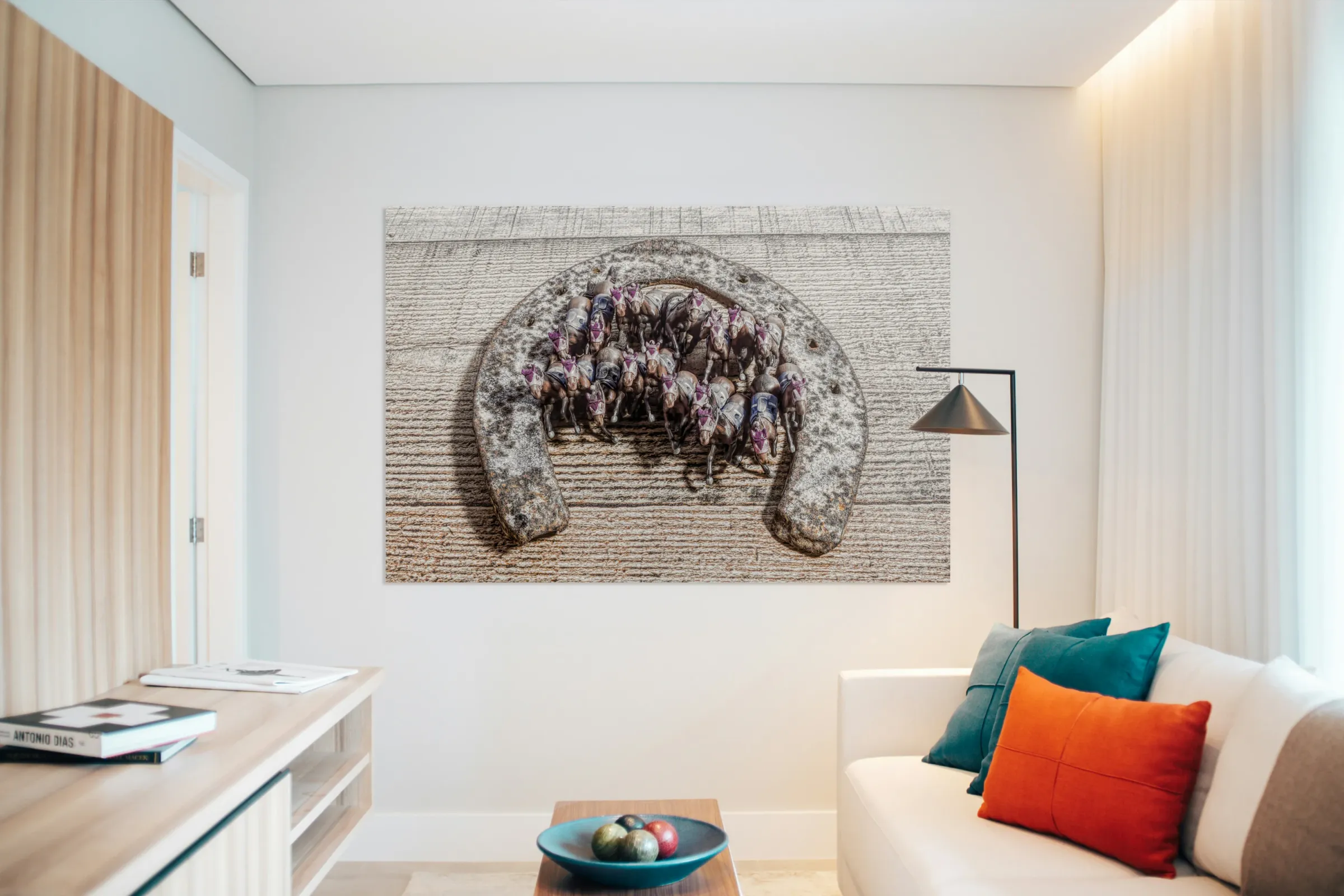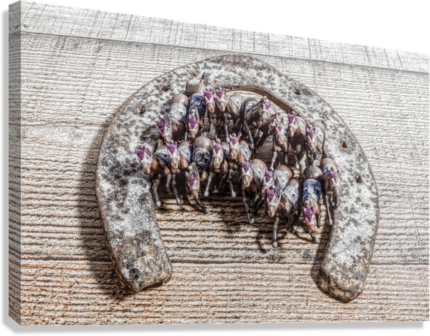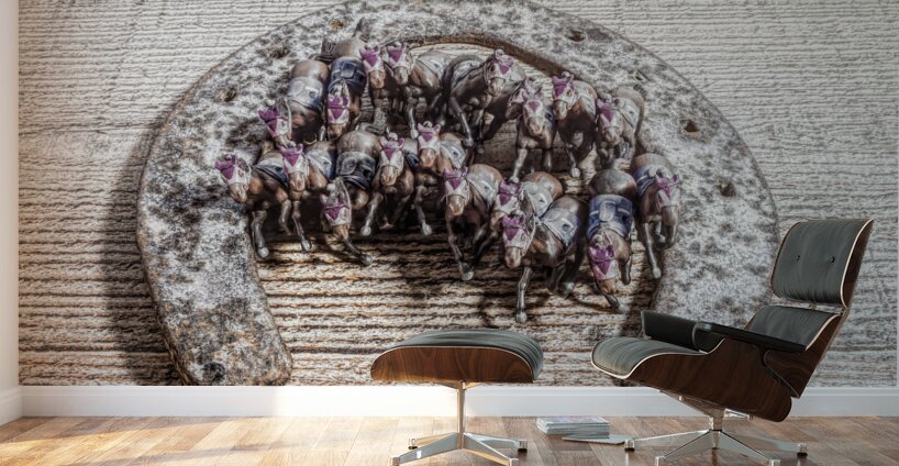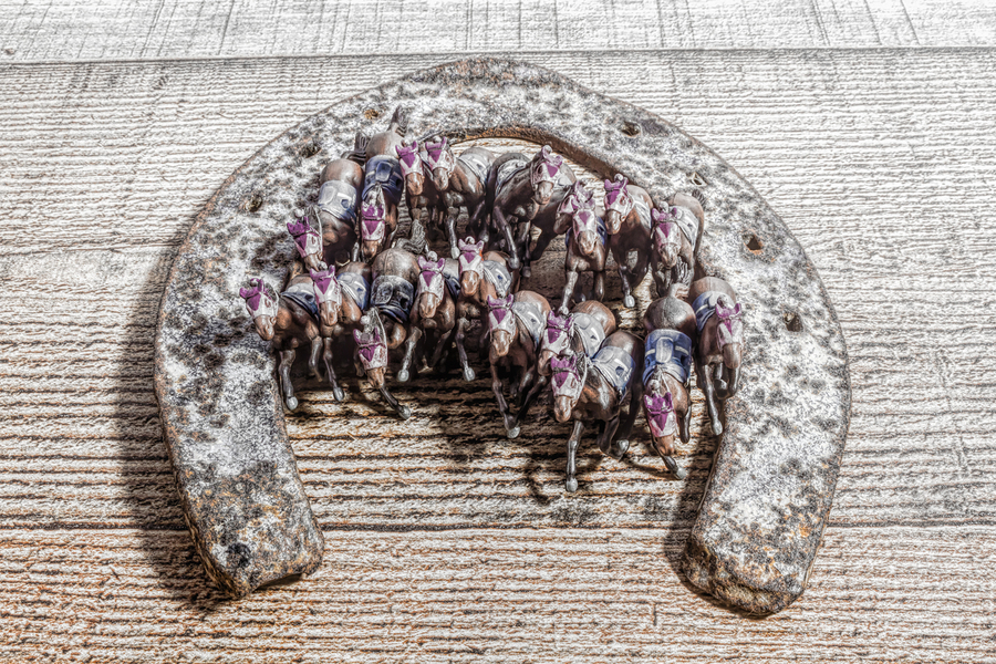 A creative scene of horse play with model horses racing out of the gates of a horseshoe