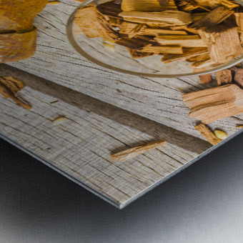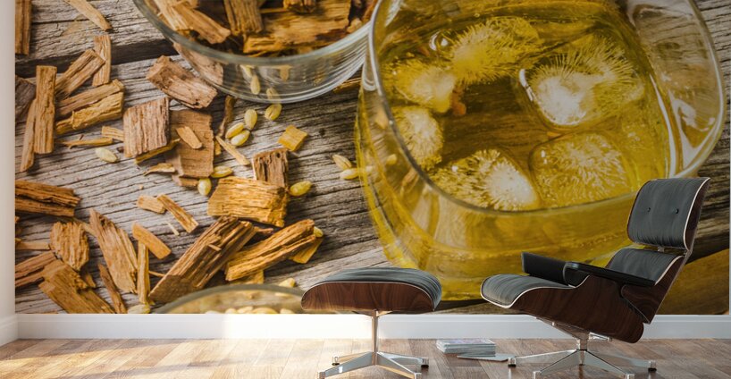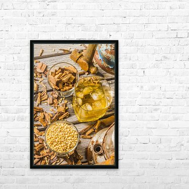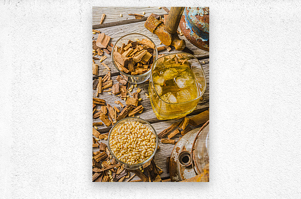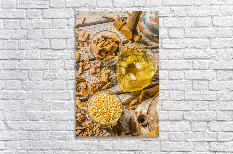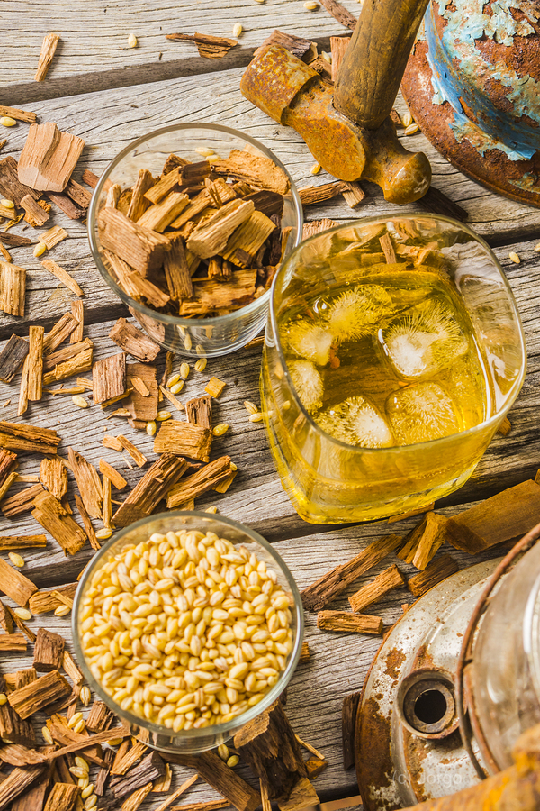 Modern take on age old whiskey with grains and chips and old weathered tools