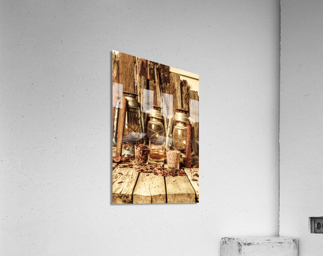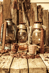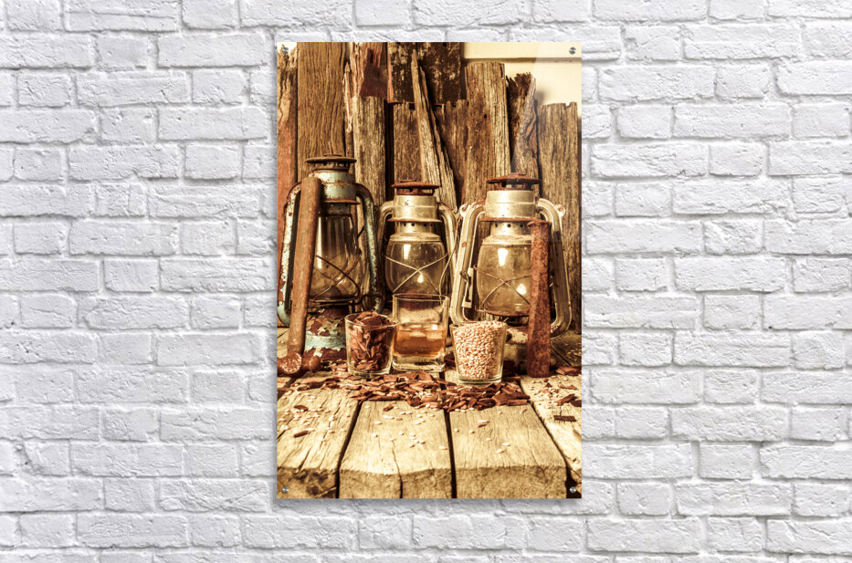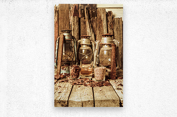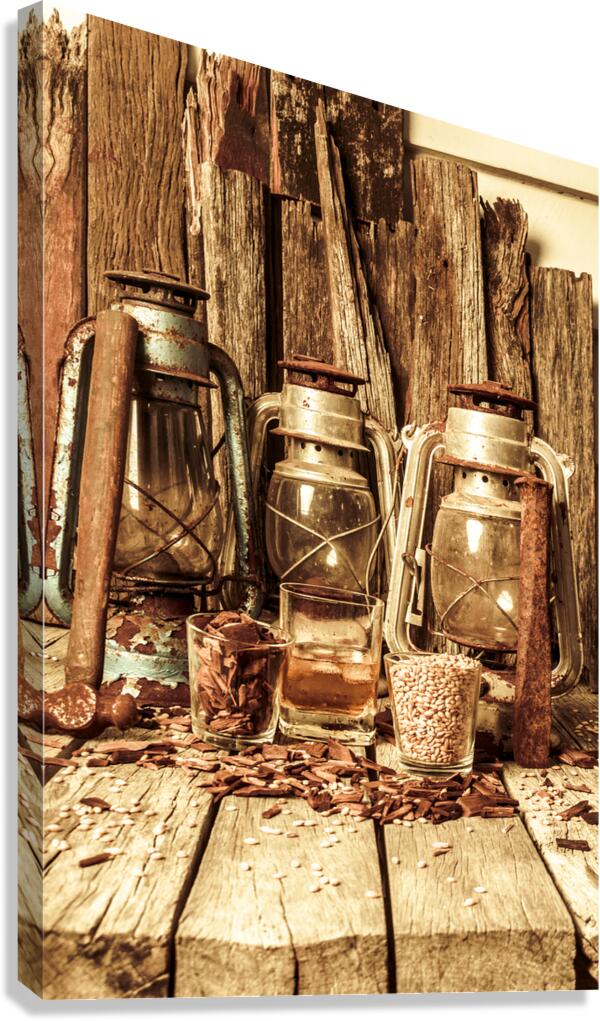 A scene that gets better with age with a sampling of aged whisky with oak barley and barn tools