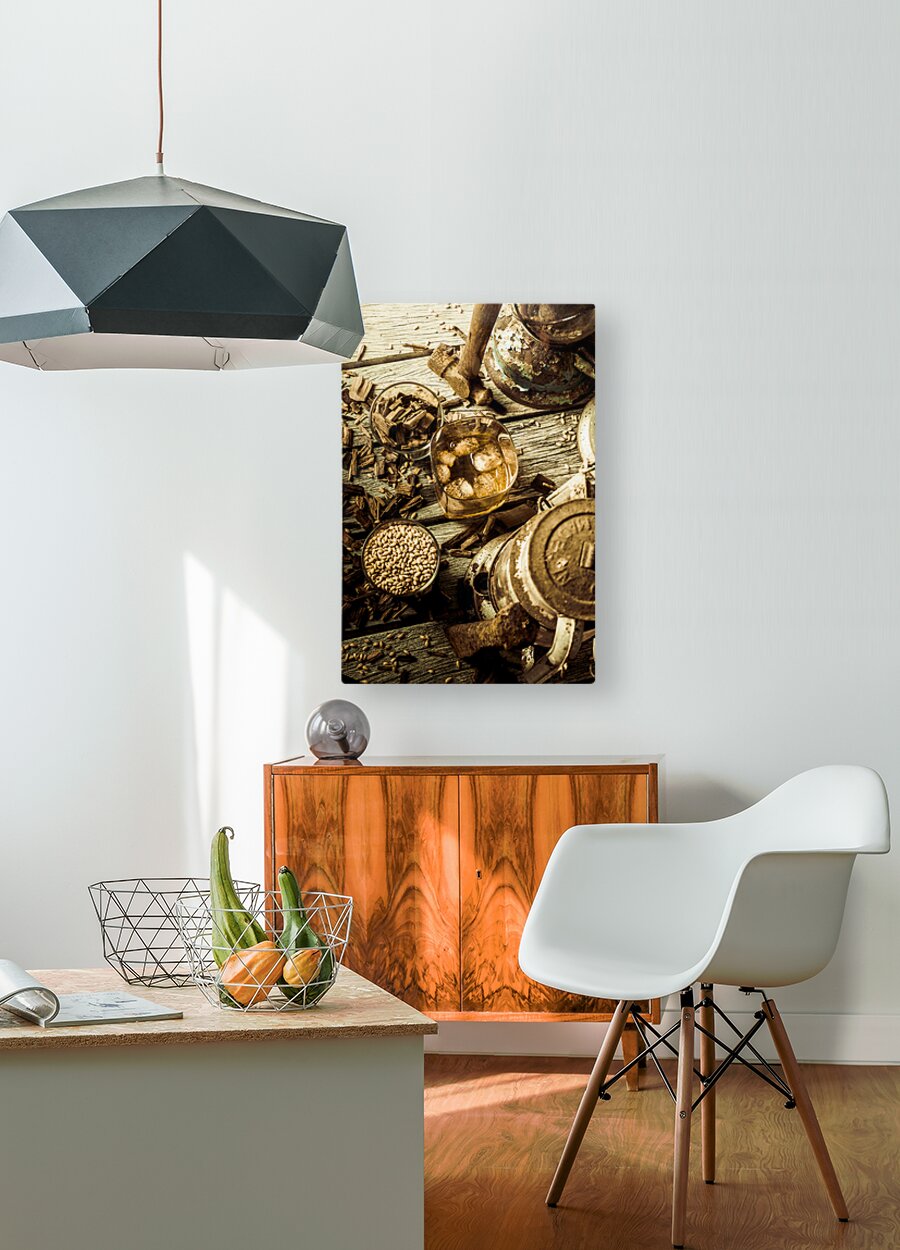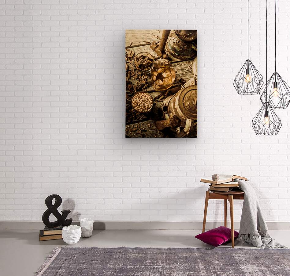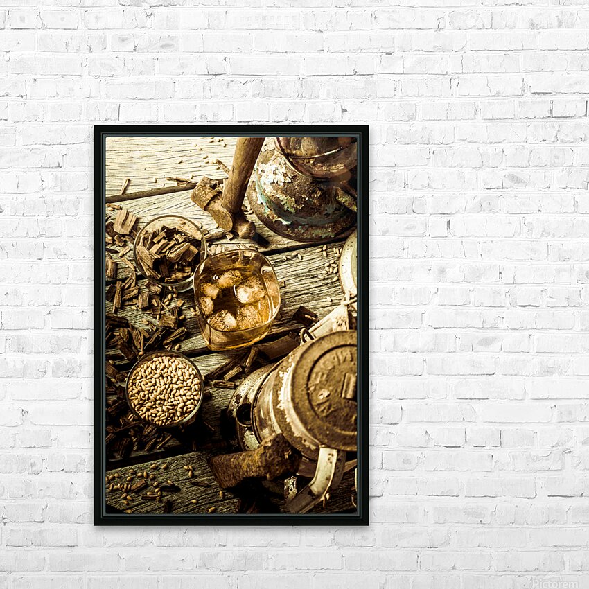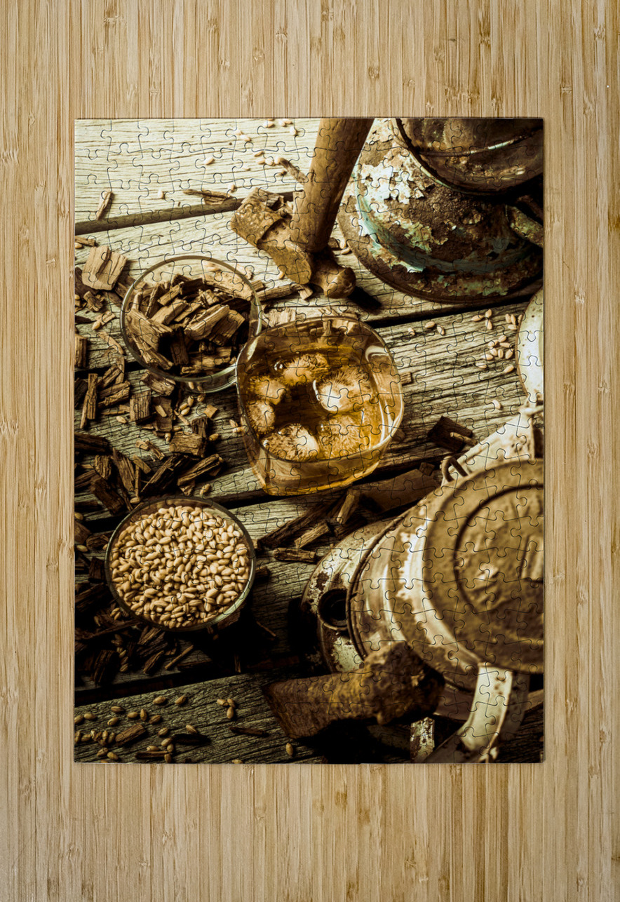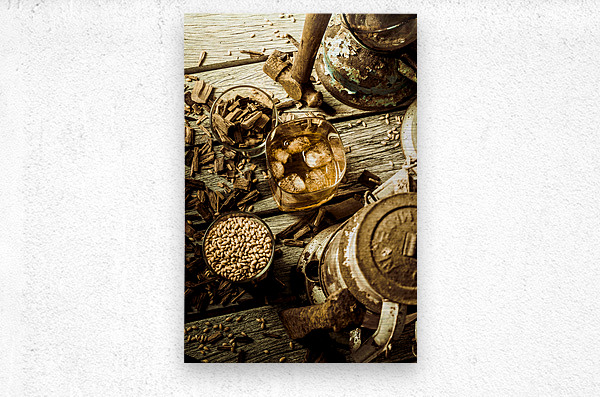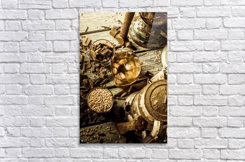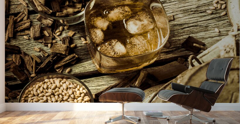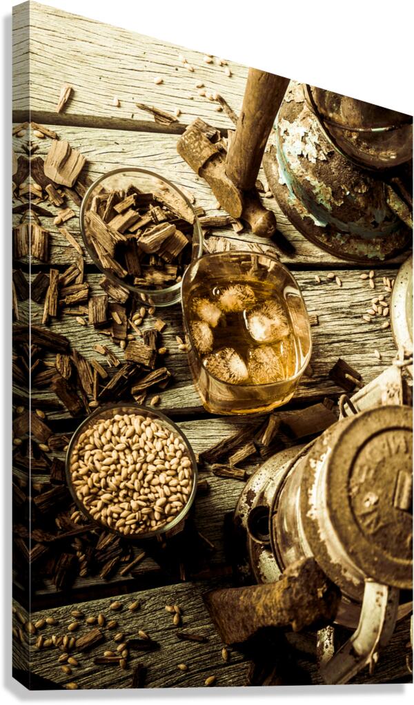 A rugged still-life in weathered wooden country dynamics with whisky glasses ageing oak and barley grains