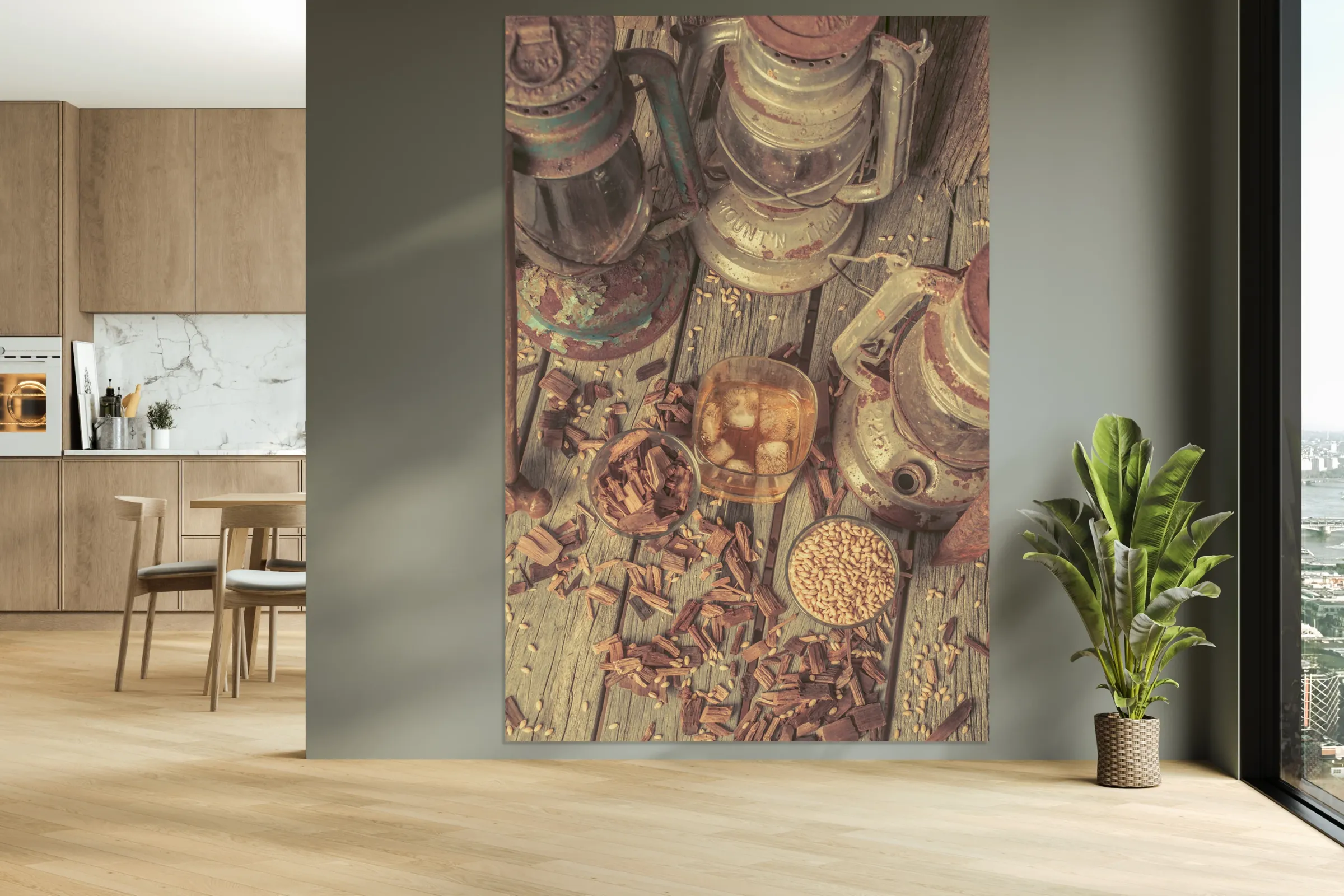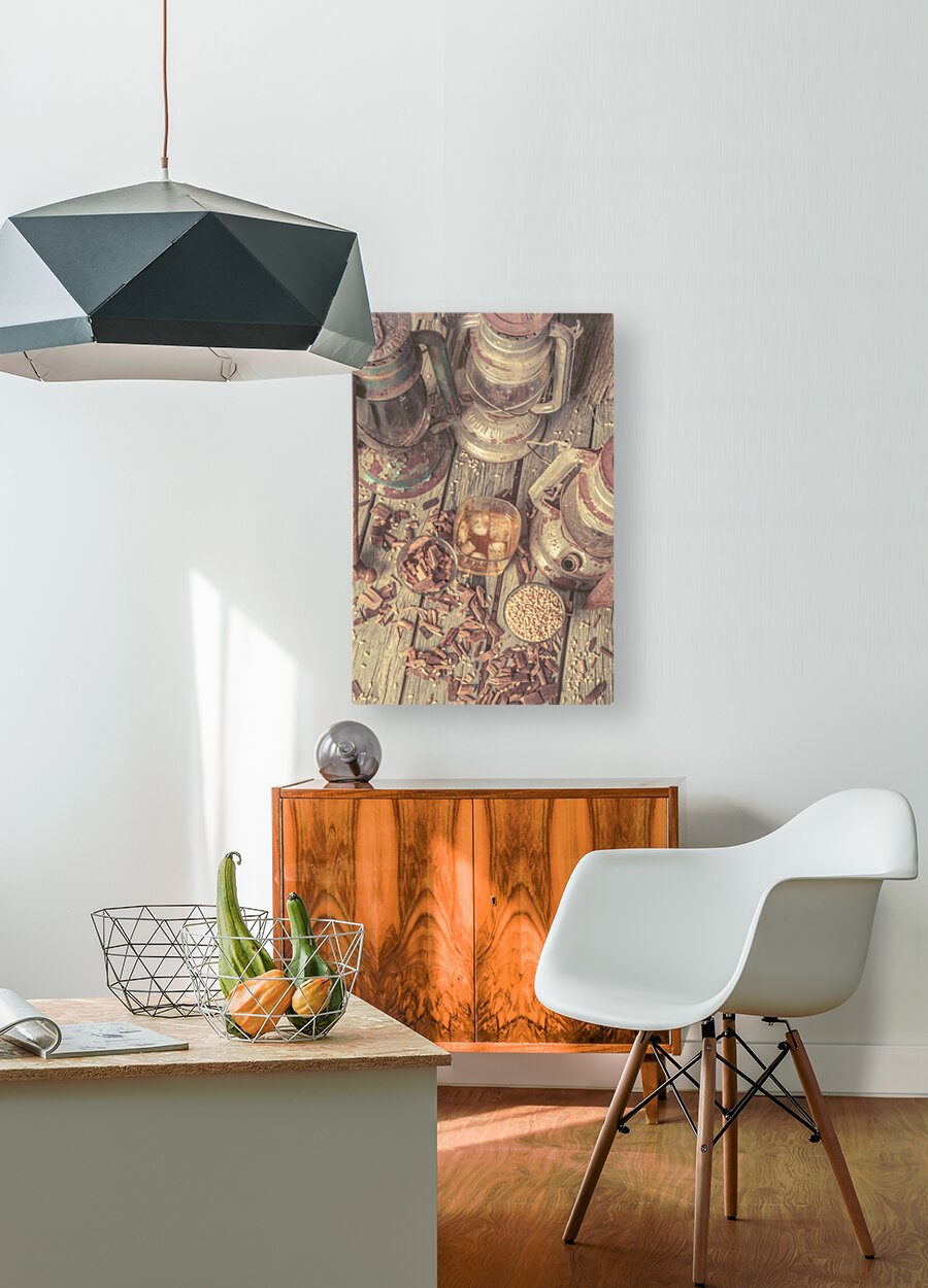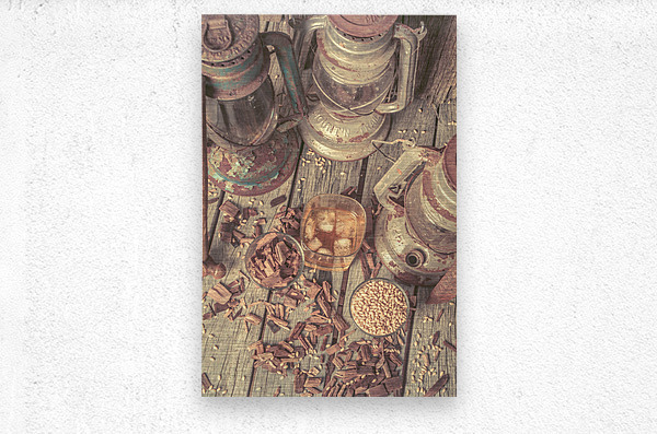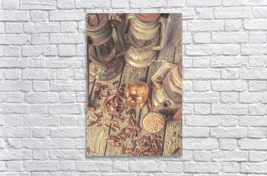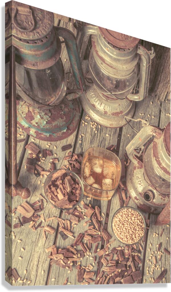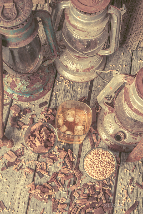 Provincial placement of rustic country style with woodchips and grains with oil lamps and whiskey