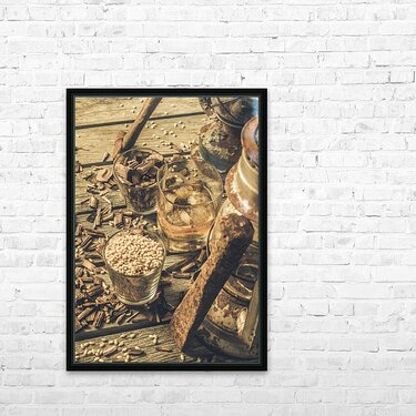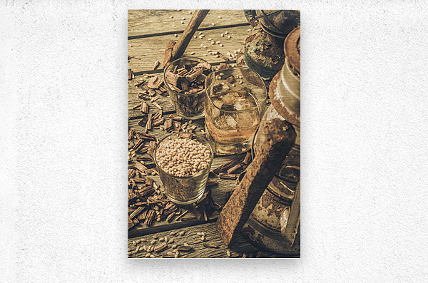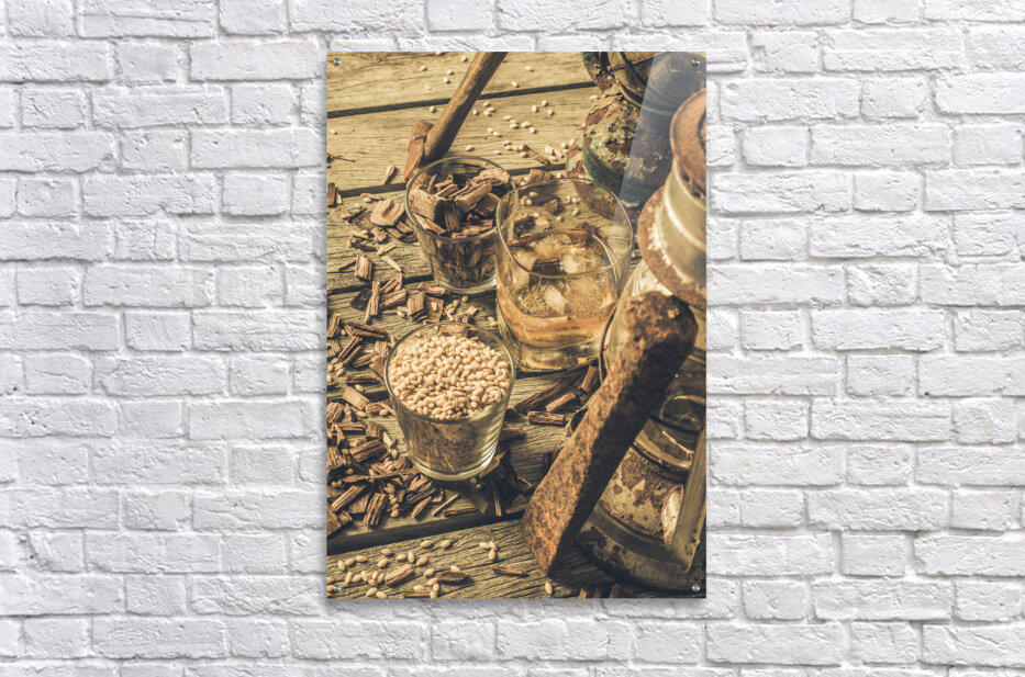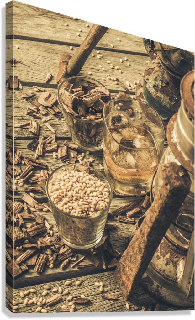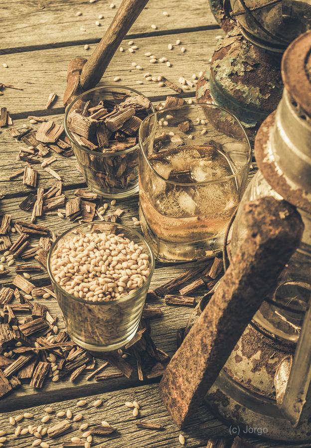 A weathered whiskey still life scene with chisel hammer grains lanterns and American oak wood chips.