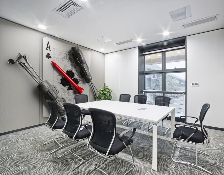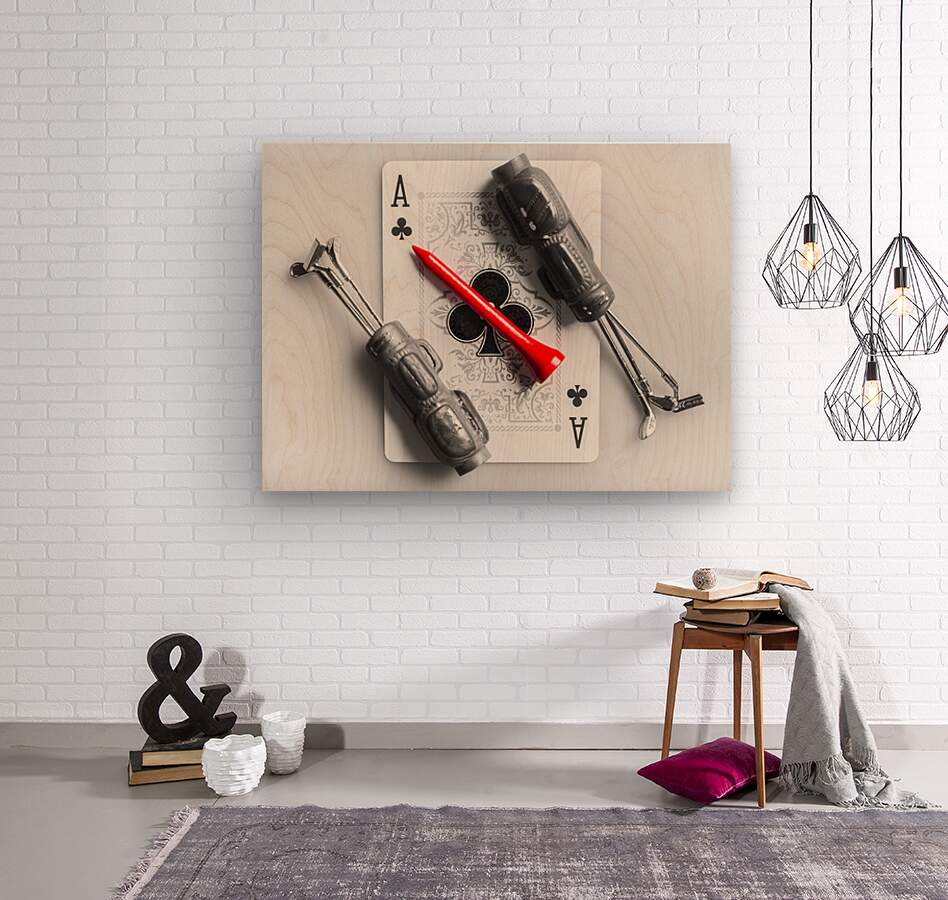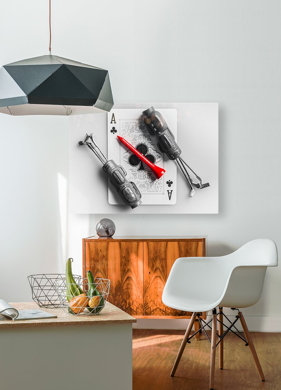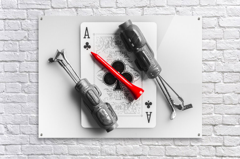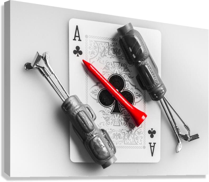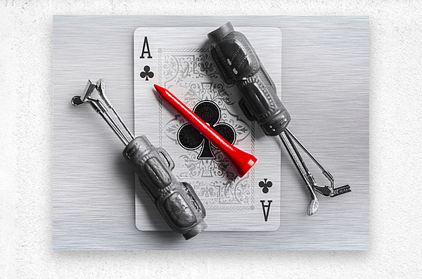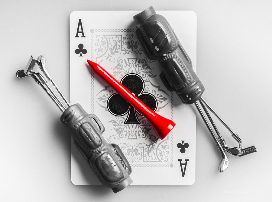 A tee on scene of golfing gimmicks with the ace of clubs card and clubs of aces