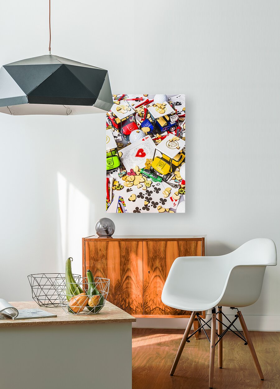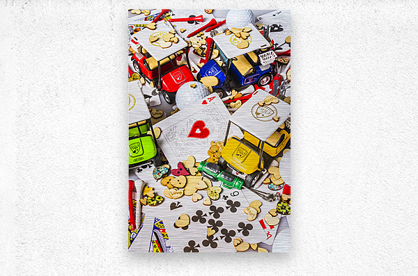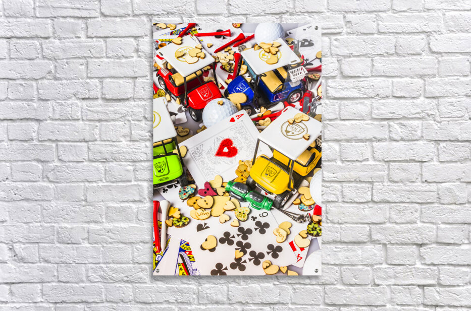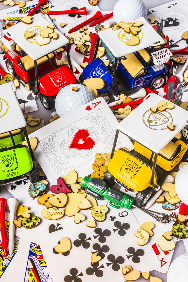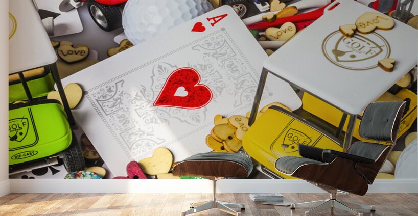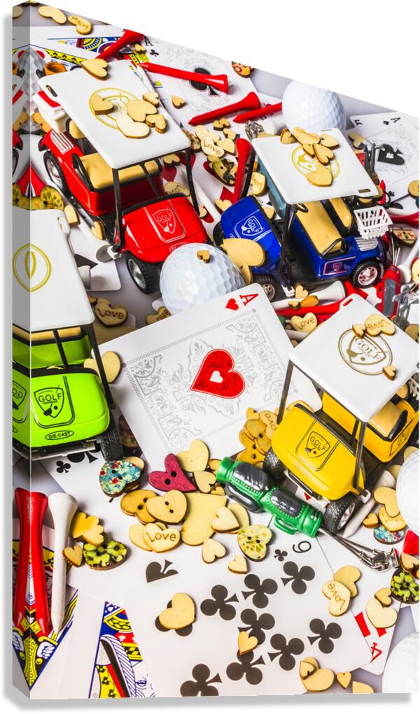 A contemporary scene of golfing love with a playful golf display of hearts and carts in abstract art
