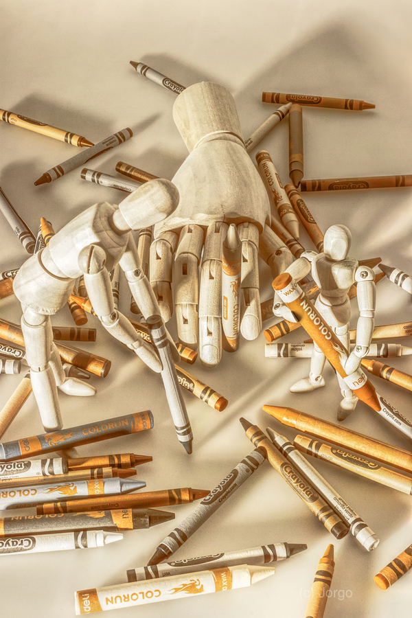 A visual fine art scene on puppet artists sketching out a still life piece in a cluttered crayon consortium