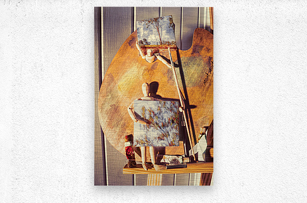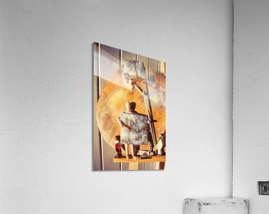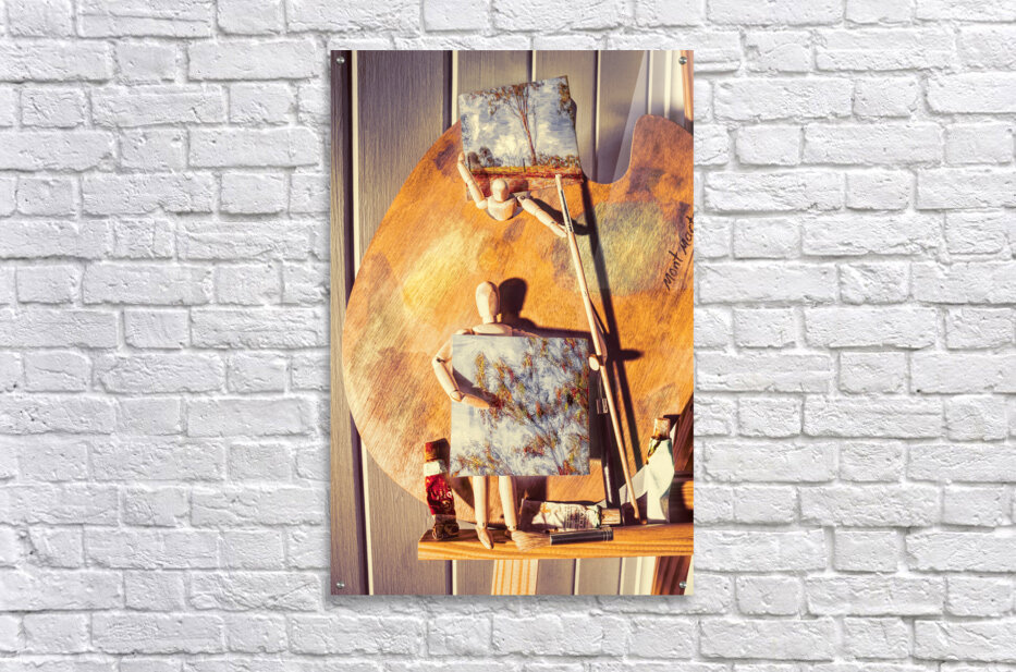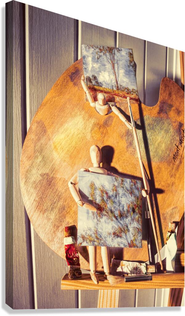 A figurative scene in fine art as wooden studio manikins proudly display their newly painted miniature canvas artworks on easel stand