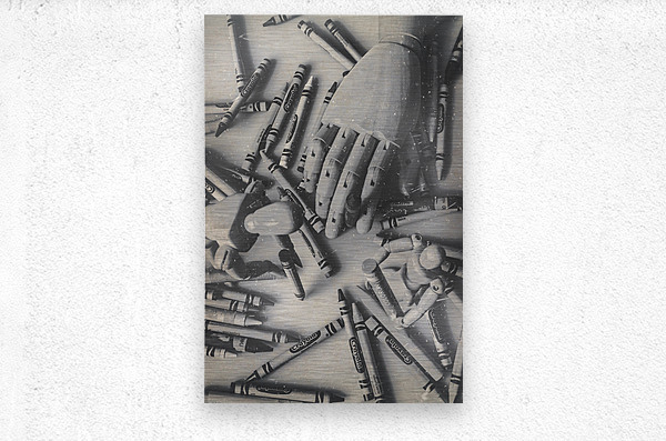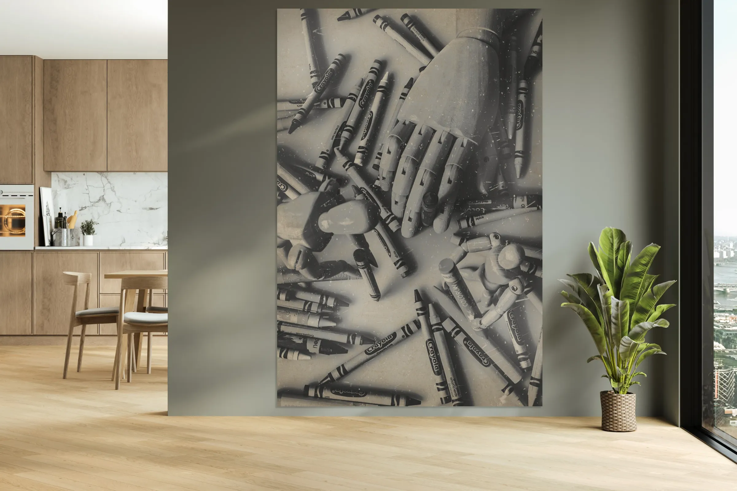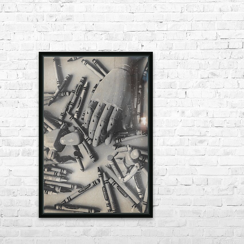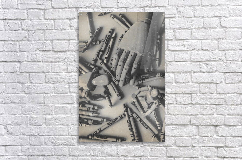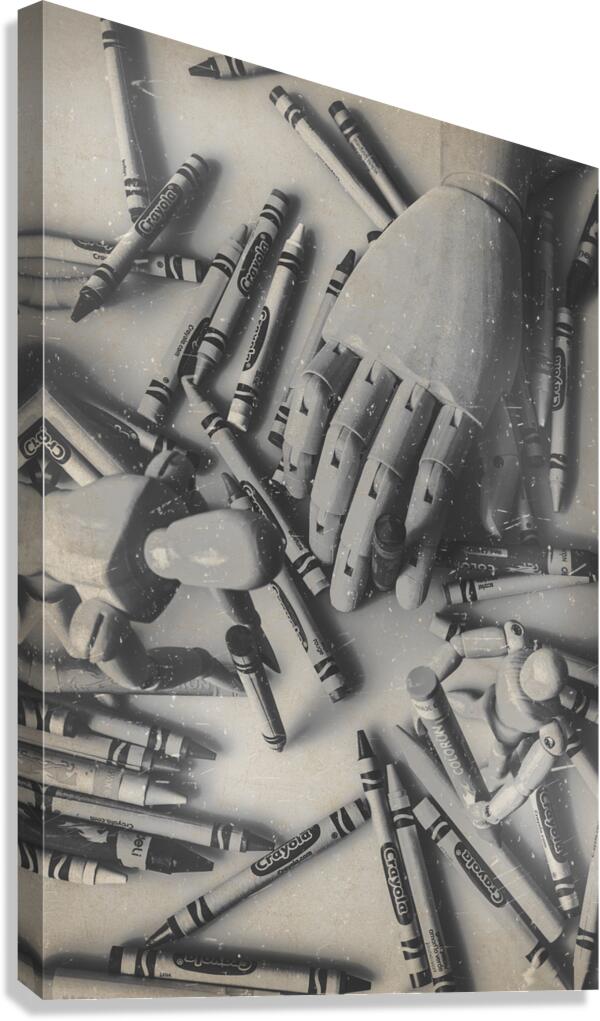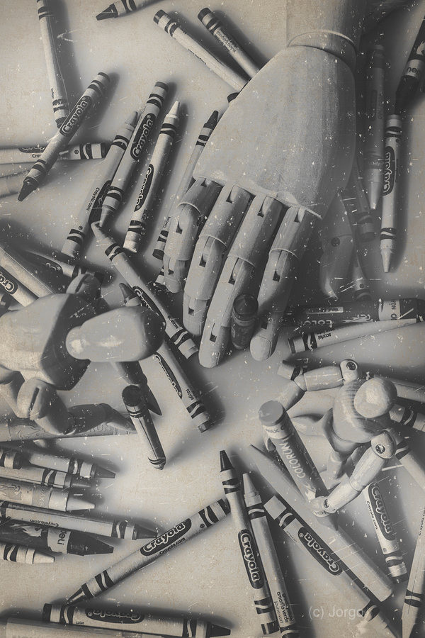 A scratched and faded scene in old artistry as art studio dolls roll out the crayons to draw out a fine art fantasy