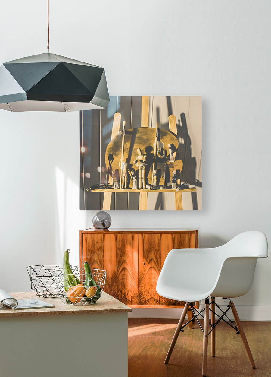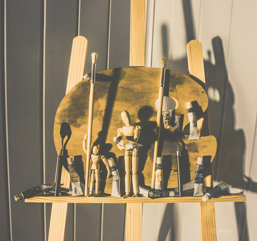 Vintage still-life scene on a puppetry of painters playing a part in painting pictures