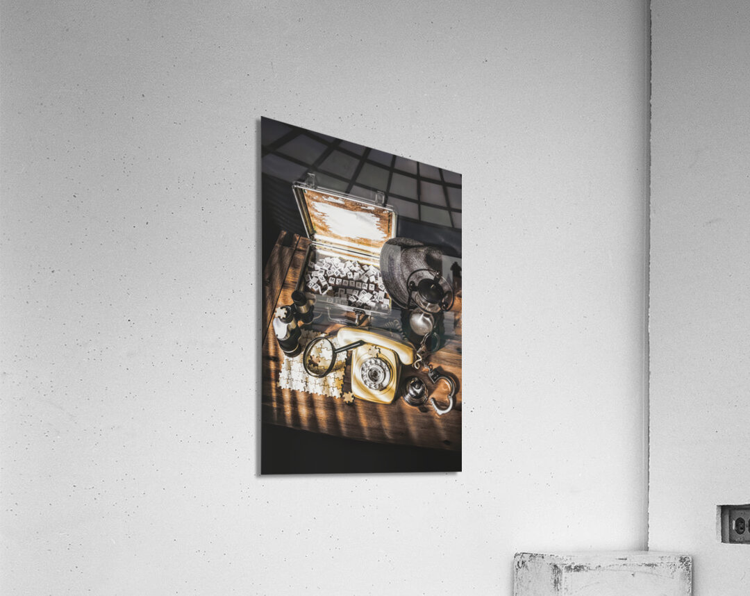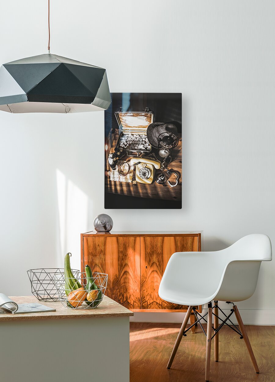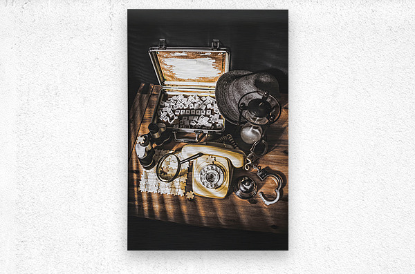 Antique scene of crime files uncovered as a film noir detectives desk is lit by the lights of a case almost solved