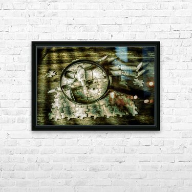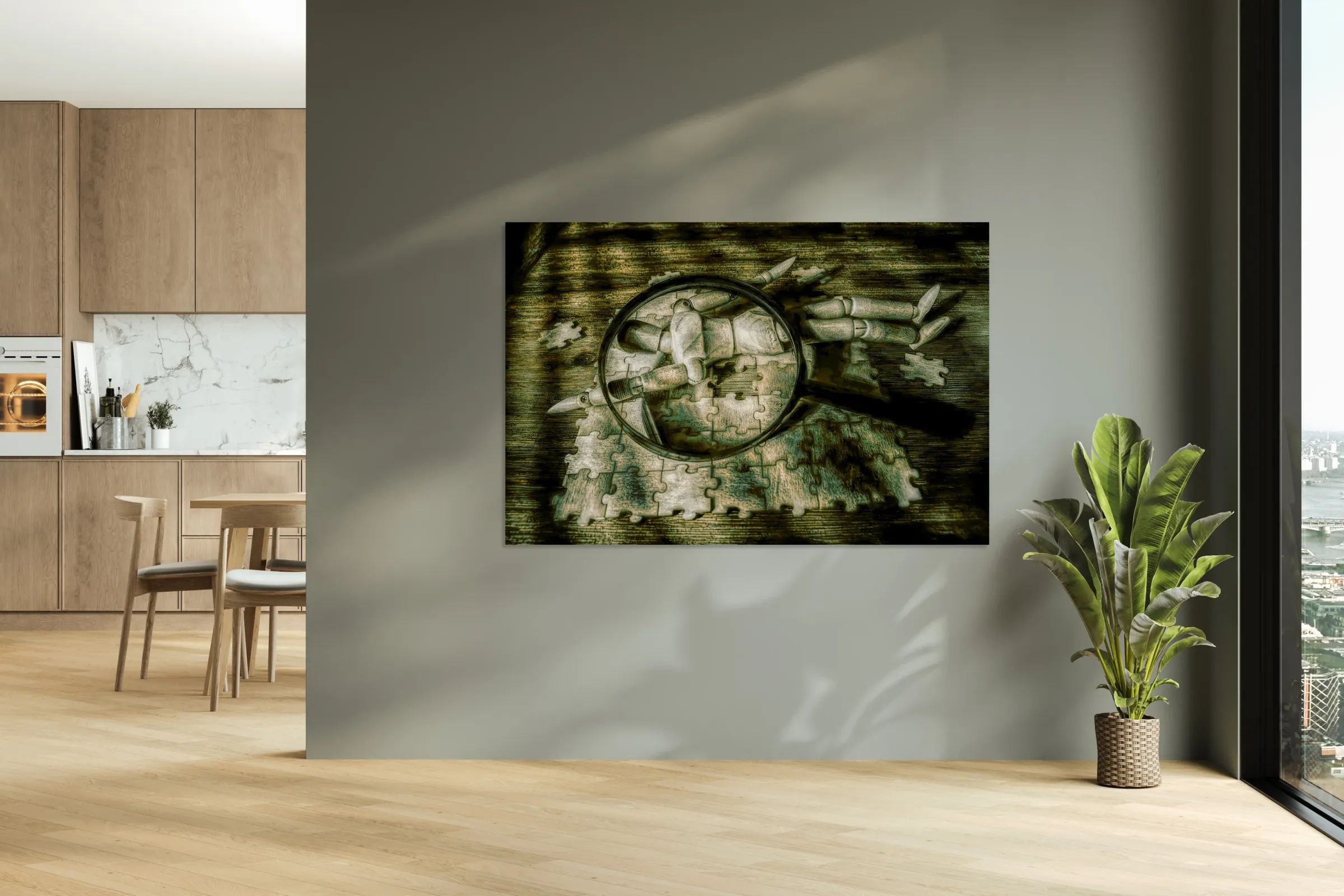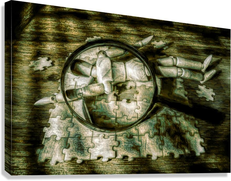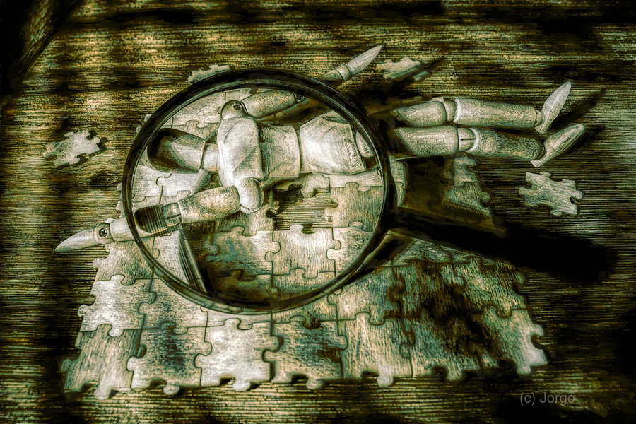 Gritty scene of unsolved crime tales with a forensic CSI still life honing in on the small details of a jigsaw whodunit