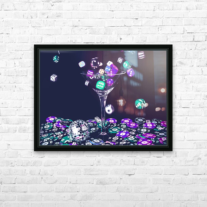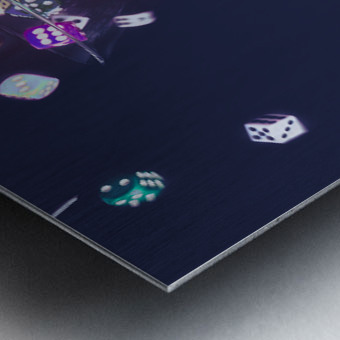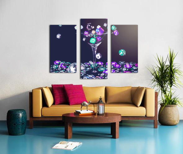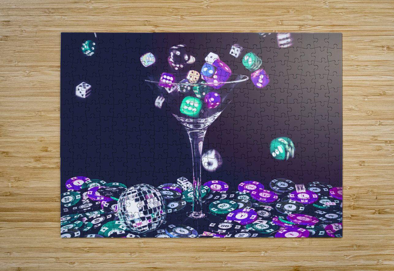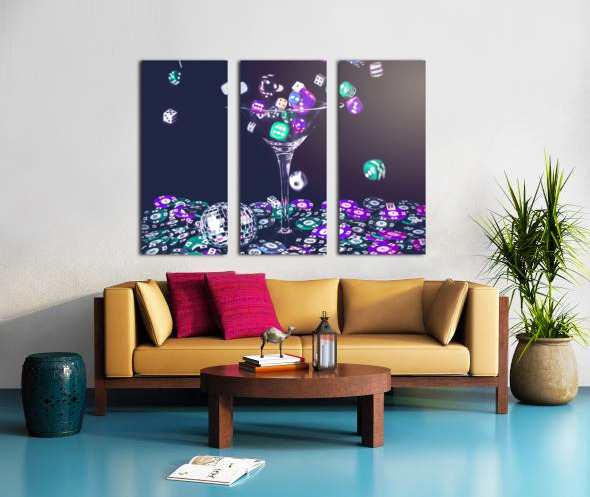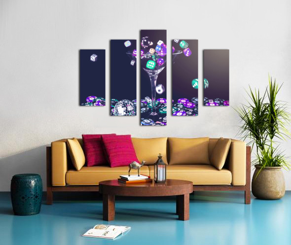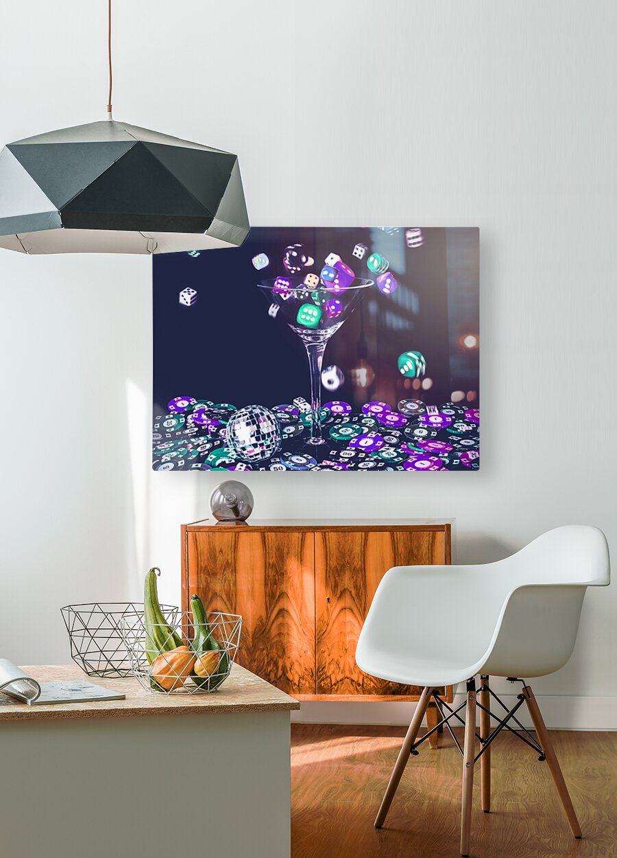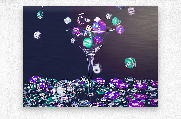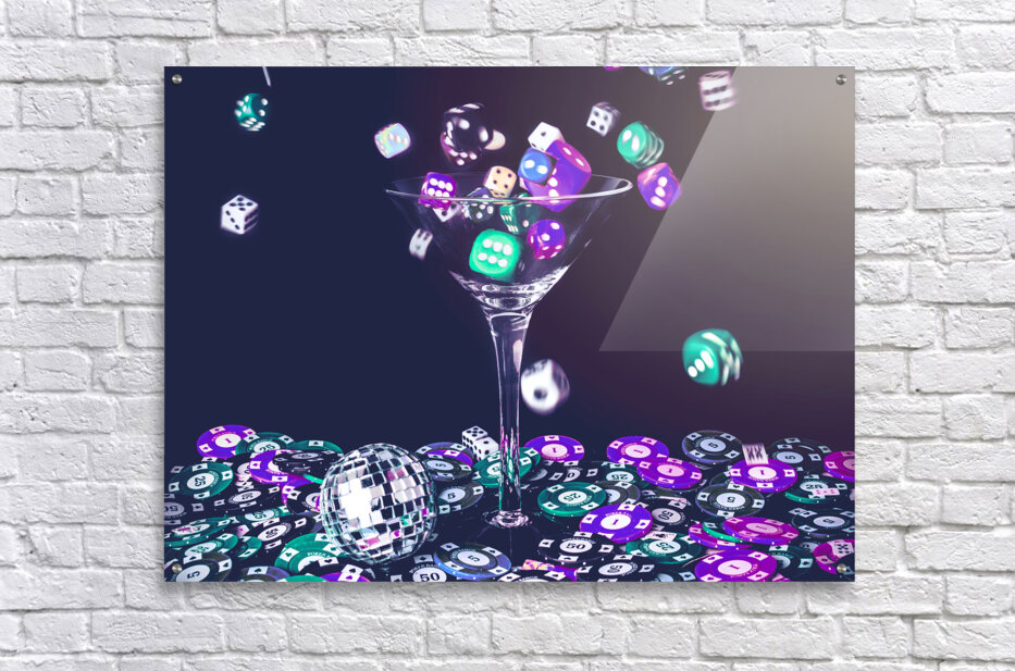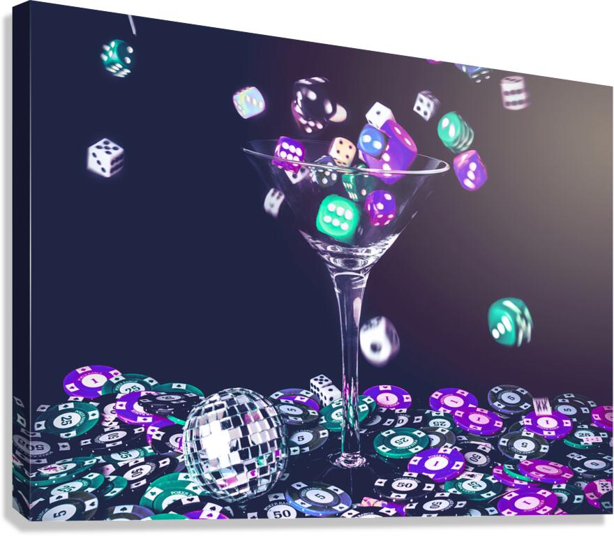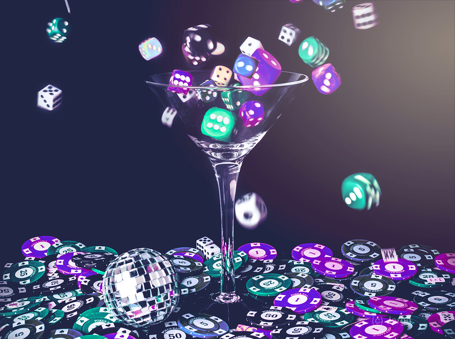 A pastel styled colour scene on a foray of dice flowing from cocktail glasses in a midnight gaming scene