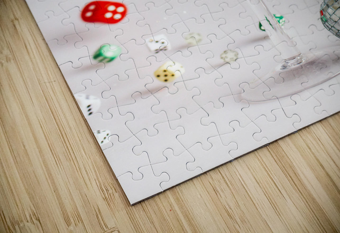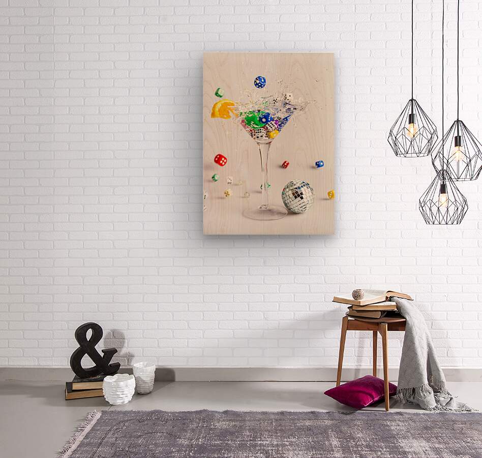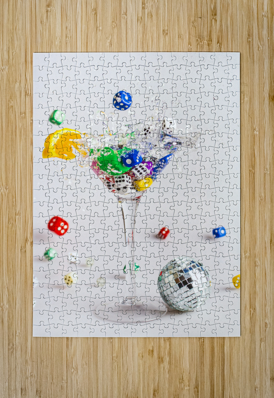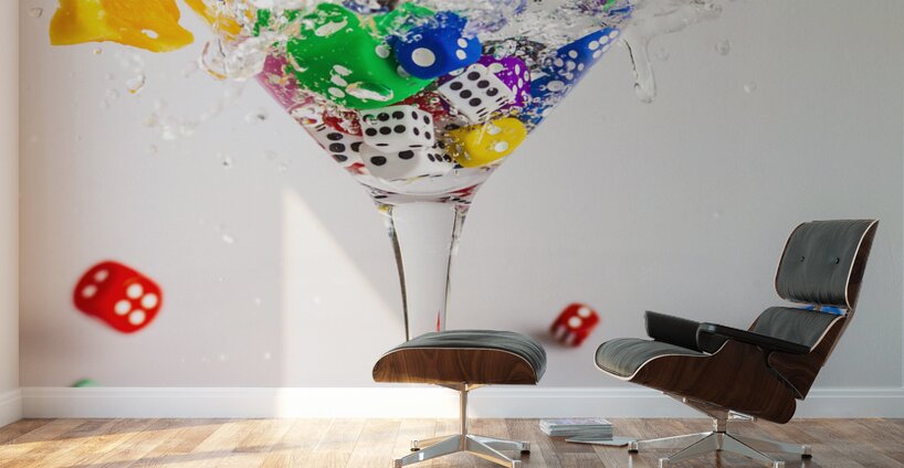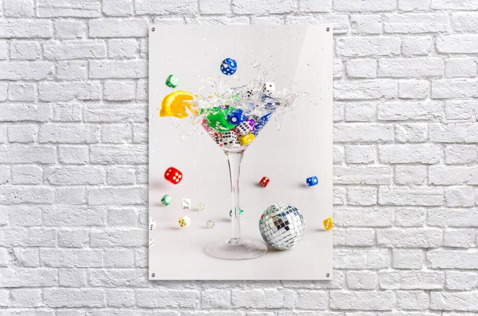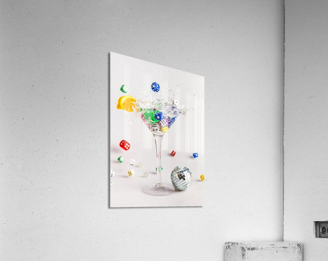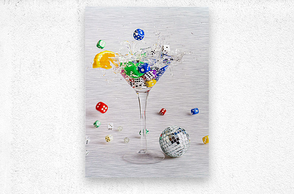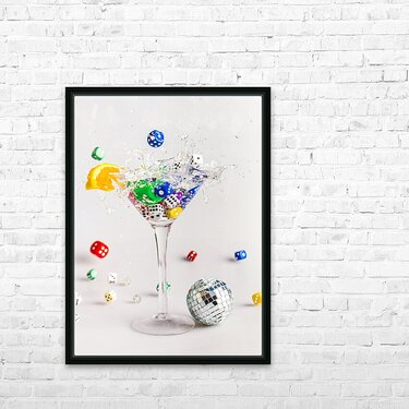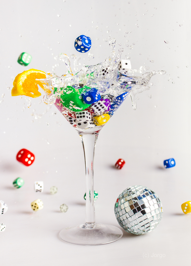 A creative scene of modern dynamics with a cocktail of gin and dice splashing out games of rolling fun