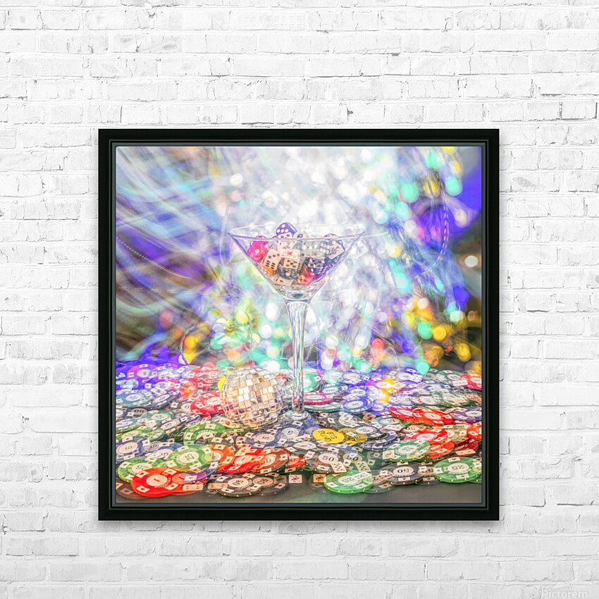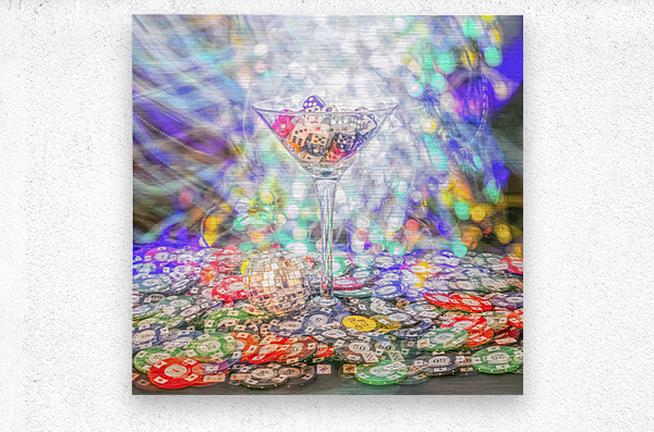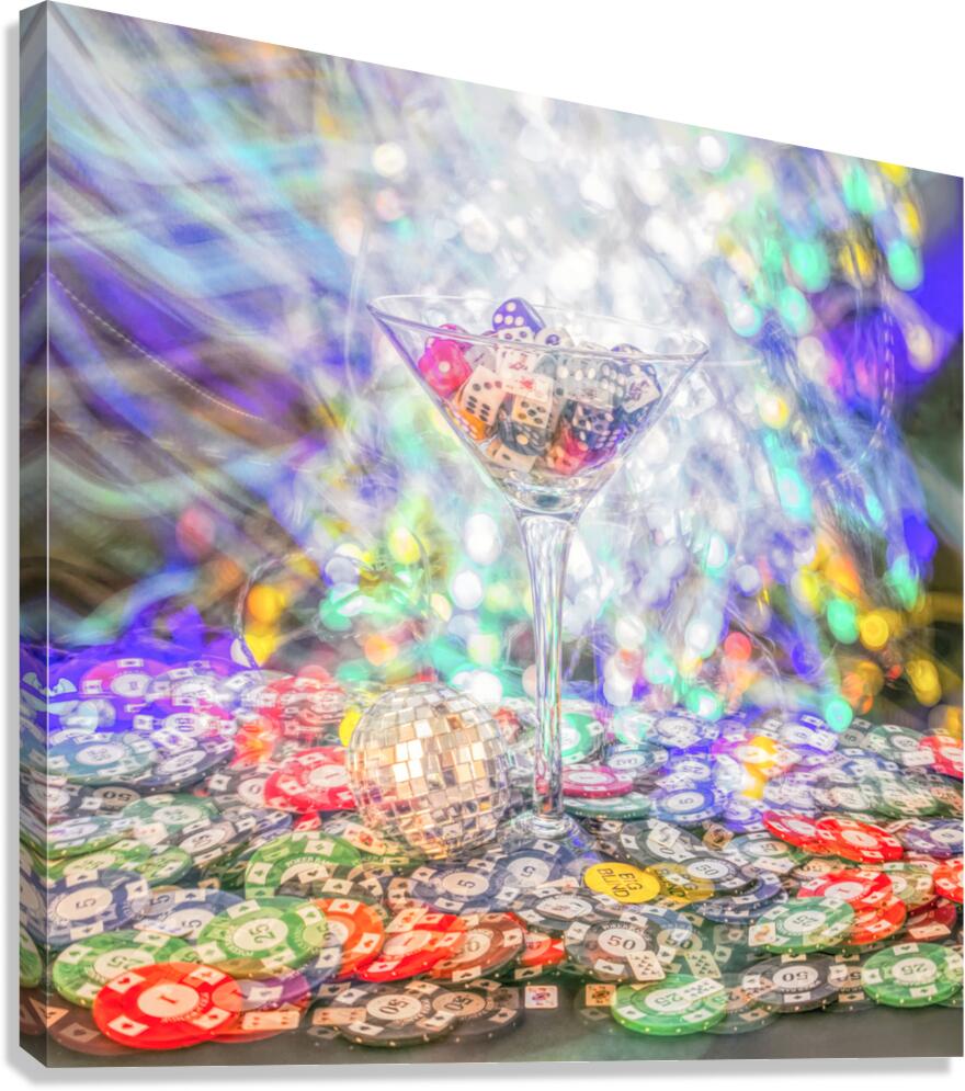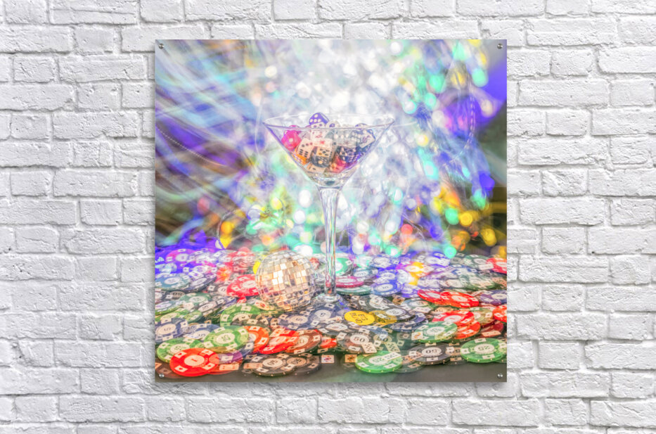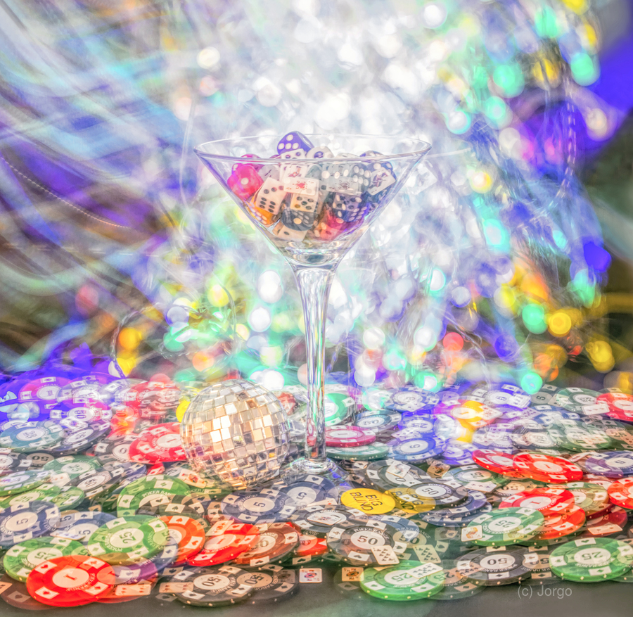 Long exposure scene of party light casino chips disco balls and gaming dice