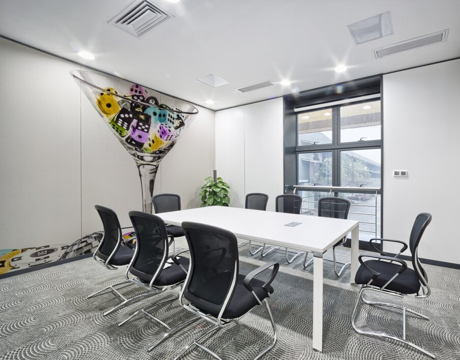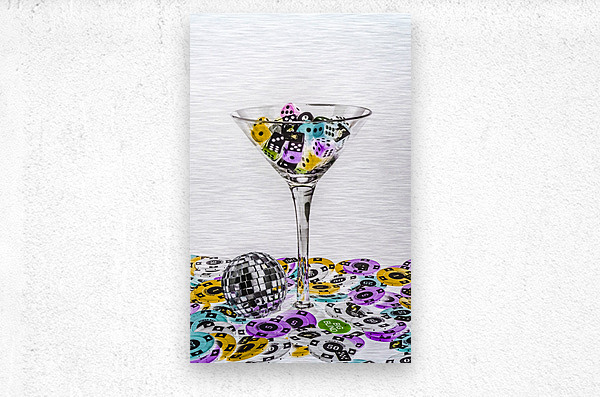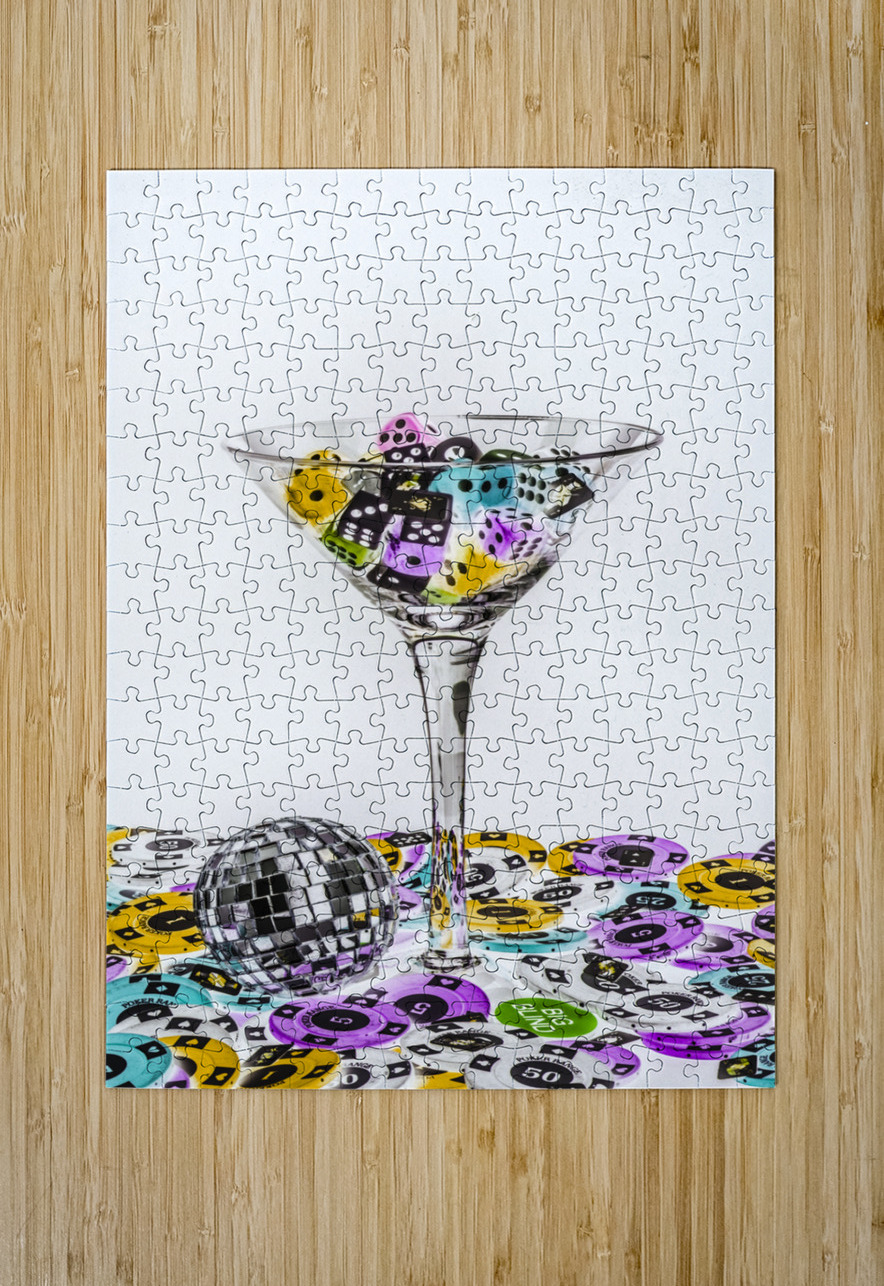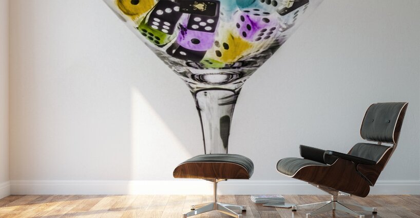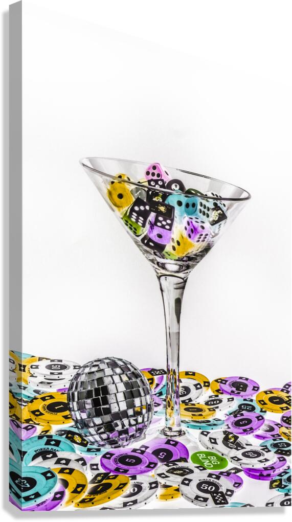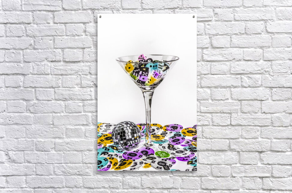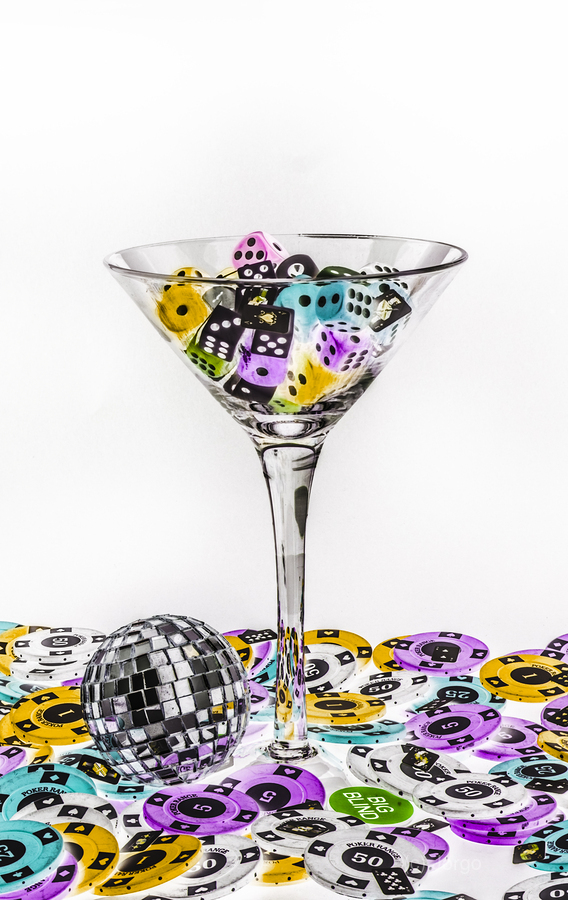 A cocktail of inversive design with dice playing cards and poker chips on white background
