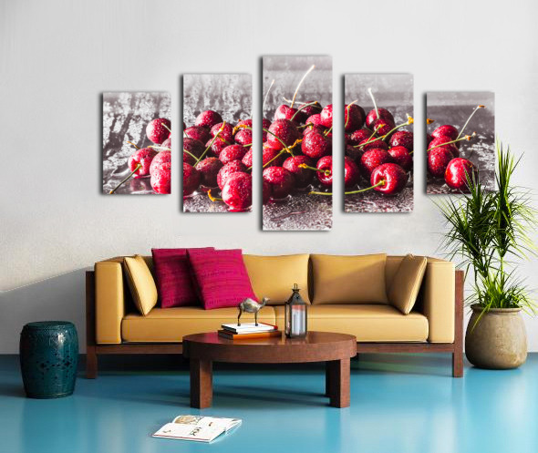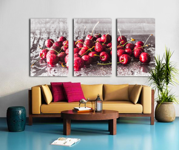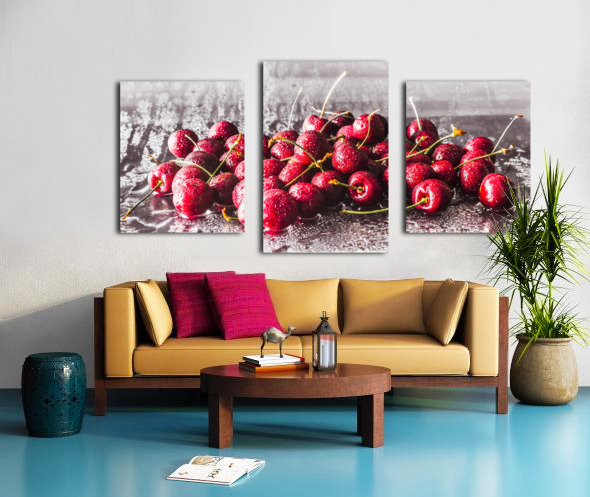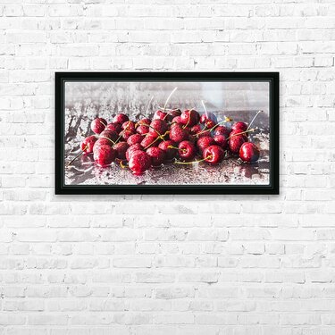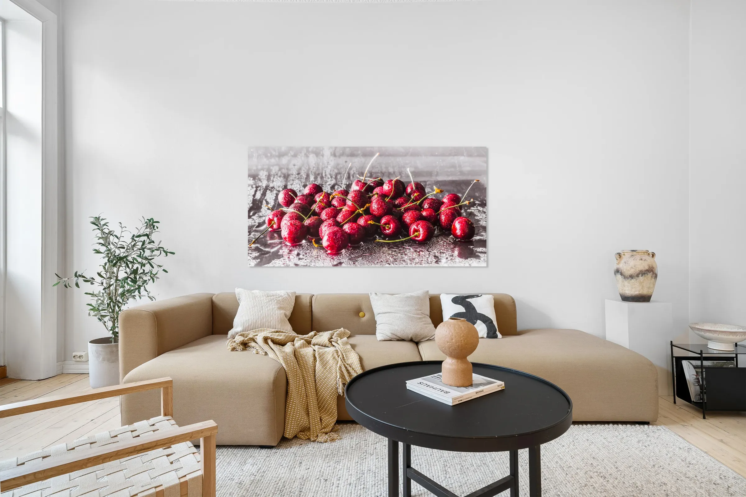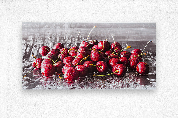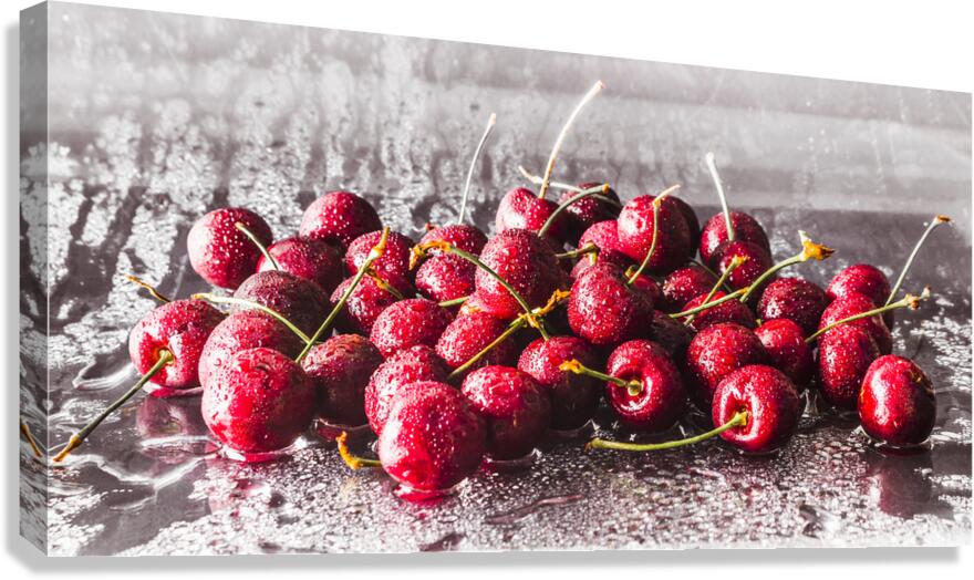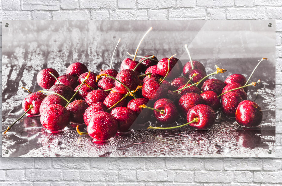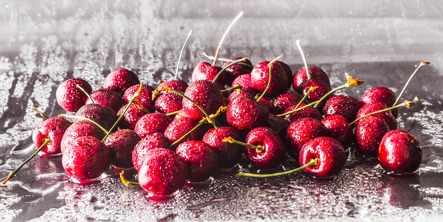 Modern kitchen fine-art on a display of freshly washed cherries soaking in the shallows of a delicious summer
