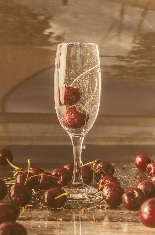 A classical take on drinks photography with a dunking of freshly made cherries inside a sparkling spritz