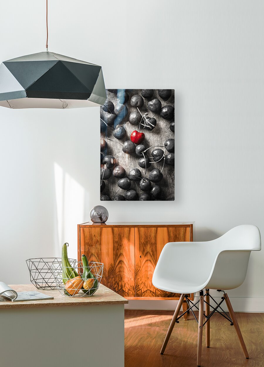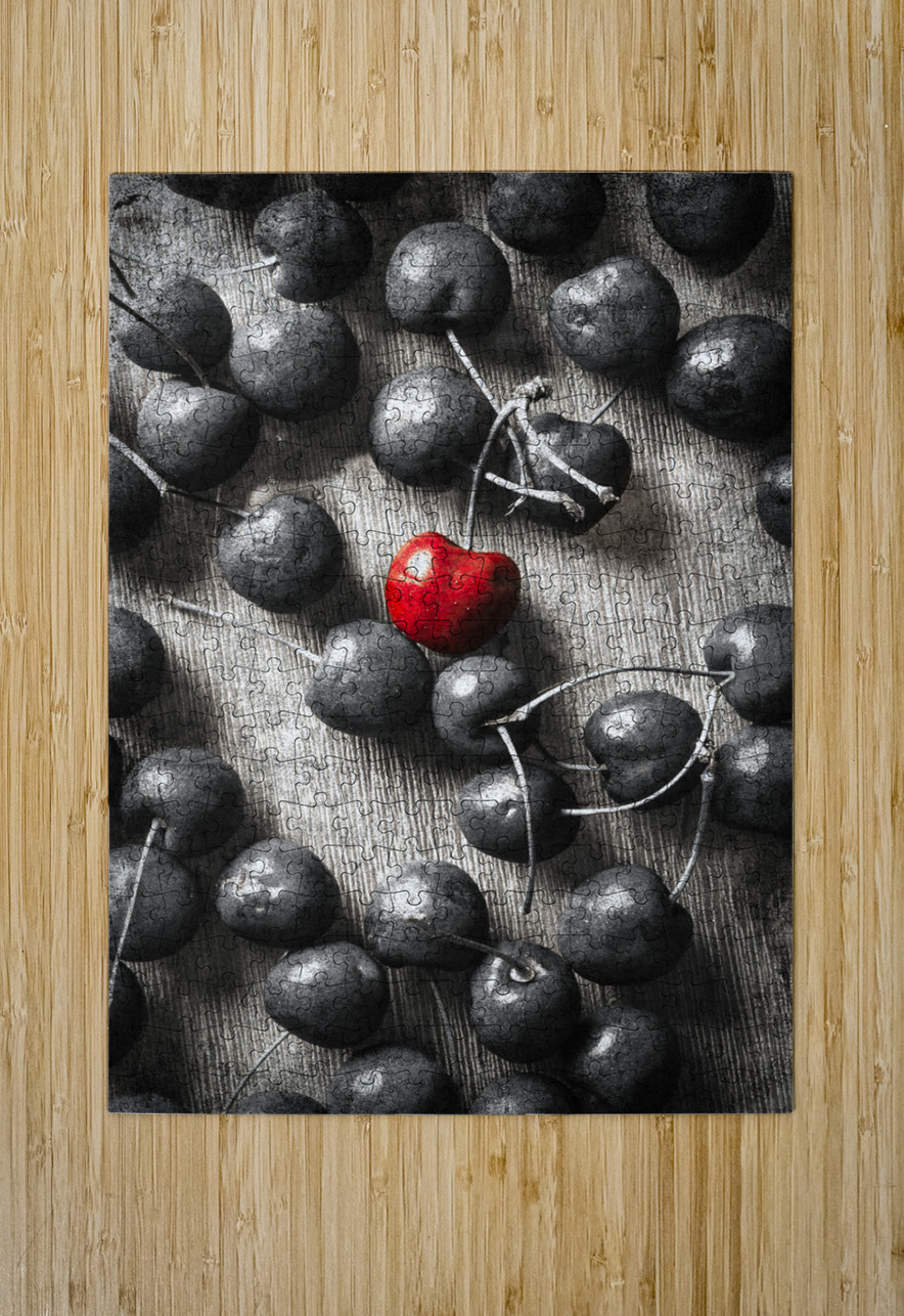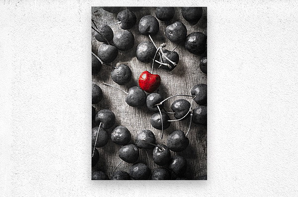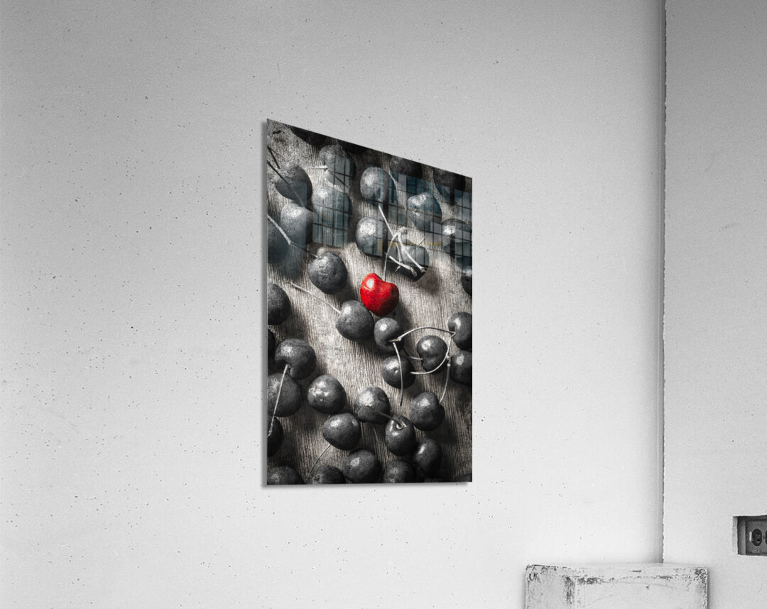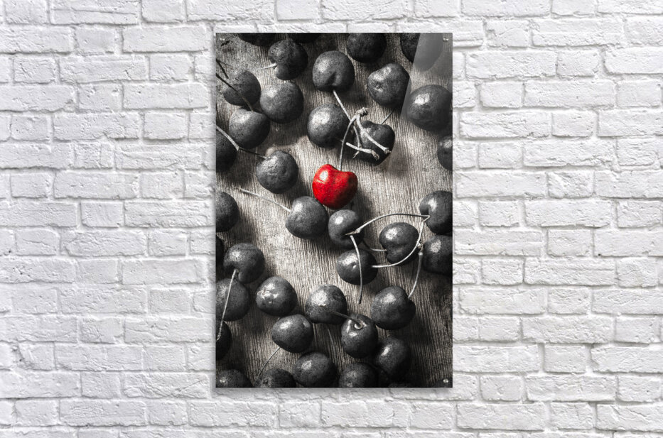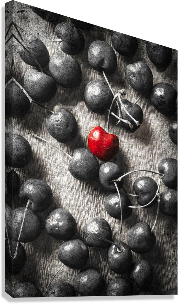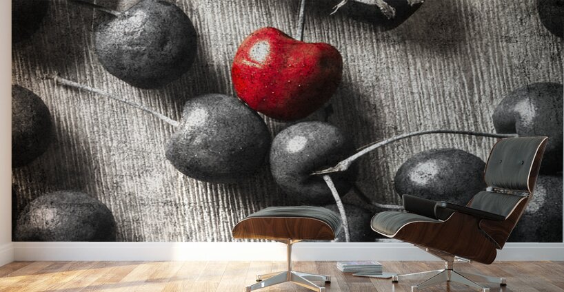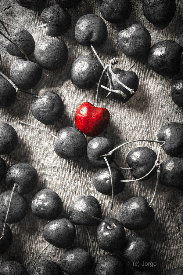 Selective colour art scene of vintage cherries and the central highlight. Cherry picked