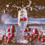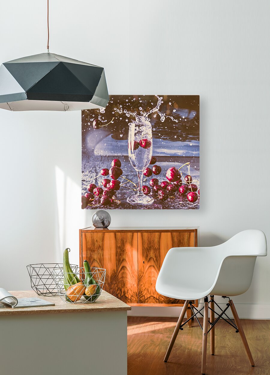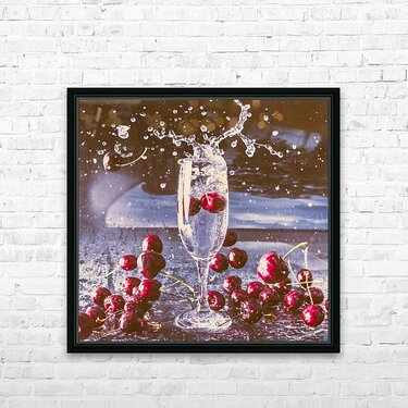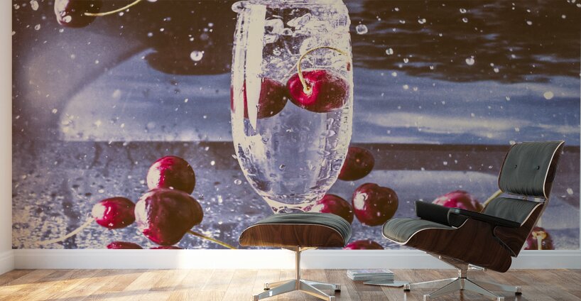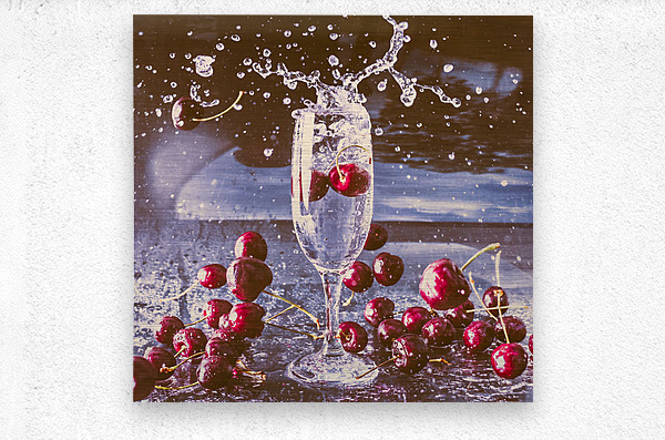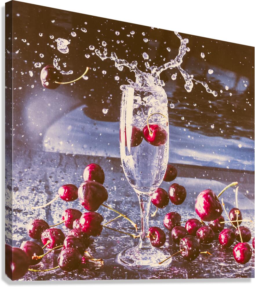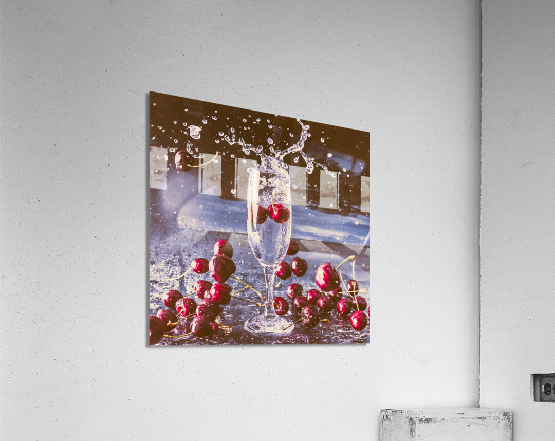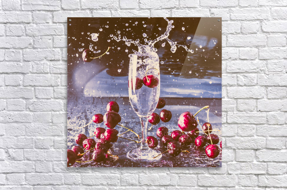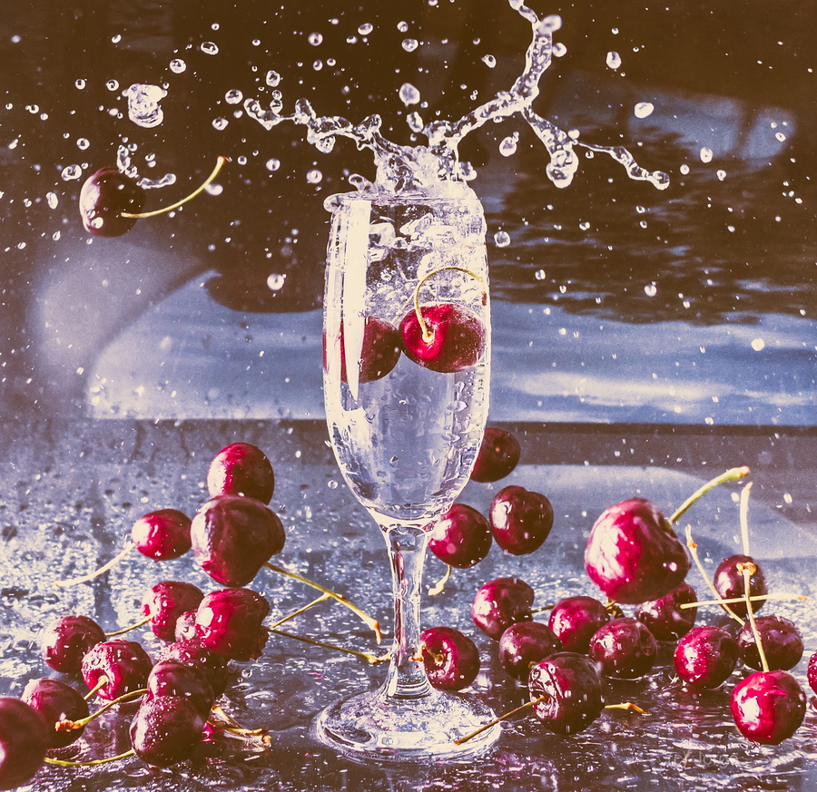 An action capture of a tumbling of cherry delights falling and splashing inside a party scene of foodie celebrations