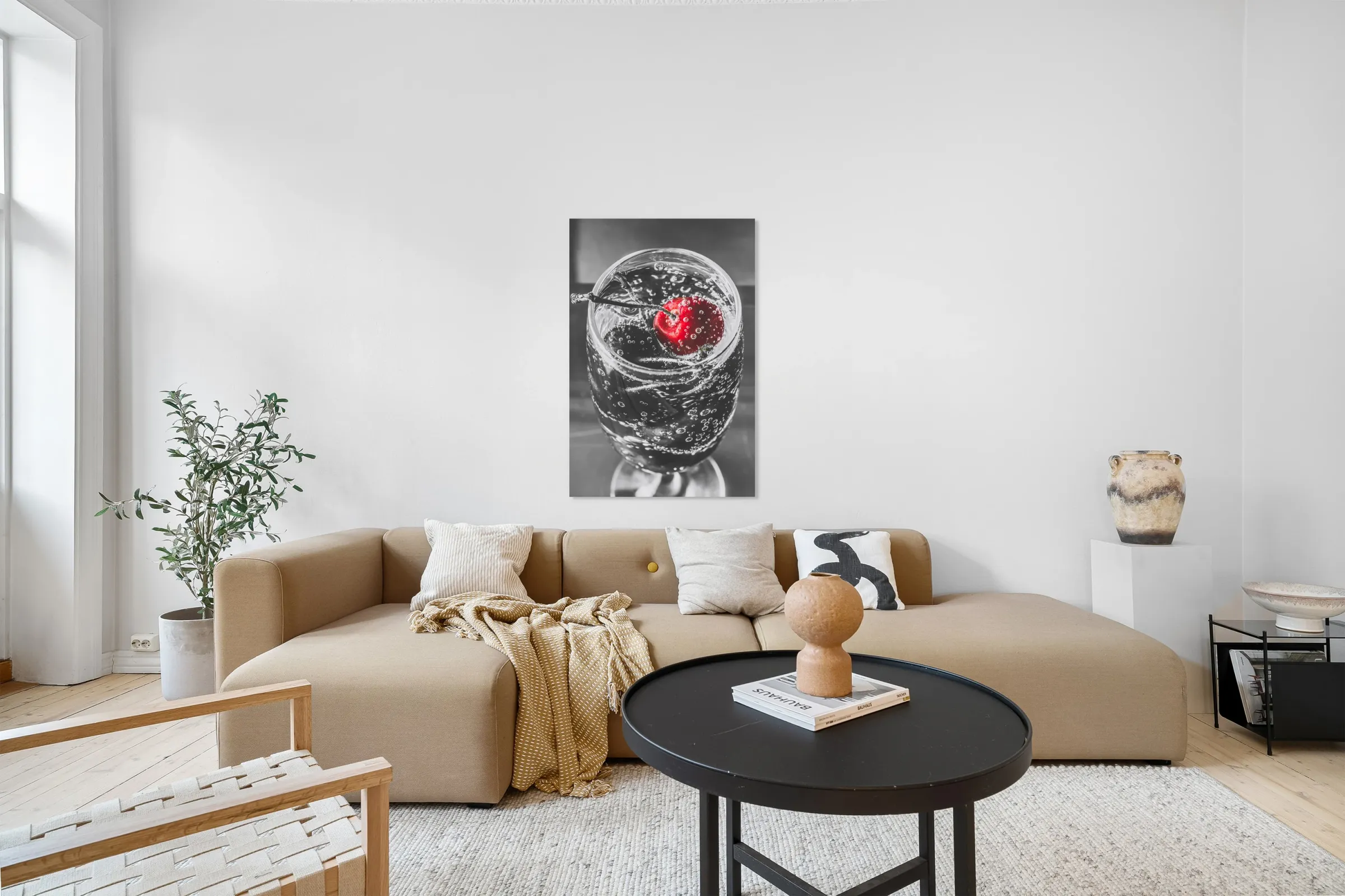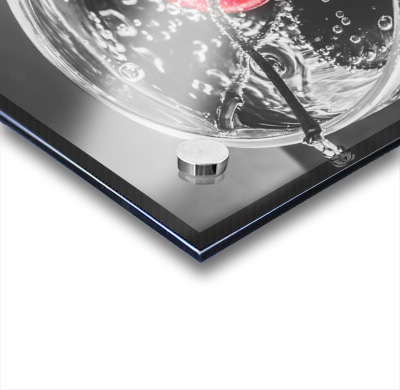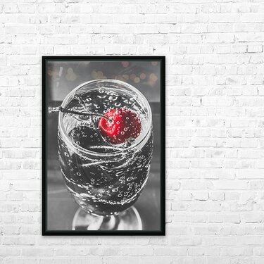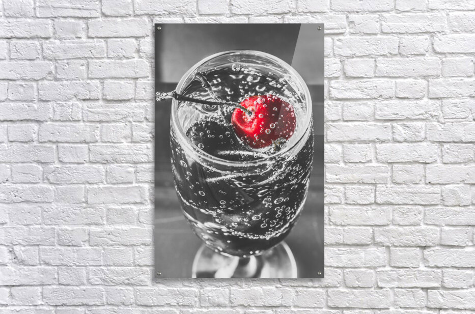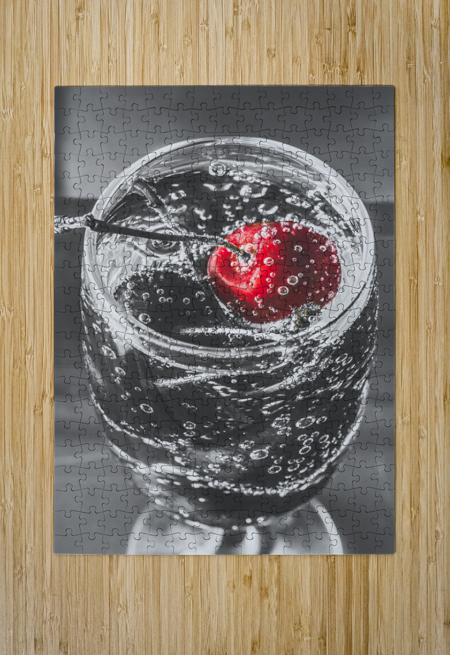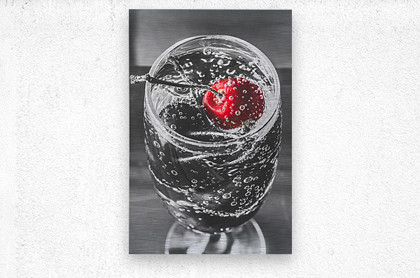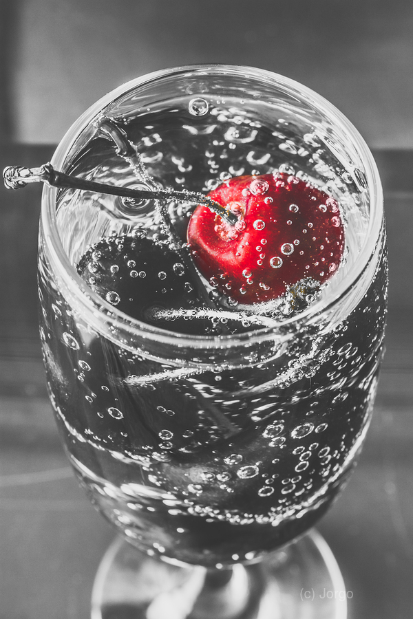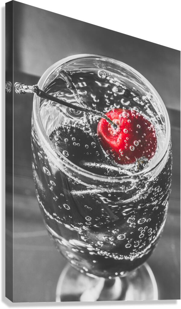 A highlight of red revelry with a highlight cherry floating in a black and white scene of sparkling elegance
