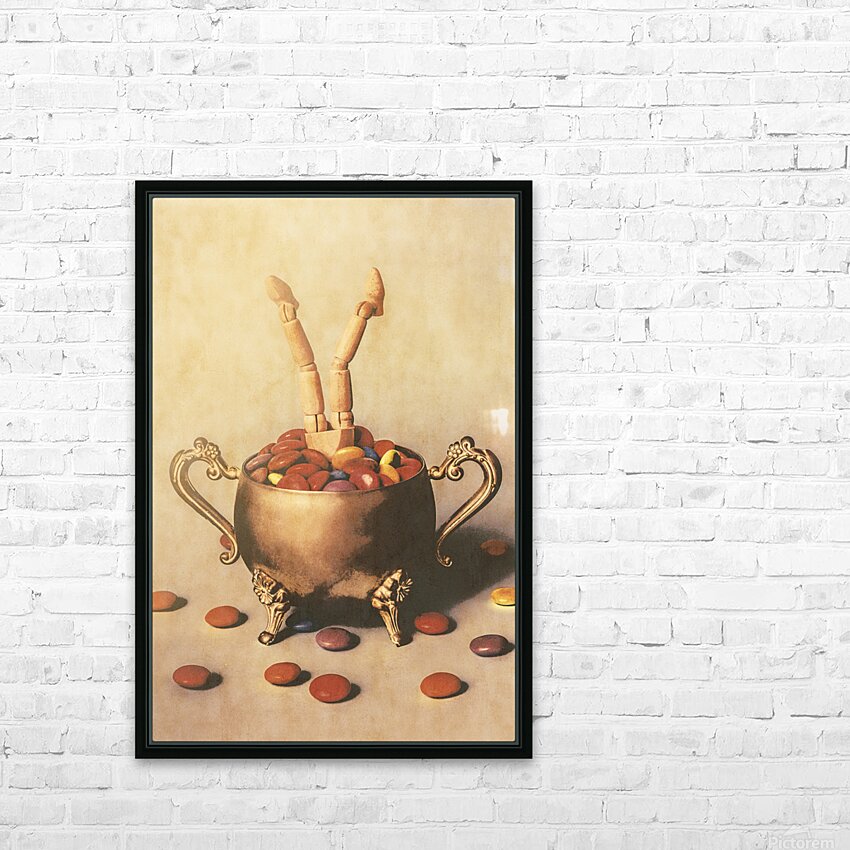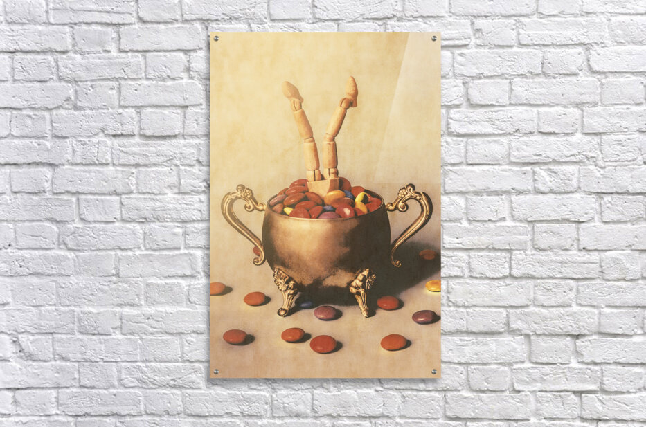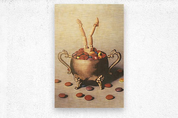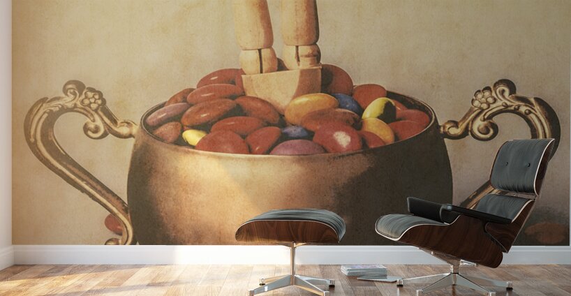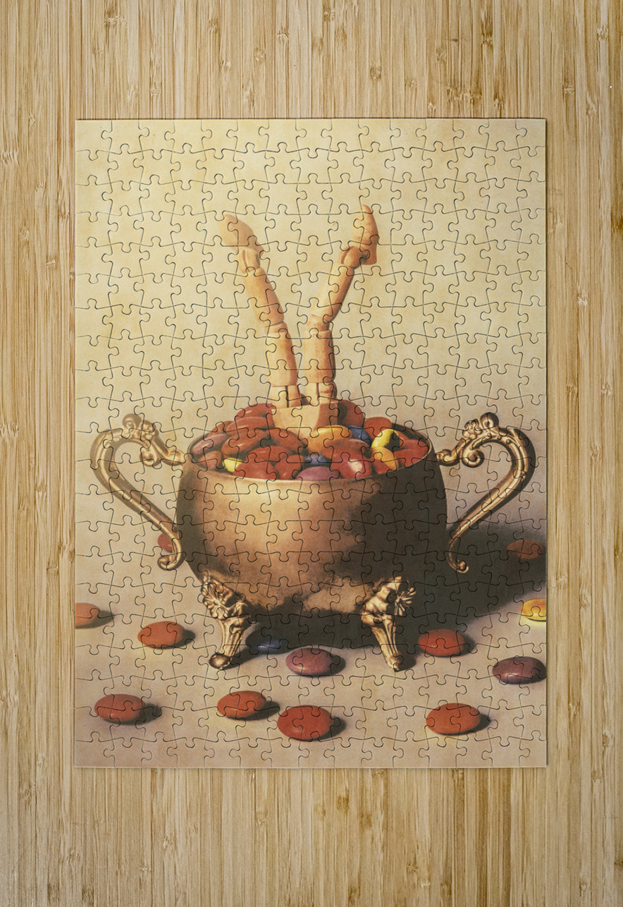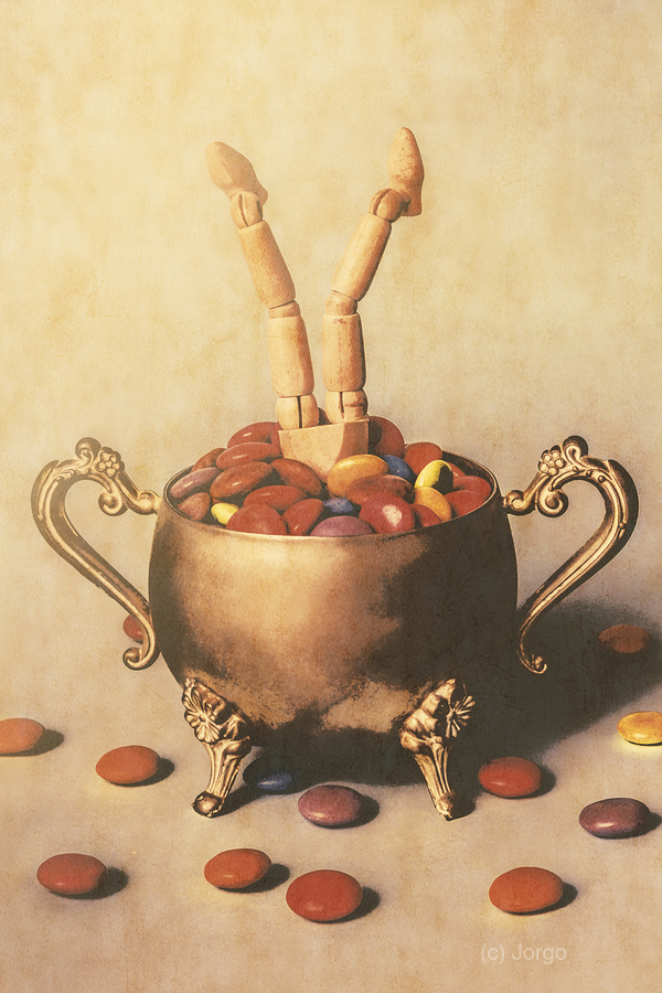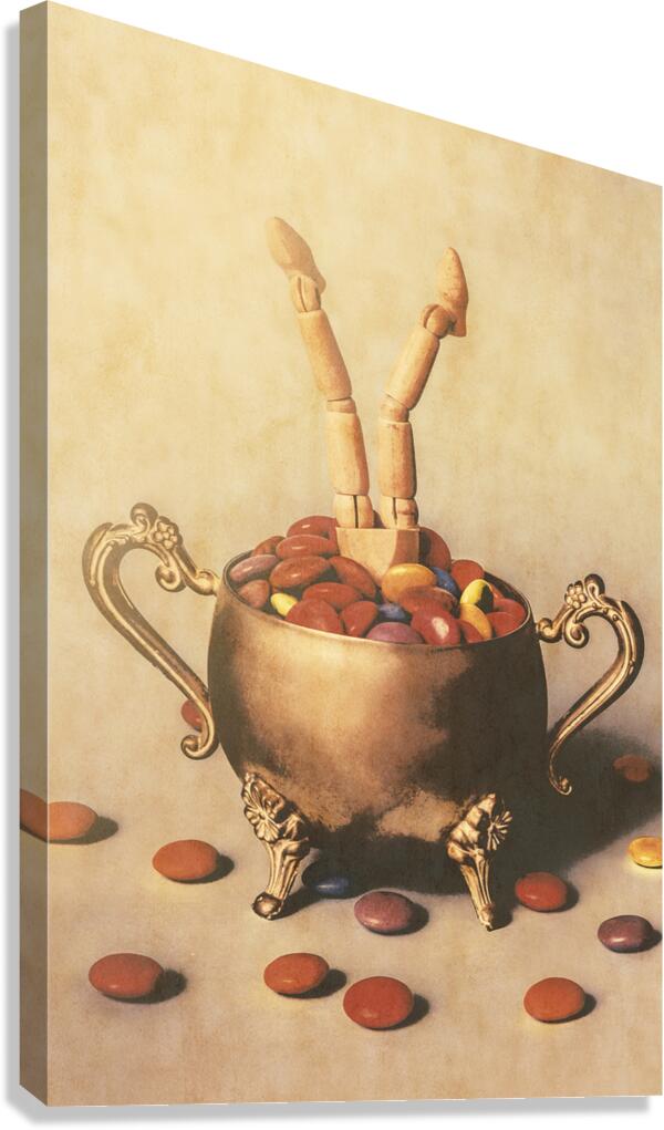 Old ornate scene of high tea treats with figurative art doll driving into a candy bowl of smarty sweets