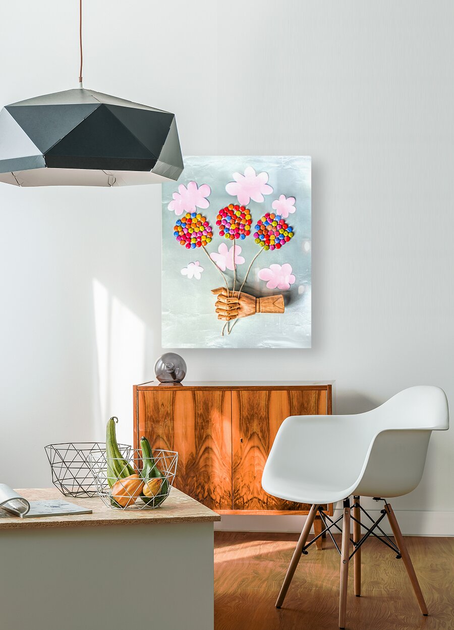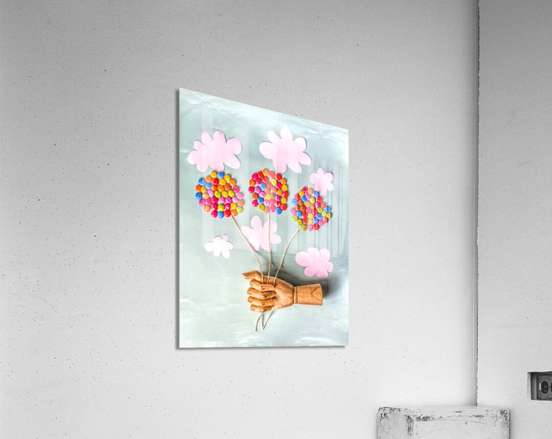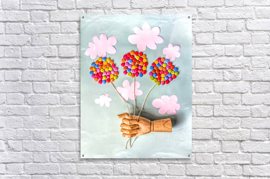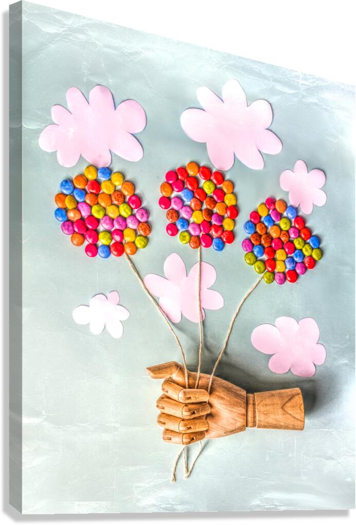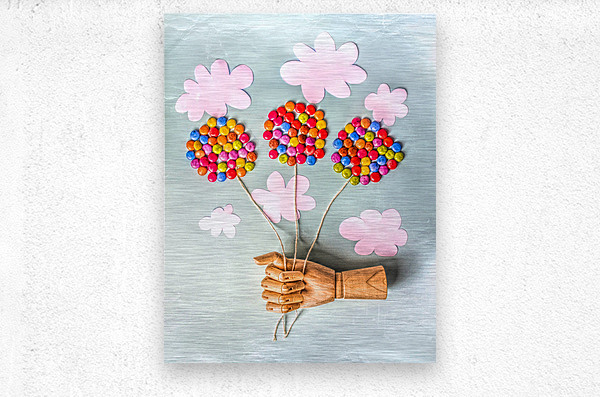 Surreal scene of make believe play with wooden models handy and balloons made from candy swaying away in creased skies so dandy