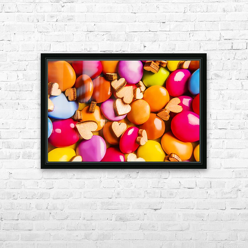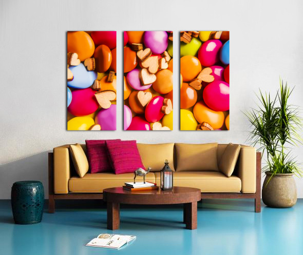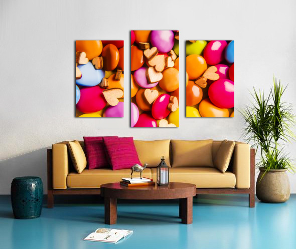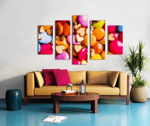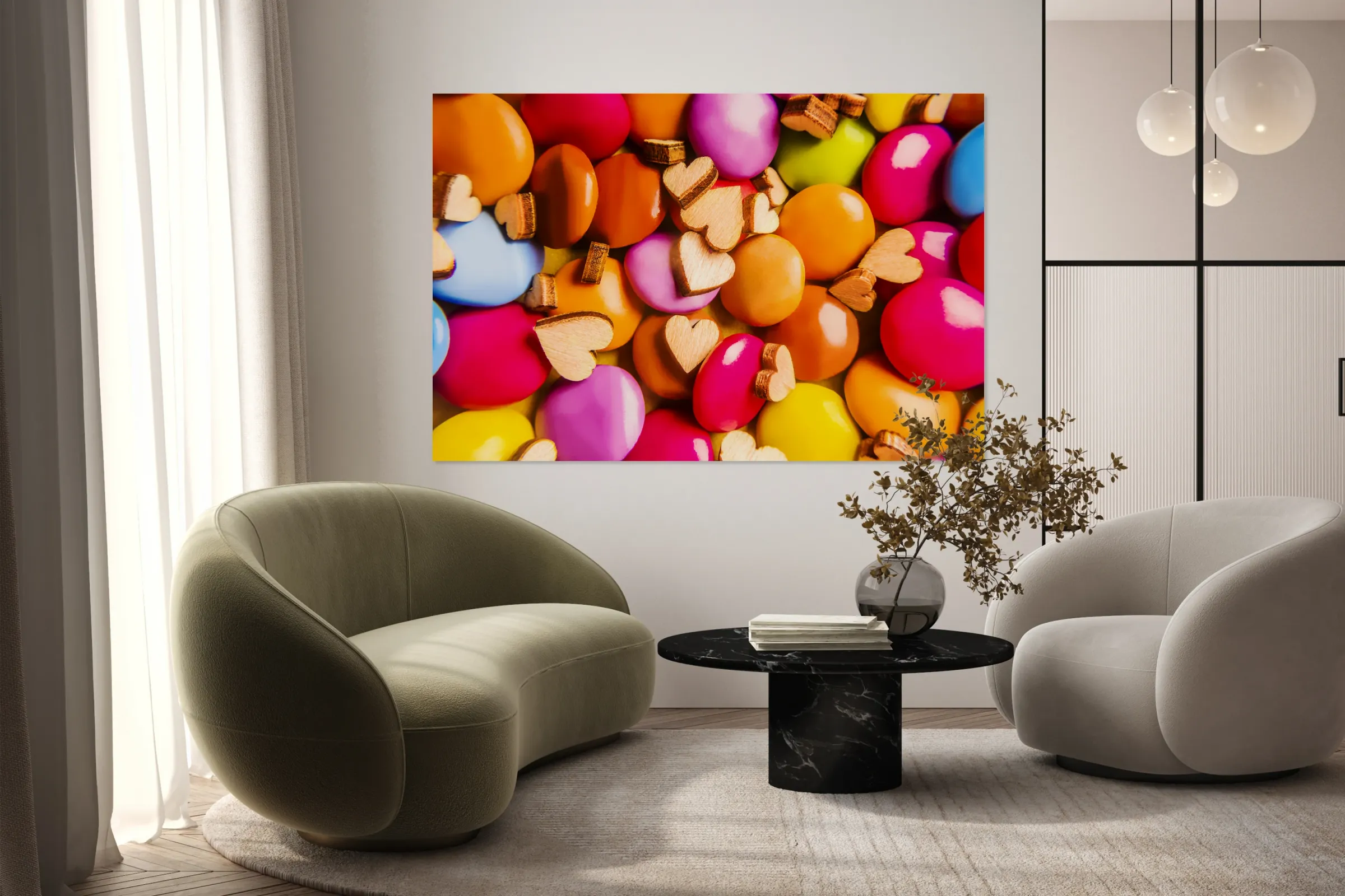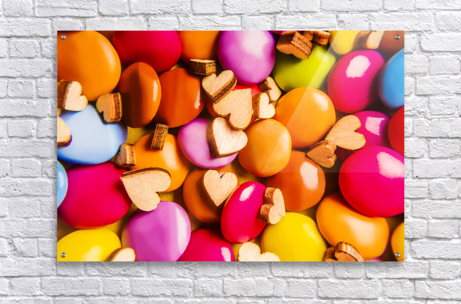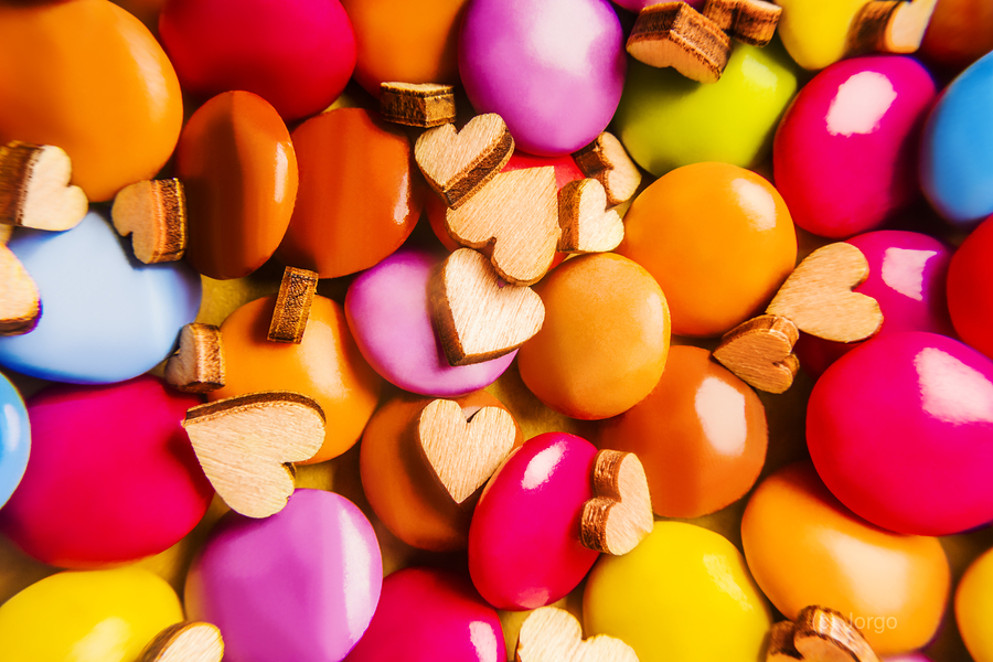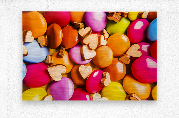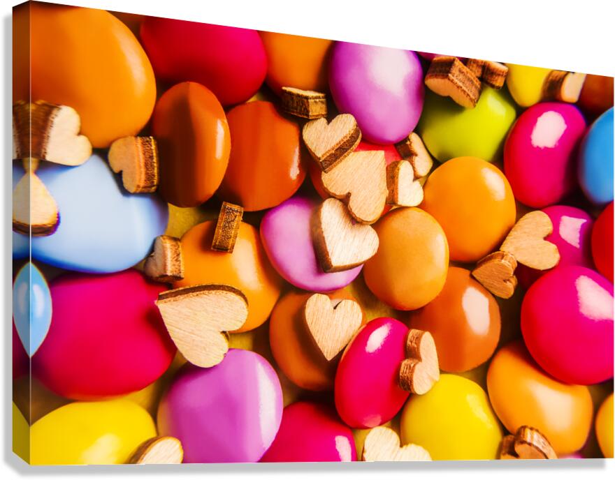 Sweet syndication of sugary romances with chocolate candy and colourful wooden hearts merged in abstraction