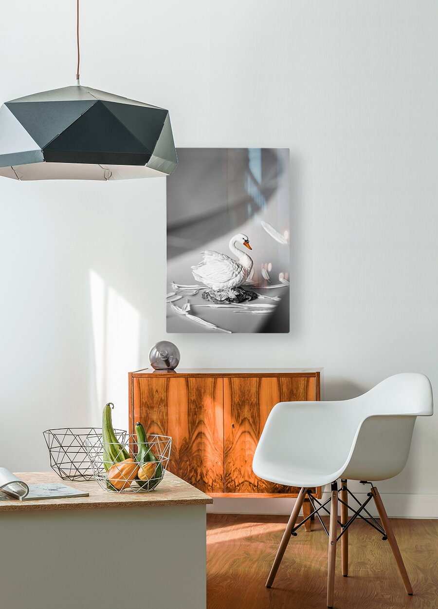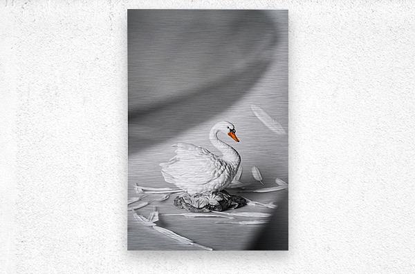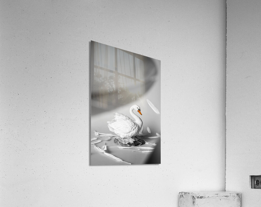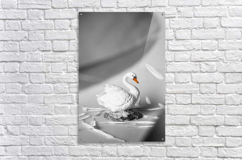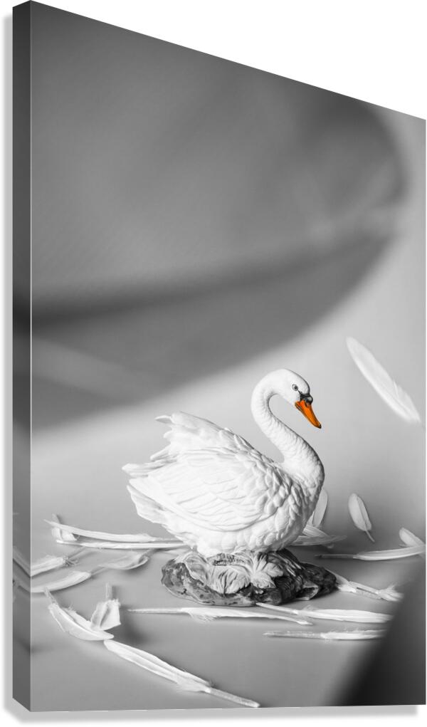 Obscured by floating feathers a lovely white swan figurine is surrounded by white quills creating a serene scene of peacefulness