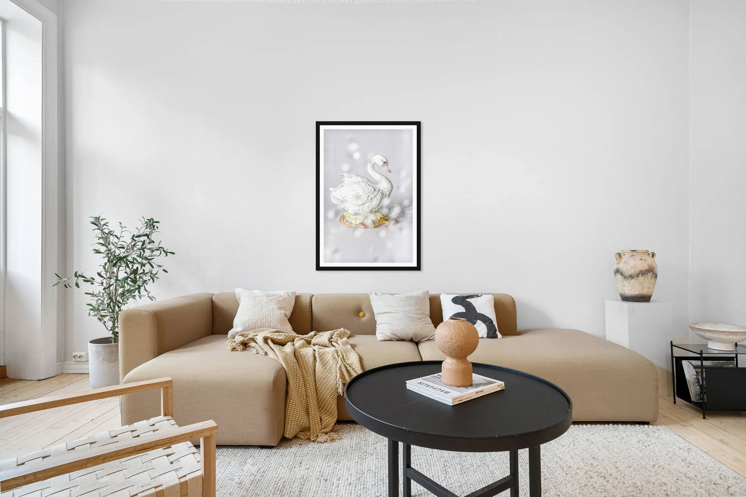 A gracefully crafted white swan stands out against a soft water blurred foreground in purity and elegance