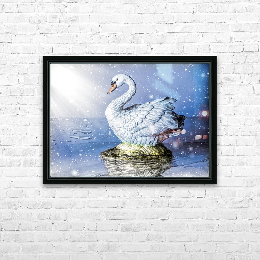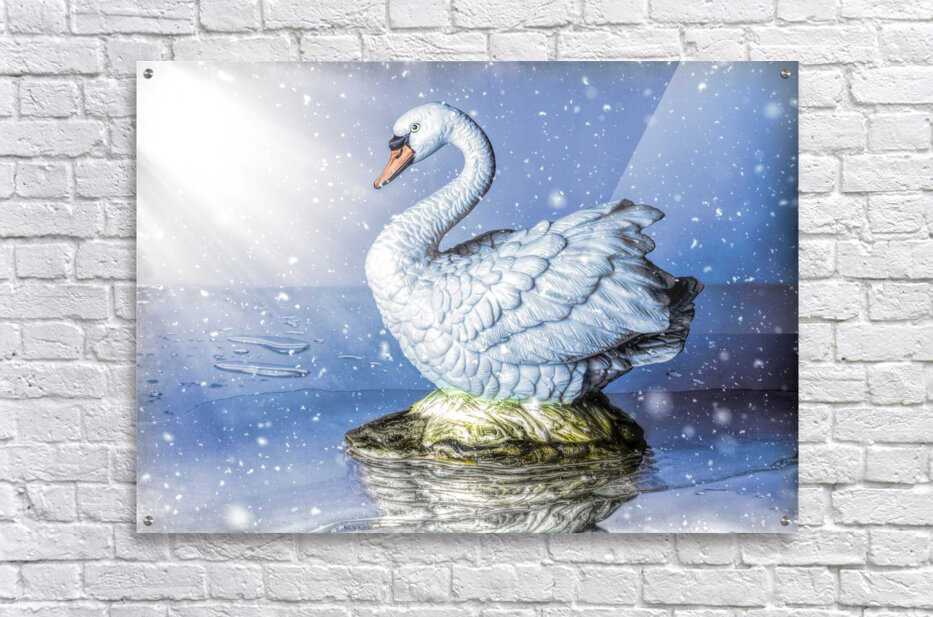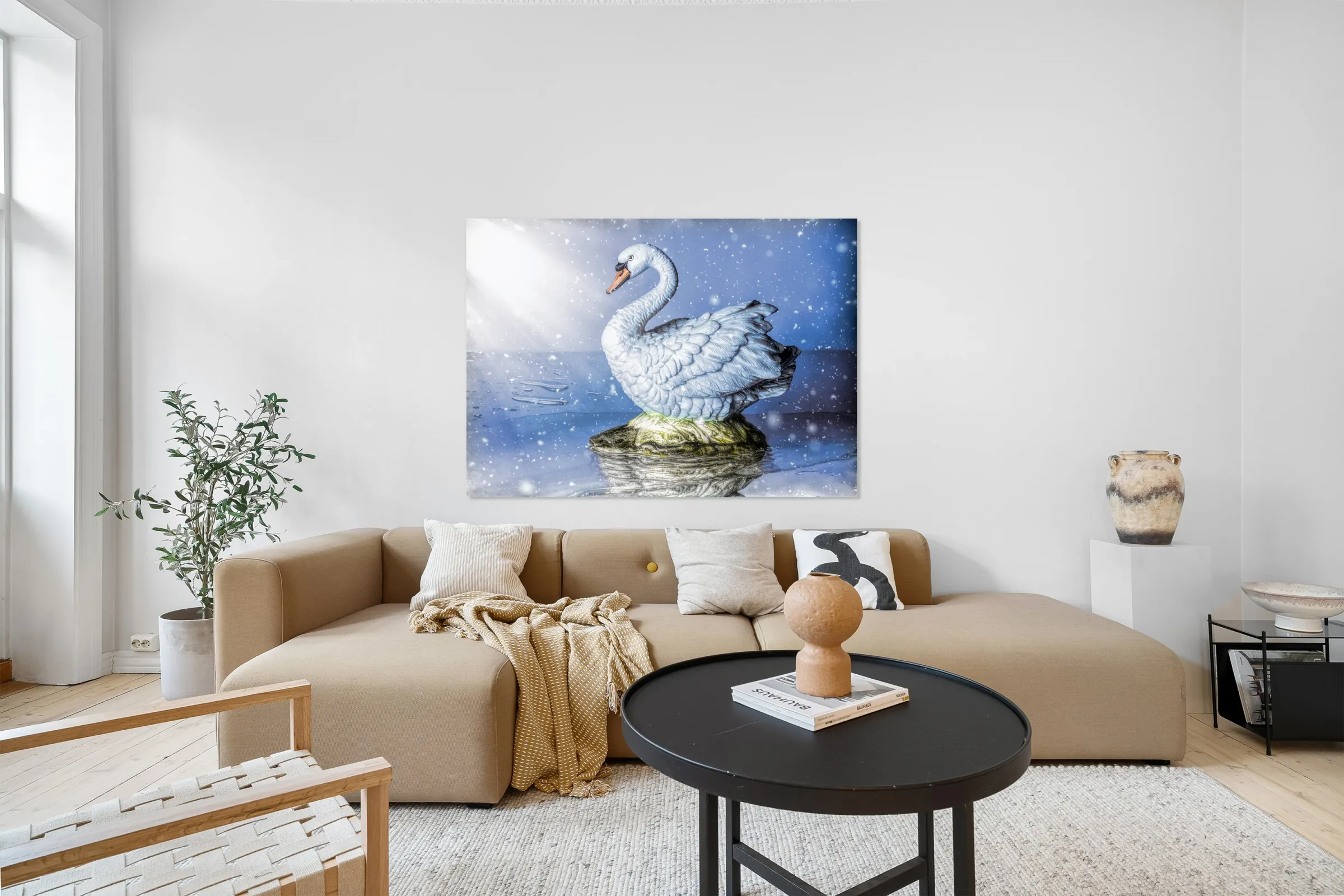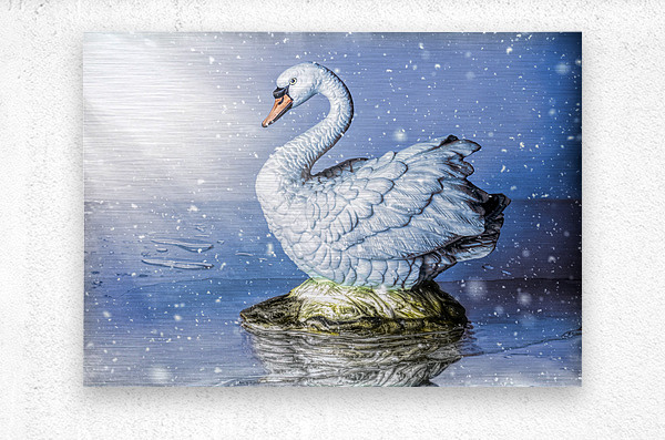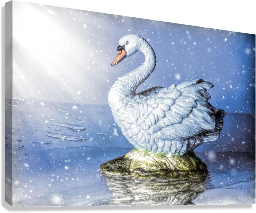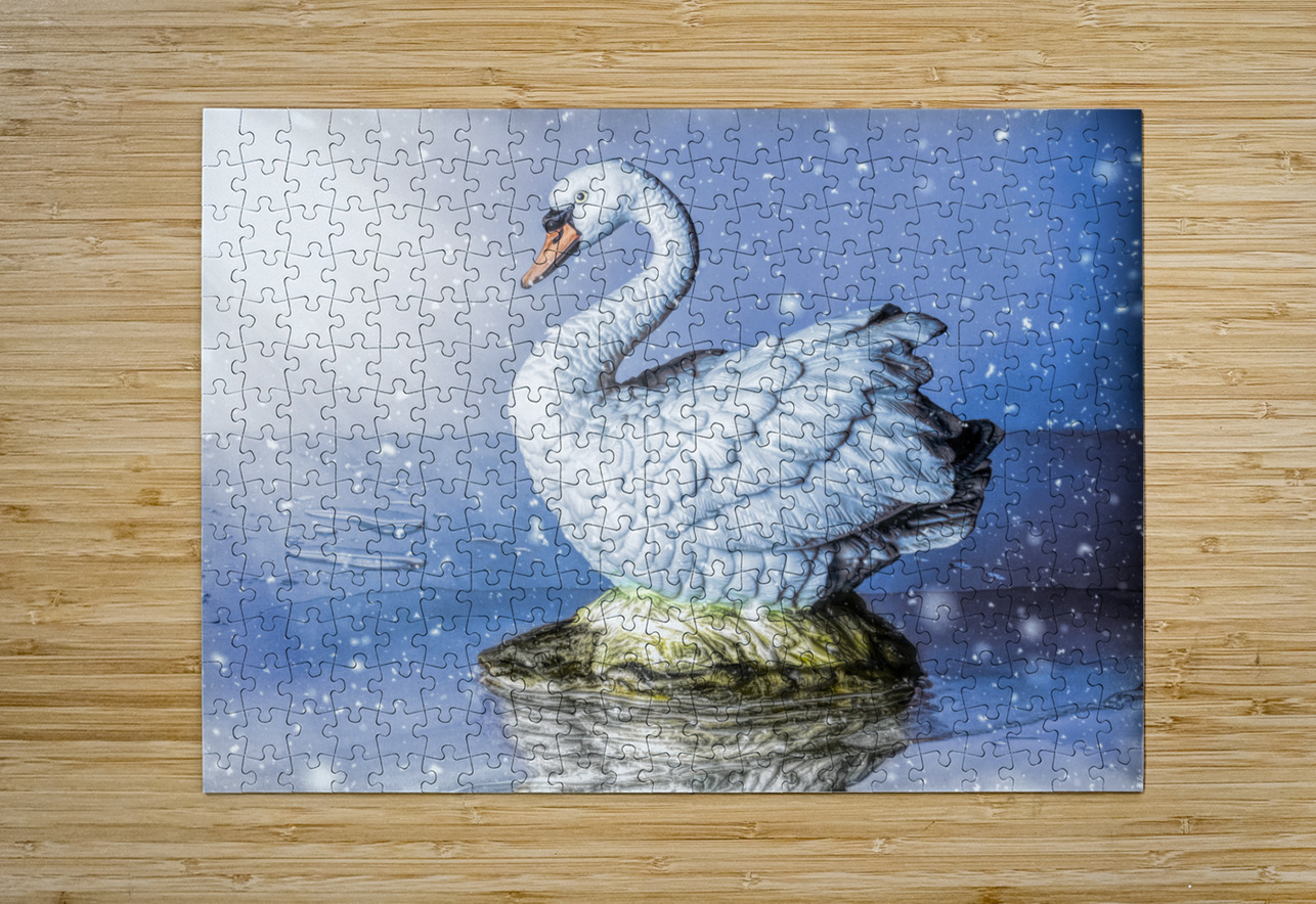 Snowing winter scene with porcelain swan on a frozen river of snow and ice