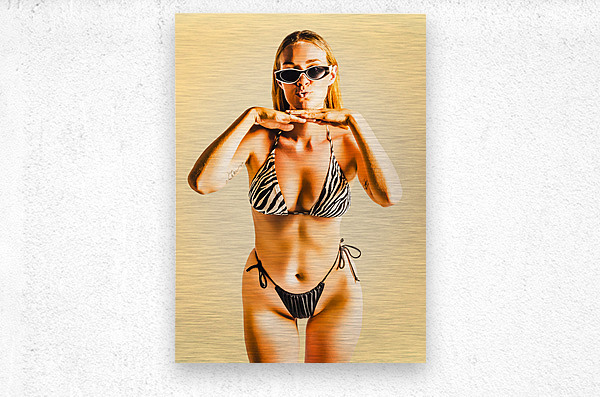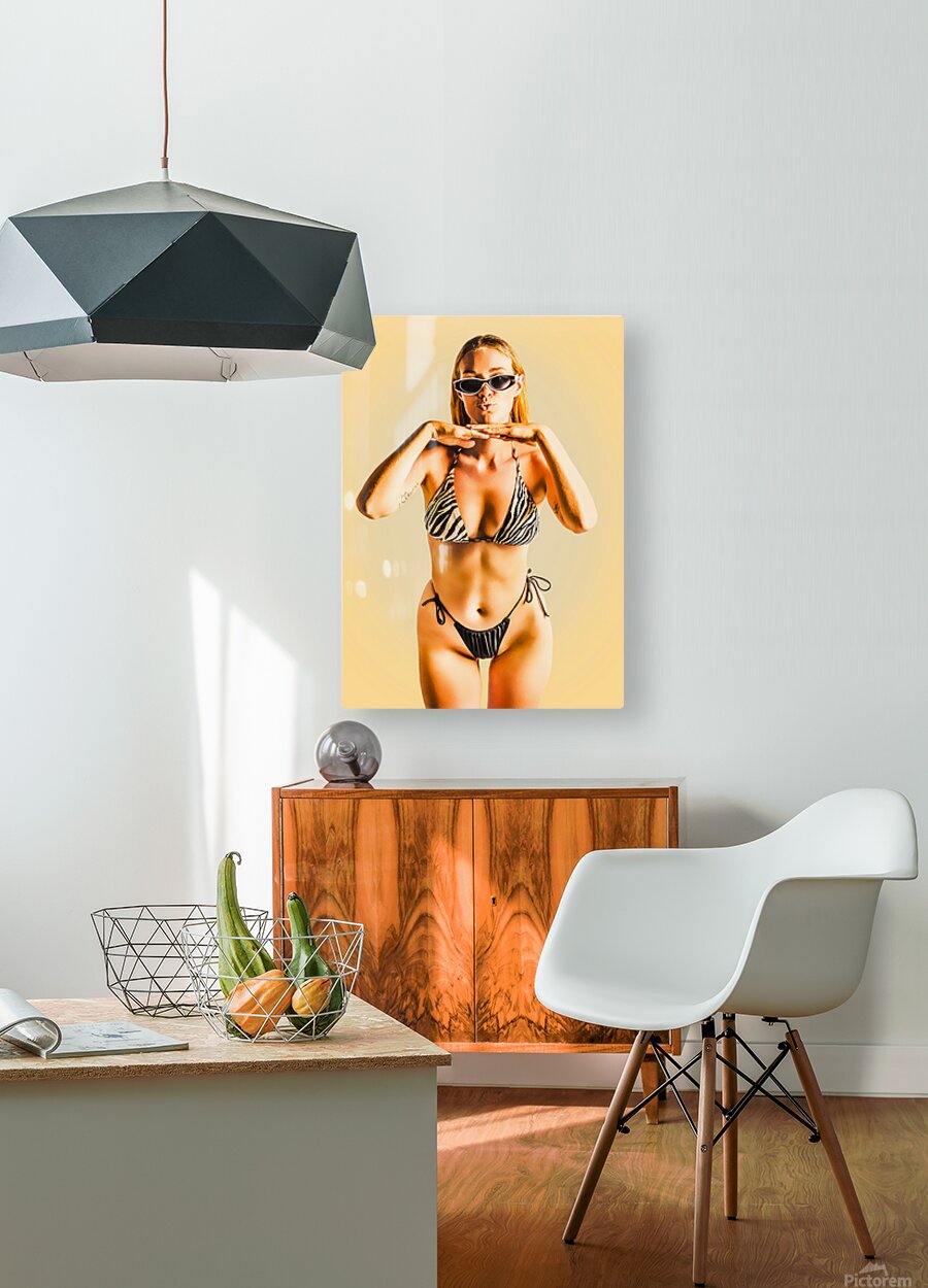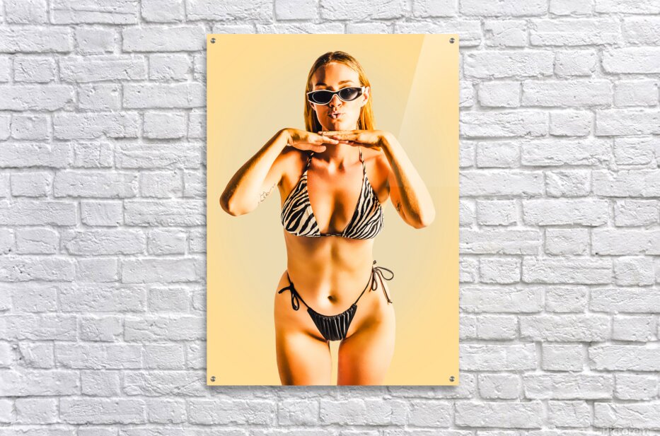 Tanned bikini woman looking pretty in retro swimwear and shades on summertime yellow background