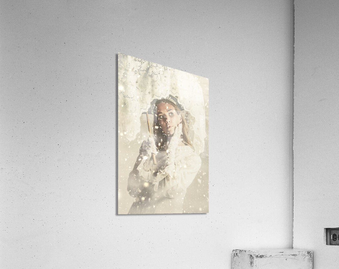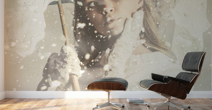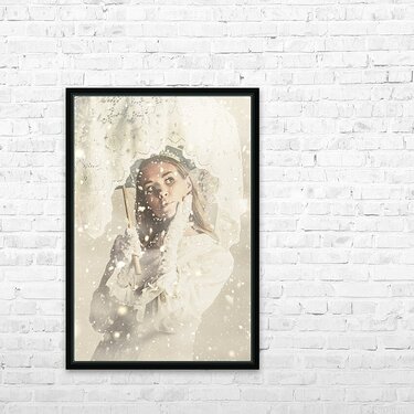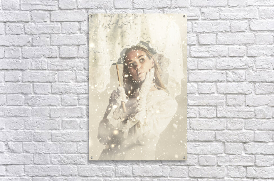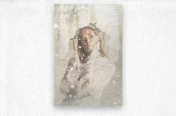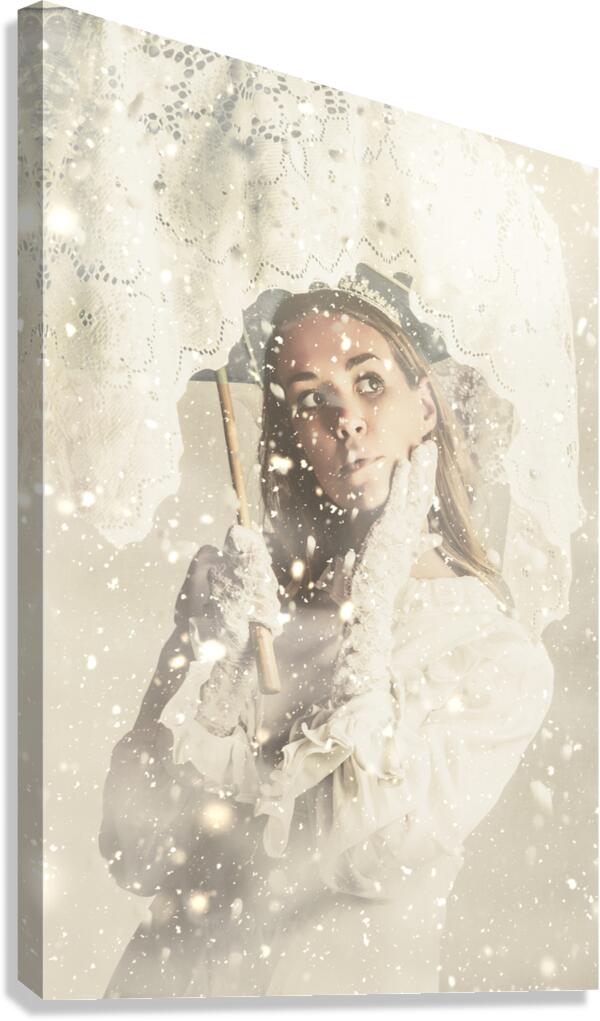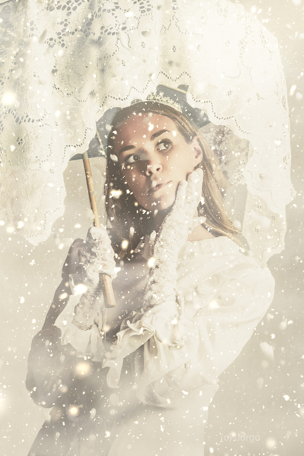 Dream scene from royal winters as a crowned princess watchfully wonders in wondrous winter wonderland