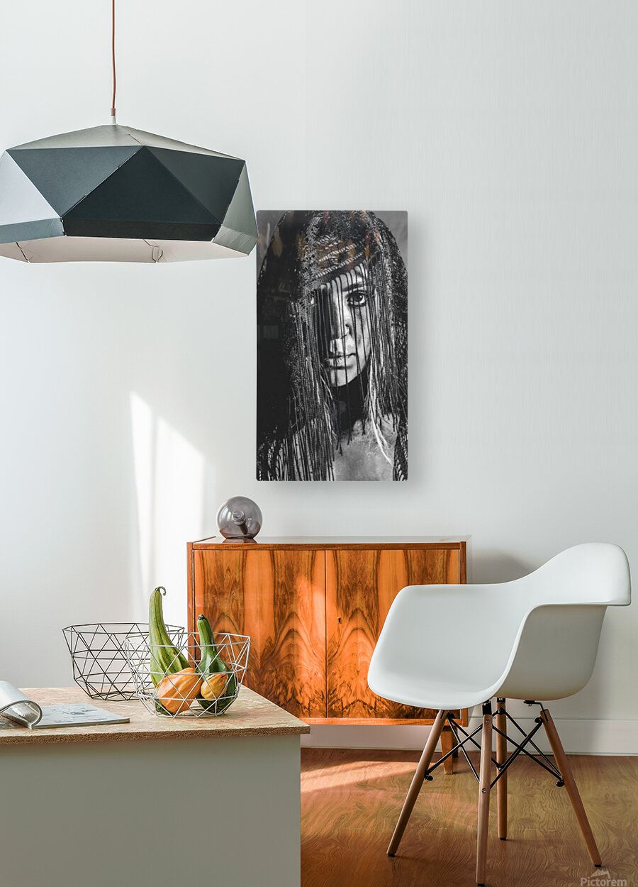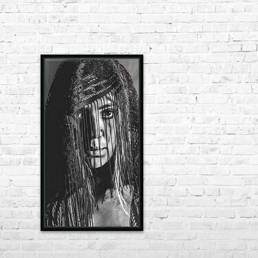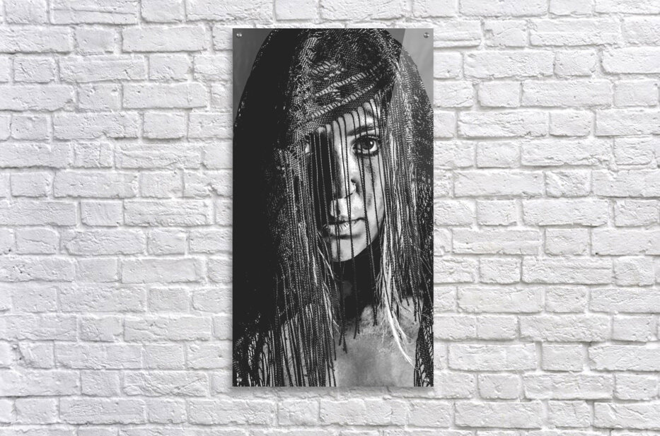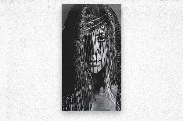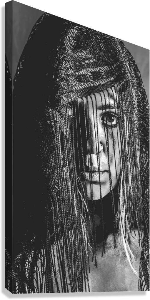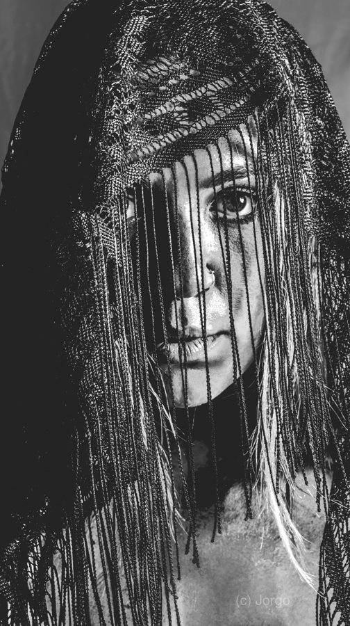 Dramatic black and white head-shot on a beautiful veiled gypsy woman deep in focus while obscured in clarity