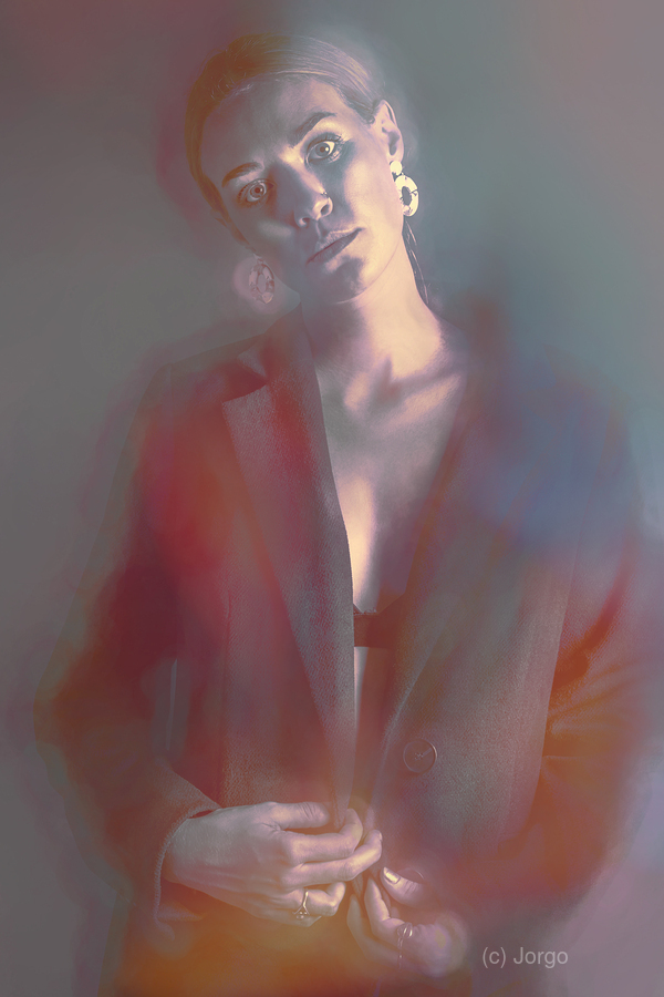A creative soft and dreamy fashion portrait of a confident woman dressed in a chic blazer emanating elegance in blurs of retro pop art
