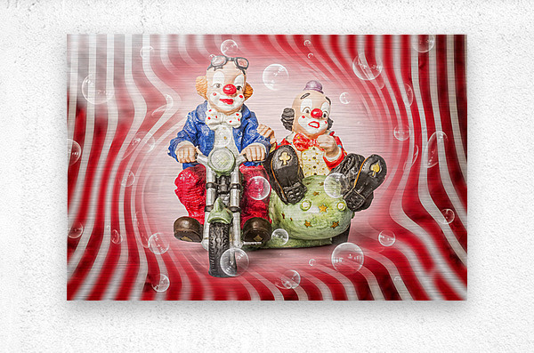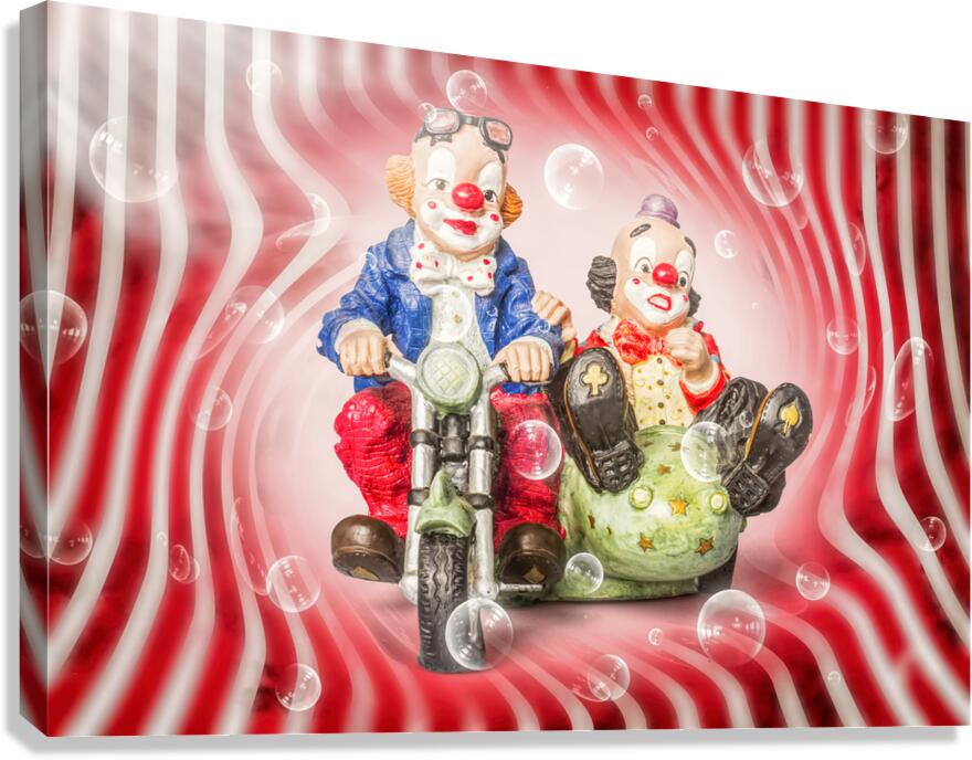 A artistic swirl of illusory acts as carnival clowns ride on a sidecar motorcycle breaking through warped carni-veil phantasy