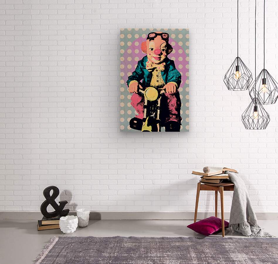 Retro pop art clown riding bike on a circular scene of amusive entertainment