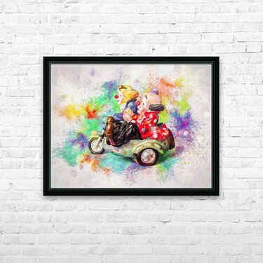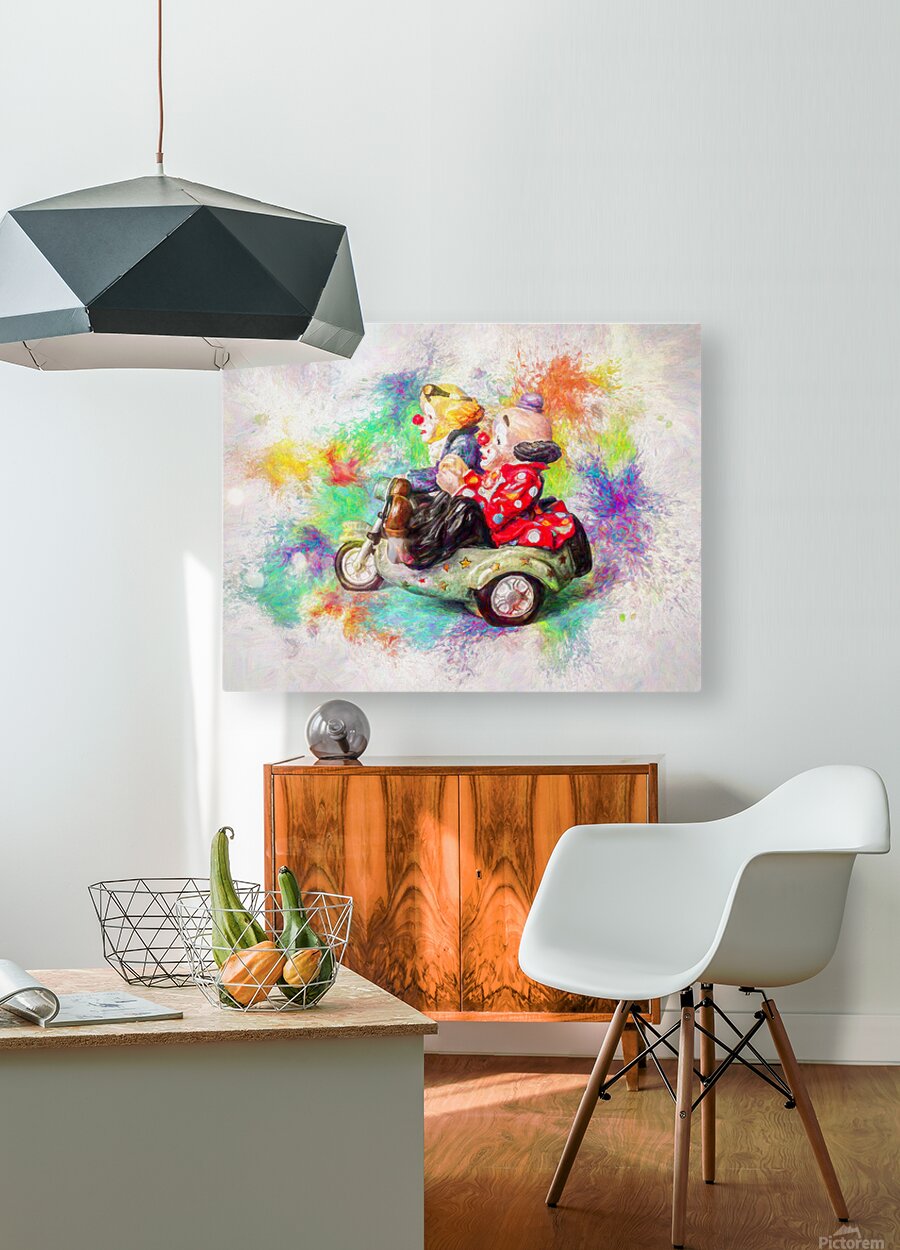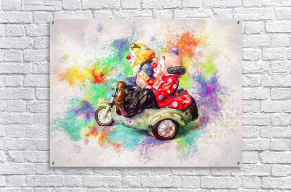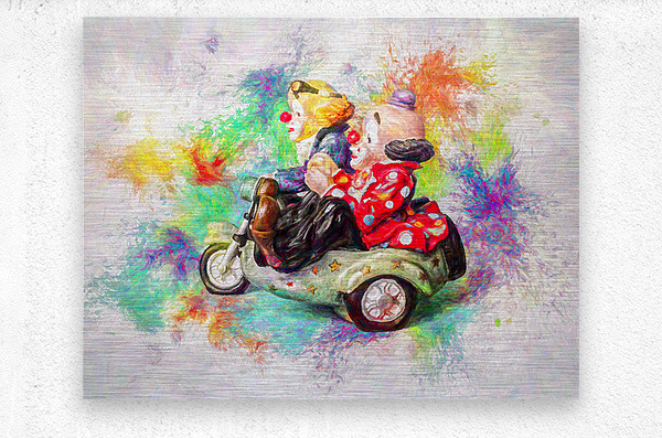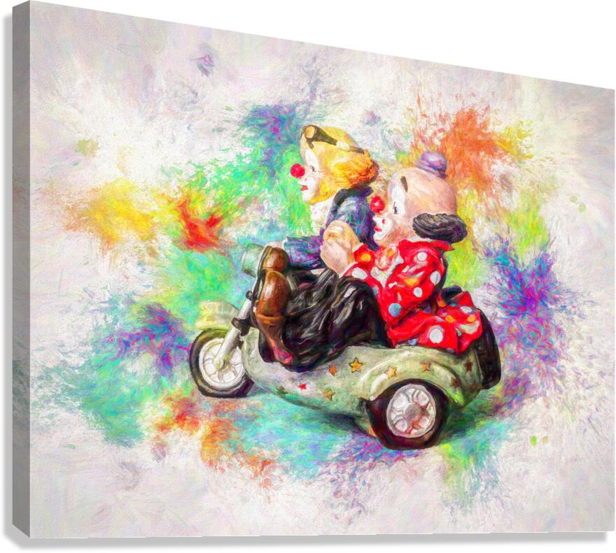 Painterly portrayal of circus foolery as a pair of clowns ride sidecar in colors of carnival creativity