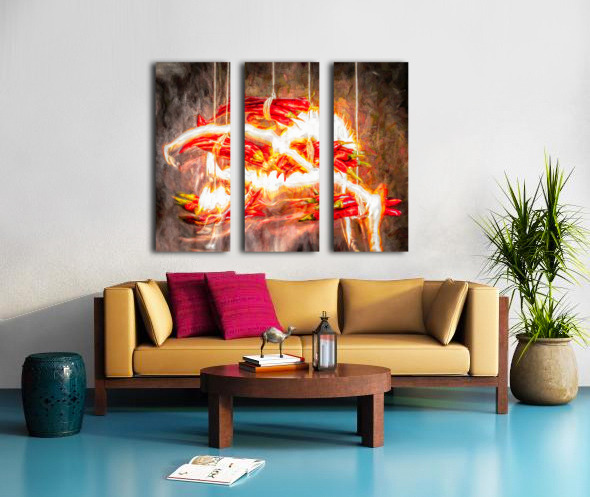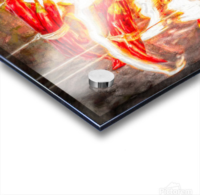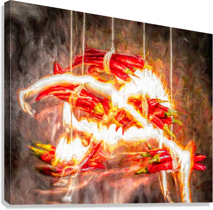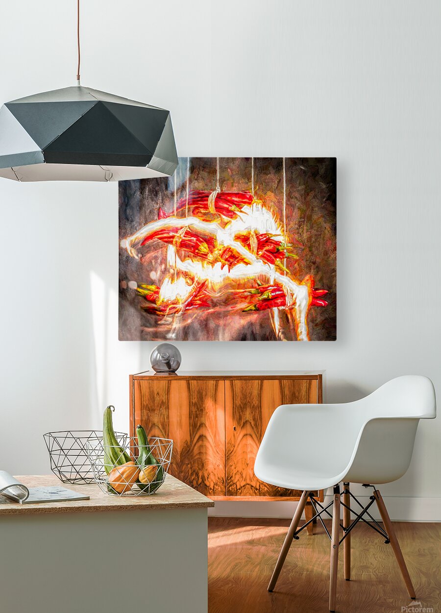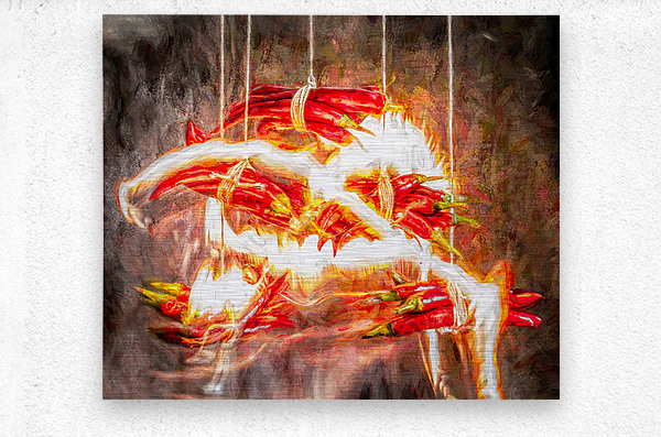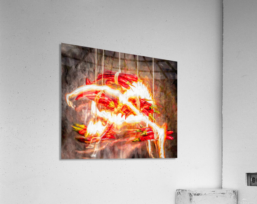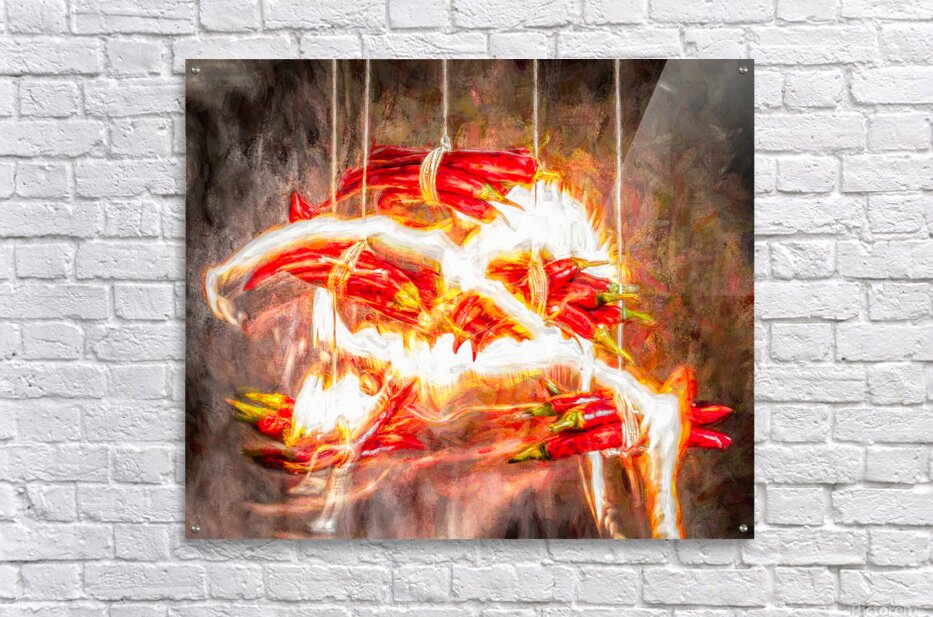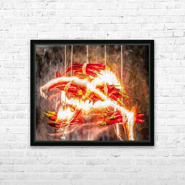 Hot BBQ n grill showcased in a fiery burning oil painting showing strung up chillies over an open restaurant fire