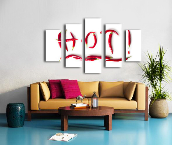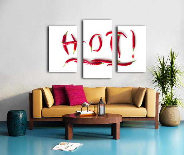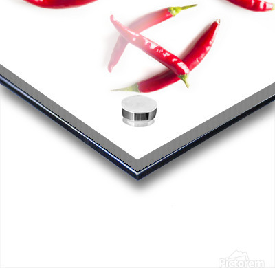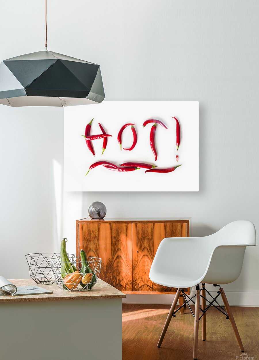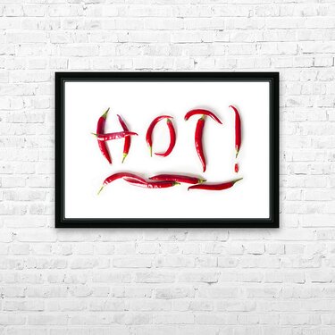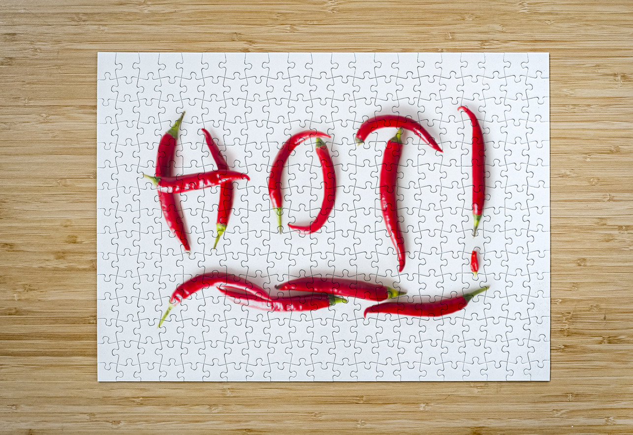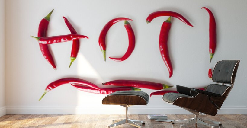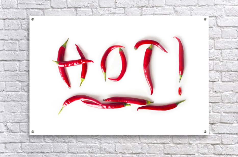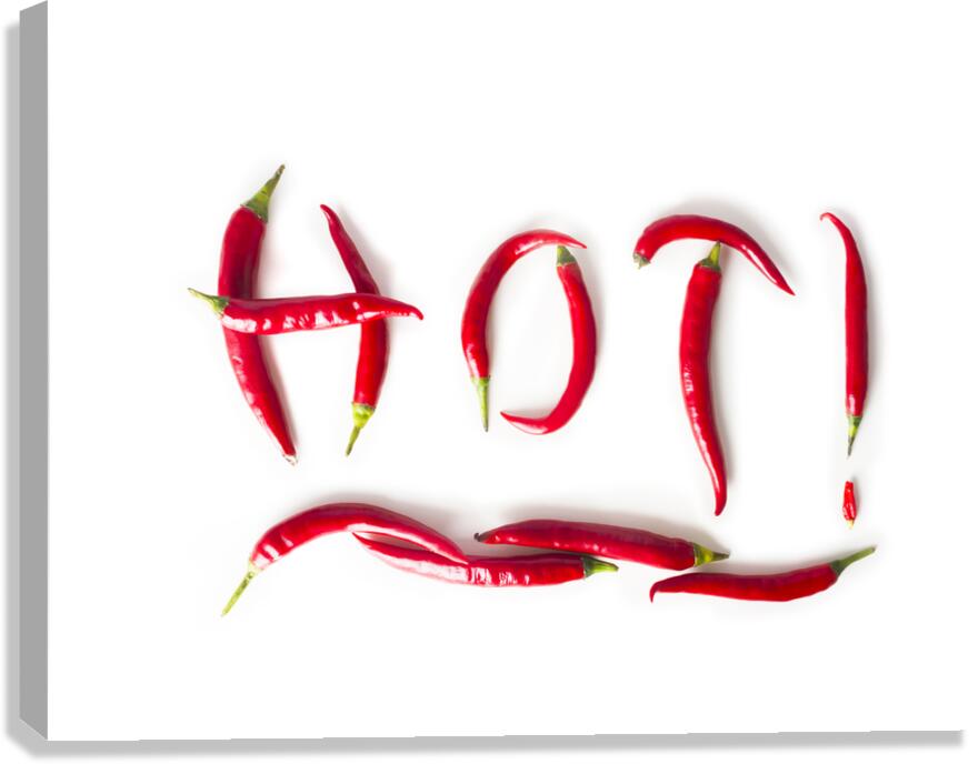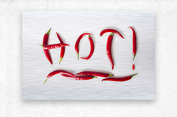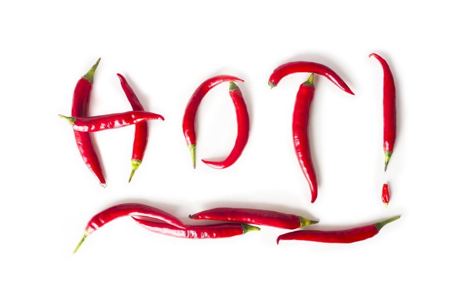 Red hot chilli peppers spelling out a spicy scene of red hot! heat on white background